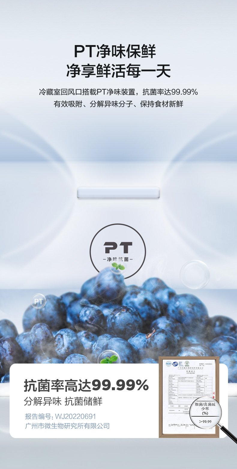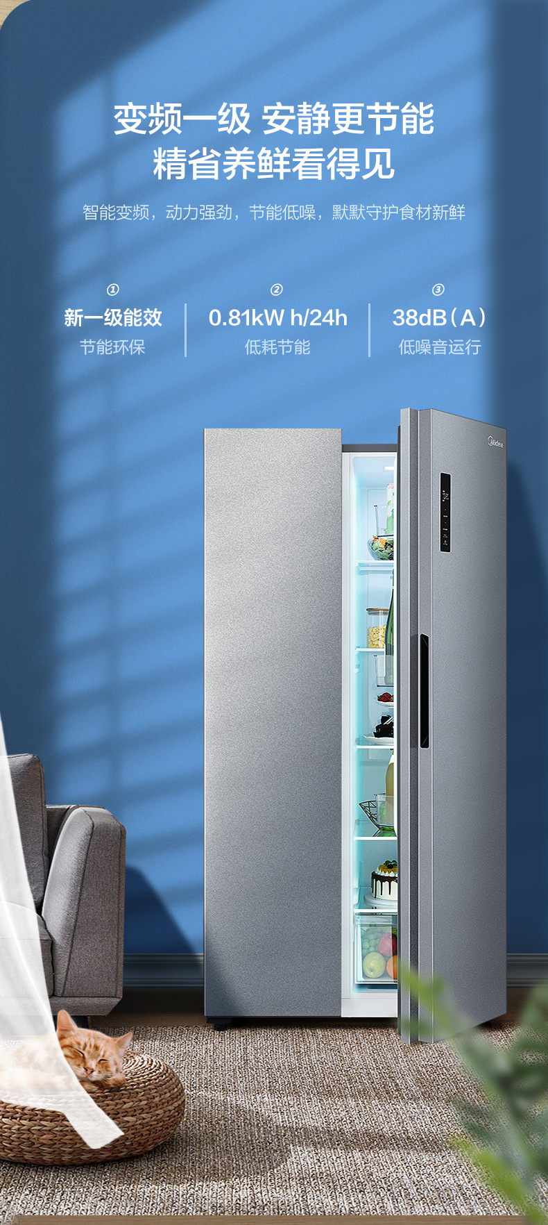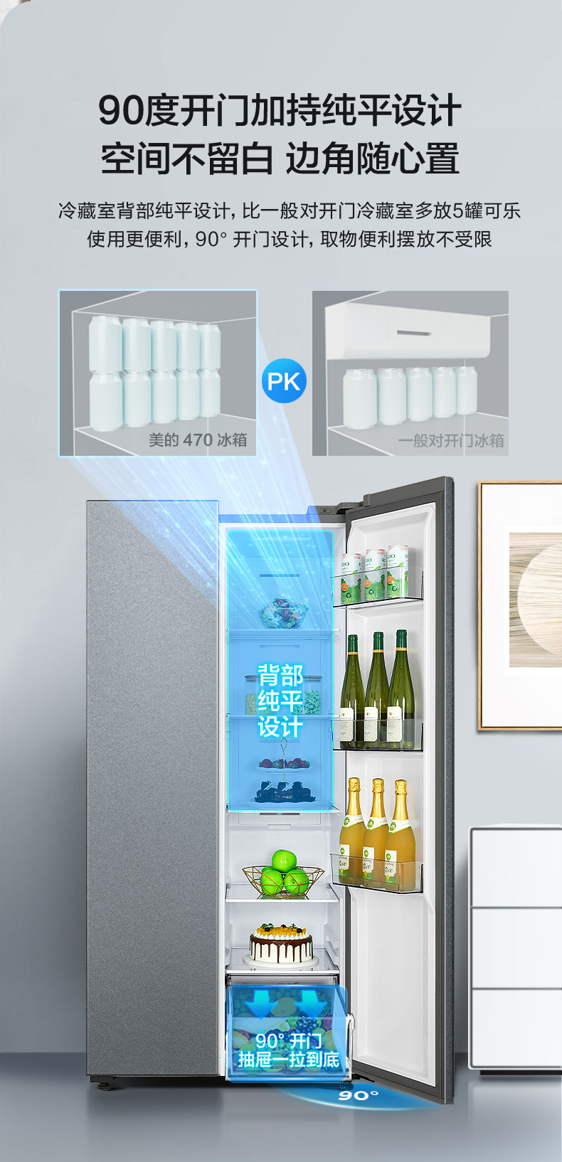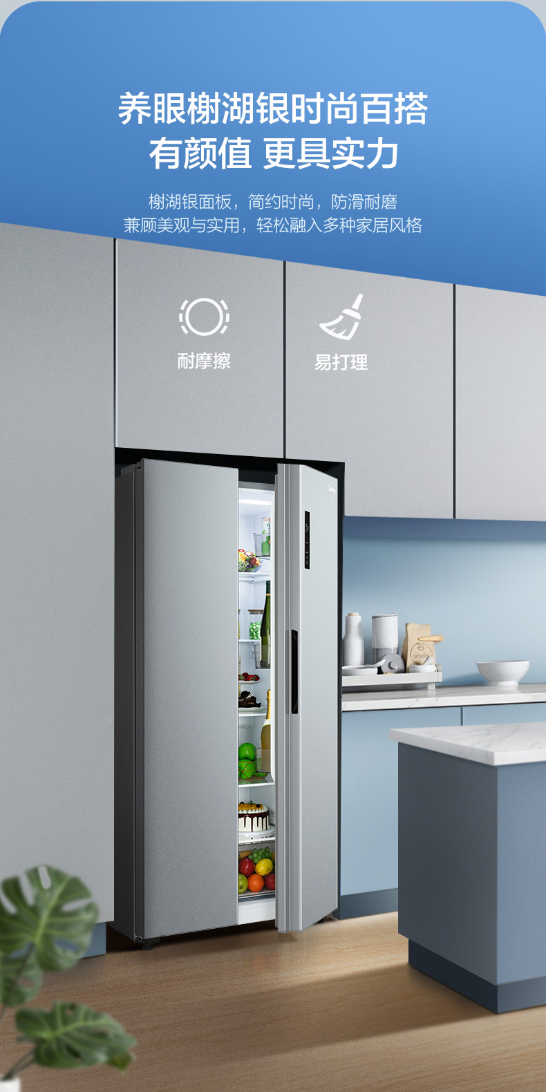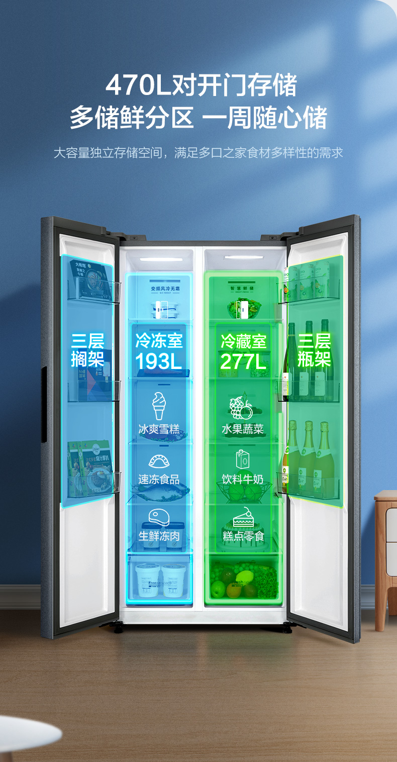 美的520升墨兰灰一级净味冰箱大容量变频节能低音省电
