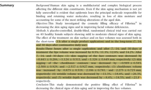 不需要注射仅通过涂抹,就能达到这样的效果。产品一出市就在欧美风靡,获得好多大奖。包括美容皮肤病学杂志,也曾经刊登过这篇篇Fillerina产品的研究报告。