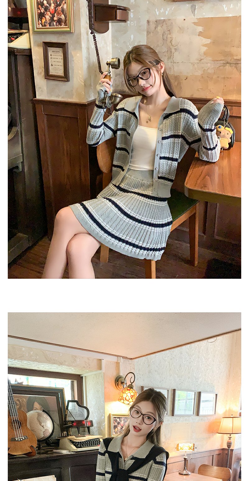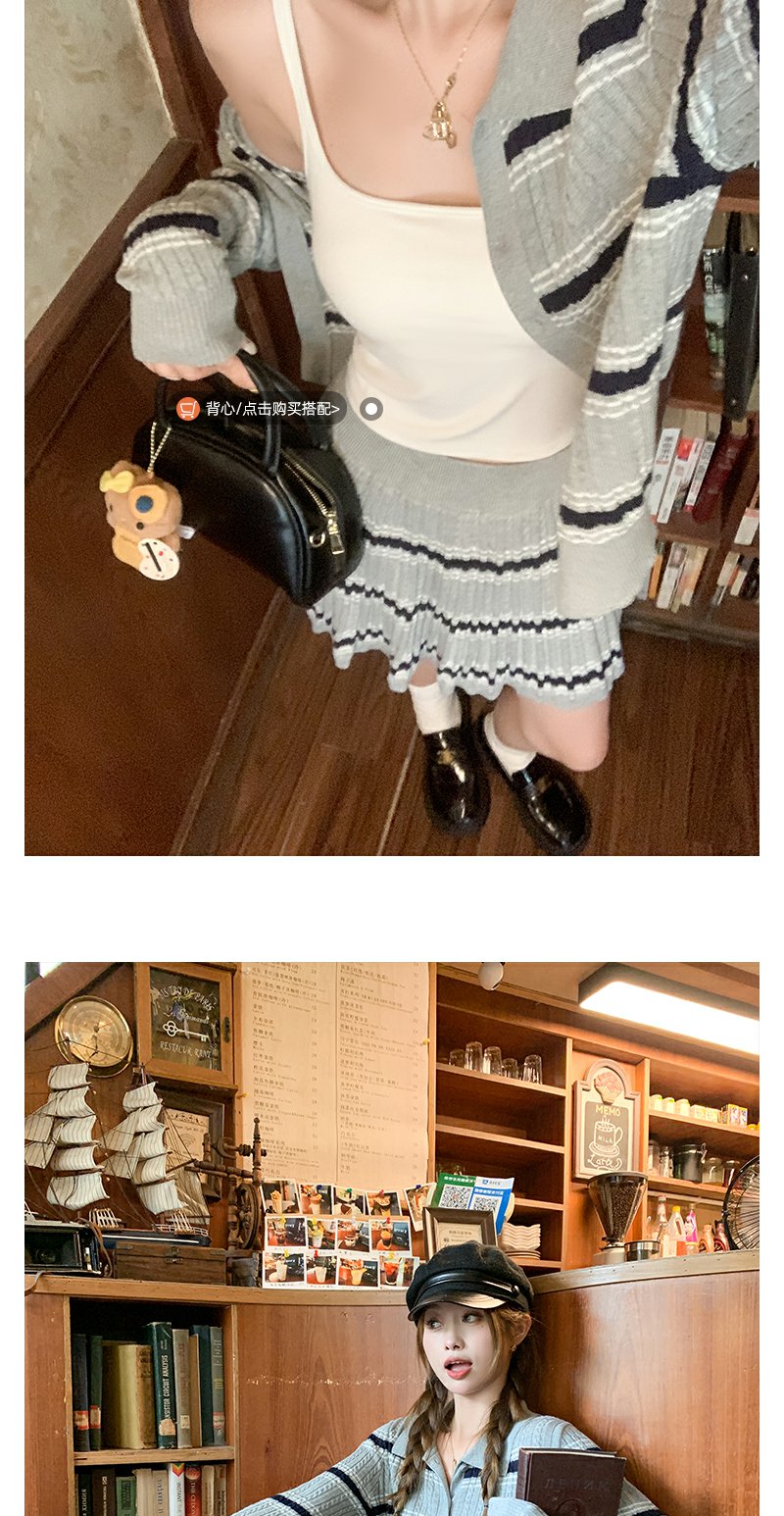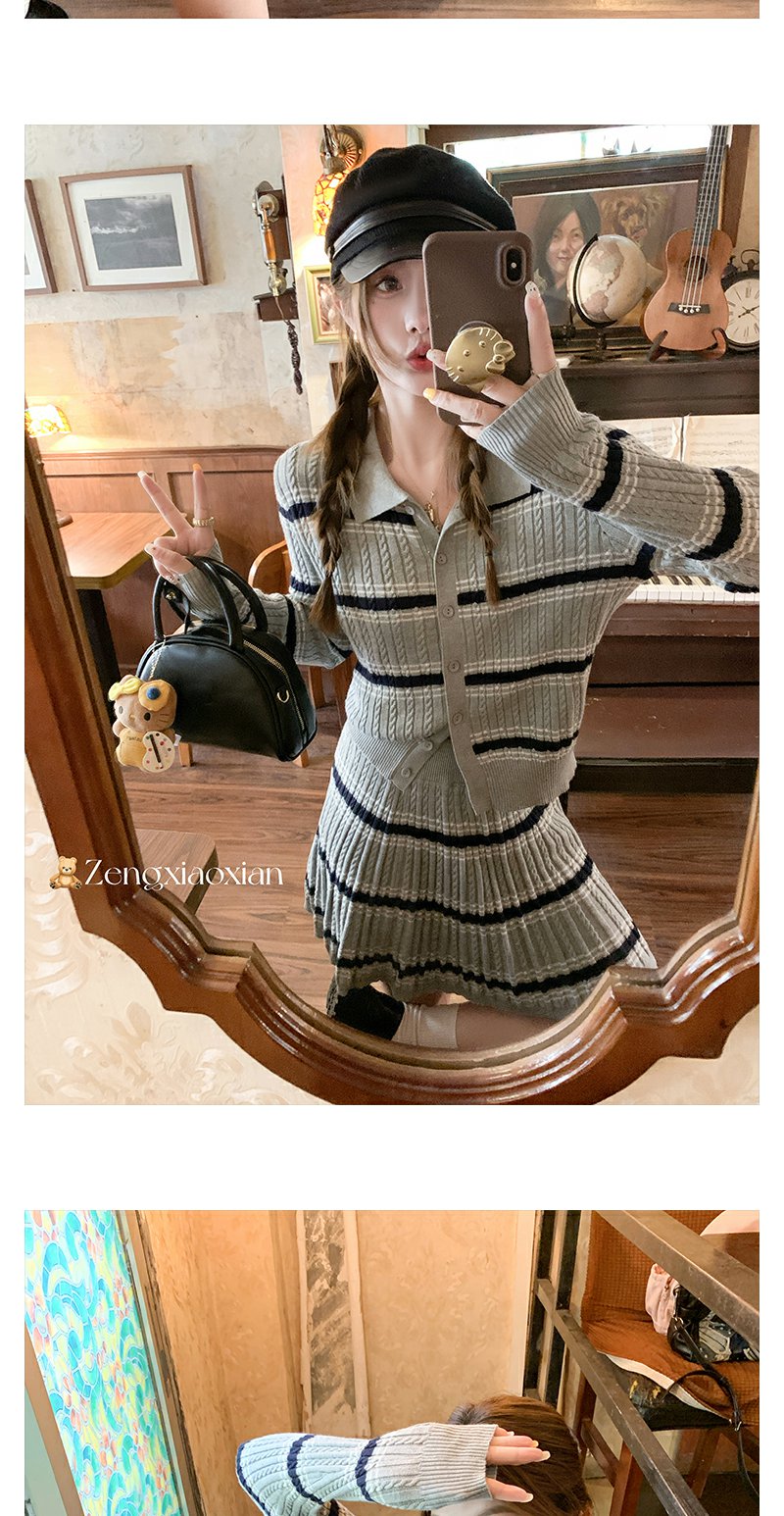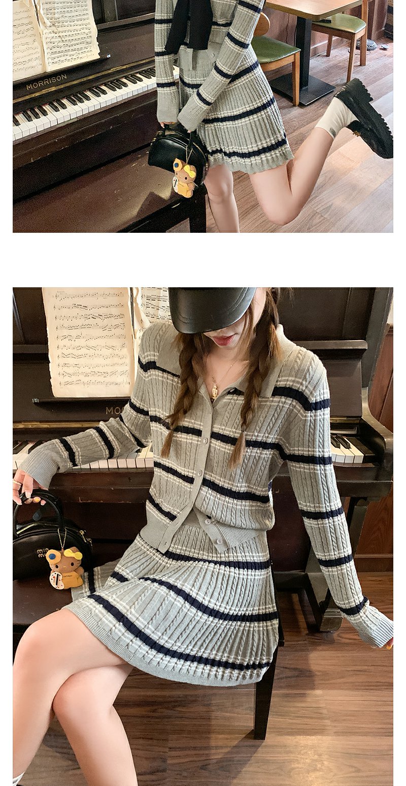 <曾小咸推荐>现货秒杀!微信超特价!翻领条纹针织衫高腰百裙两件套装 日常299.99 立减130 秒杀169.99!