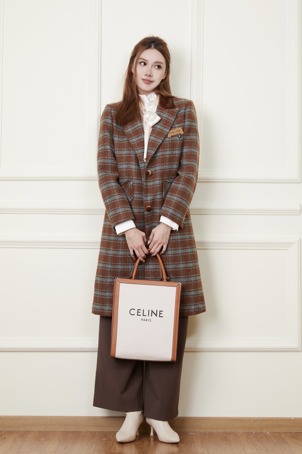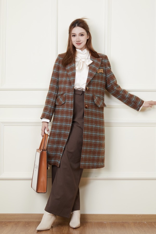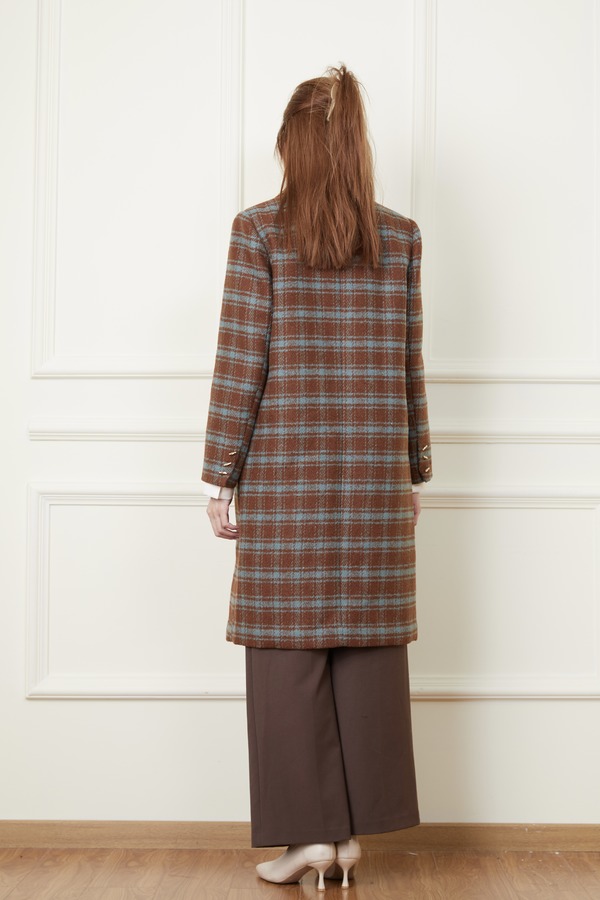 ESTELLICA 翻领学院棕色格纹拼接长大衣 19393