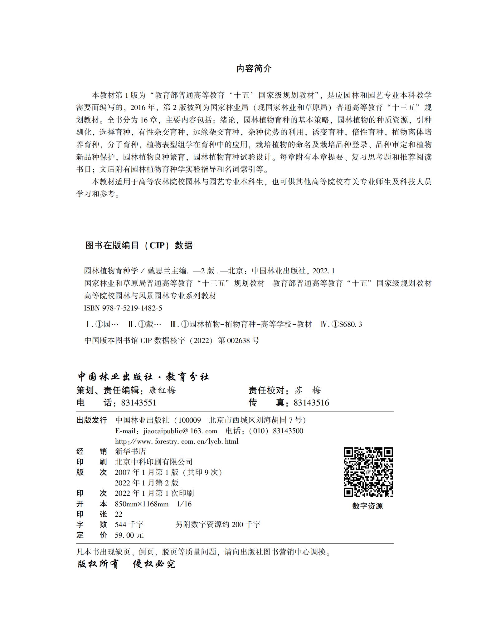 本教材第1版为“教育部普通高等教育‘十五’国家级规划教材”,是应园林和园艺专业本科教学需要而编写的,2016年,第2版被列为国家林业局(现国家林业和草原局)普通高等教育“十三五”规划教材。全书分为16章,主要内容包括:绪论,园林植物育种的基本策略,园林植物的种质资源,引种驯化.选择育种,有性杂交育种,远缘杂交育种,杂种优势的利用,诱变育种,倍性育种,植物离体培养育种,分子育种,植物表型组学在育种中的应用,栽培植物的命名及栽培品种登录、品种审定和植物新品种保护,园林植物良种繁育,园林植物育种试验设计。每章附有本章提要、复习思考题和推荐阅读书目:文后附有园林植物育种学实验指导和名词索引等。 本教材适用于高等农林院校园林与园艺专业本科生,也可供其他高等院校有关专业师生及科技人员学习和参考。