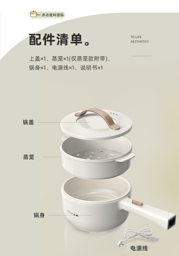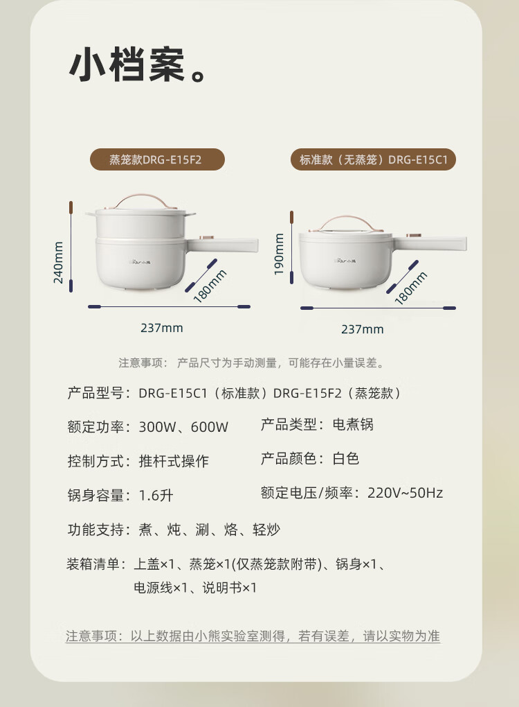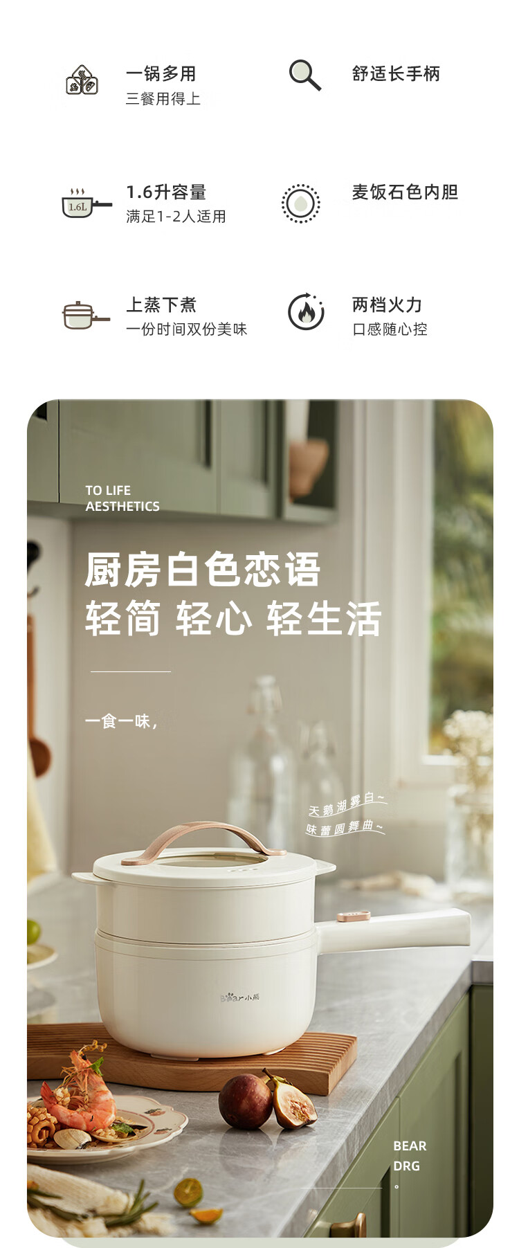 小熊(Bear)多功能锅电热锅1.6L电煮锅小电锅宿舍小锅泡面锅电火锅 DRG-E15F2 带蒸笼