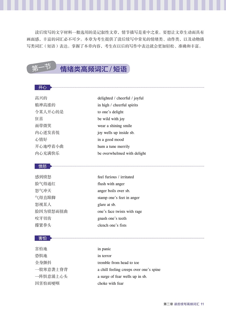 全书分为七个部分,即考情分析、高频词汇、高频语法、高频句子、篇章解读、真题解读和篇章训练。本书先从宏观上介绍高考对读后续写的考查情况,包括篇章体裁、考查角度、评分标准等;再从微观上归纳、概括读后续写中常用的词汇、语法,并配以大量的句子翻译练习;*后根据篇章类型分类归纳续写思路,并提供9篇真题讲解以及28篇篇章训练。本书中的参考范文均提供全文翻译,方便考生学习和理解。