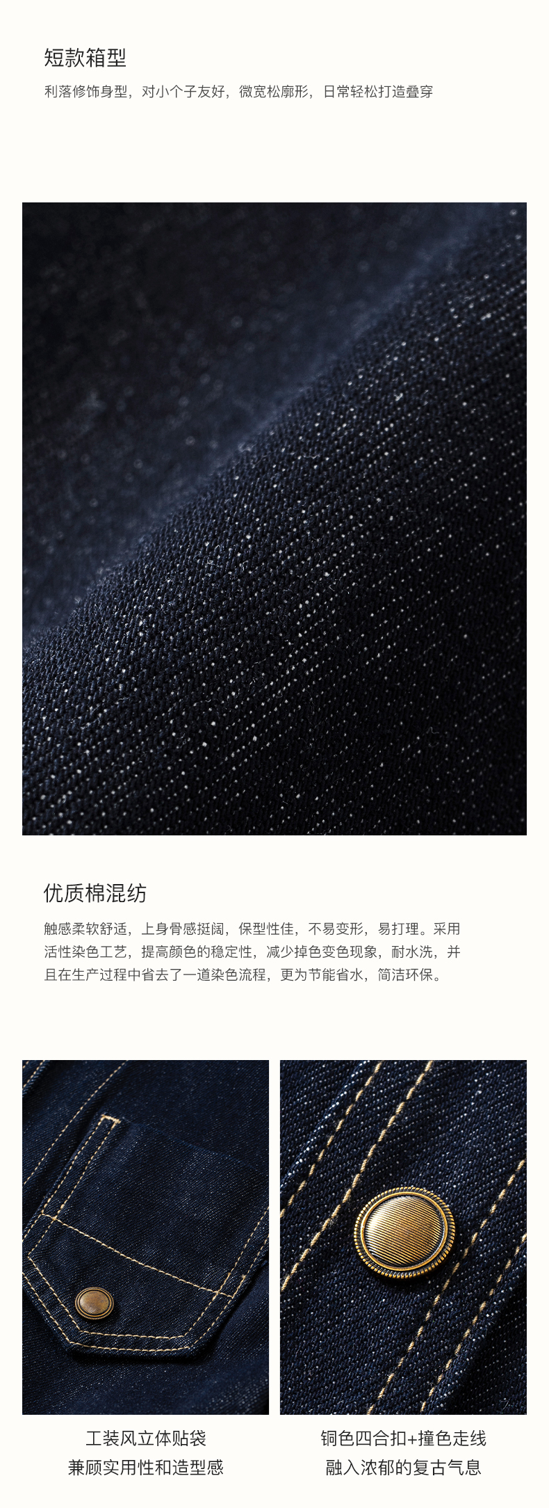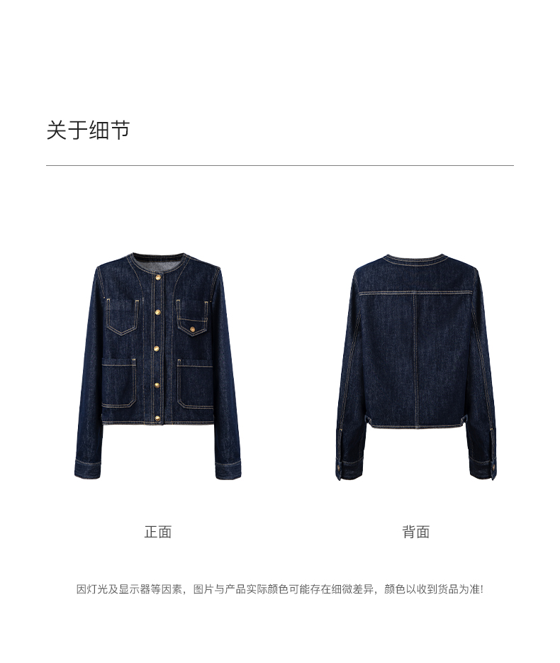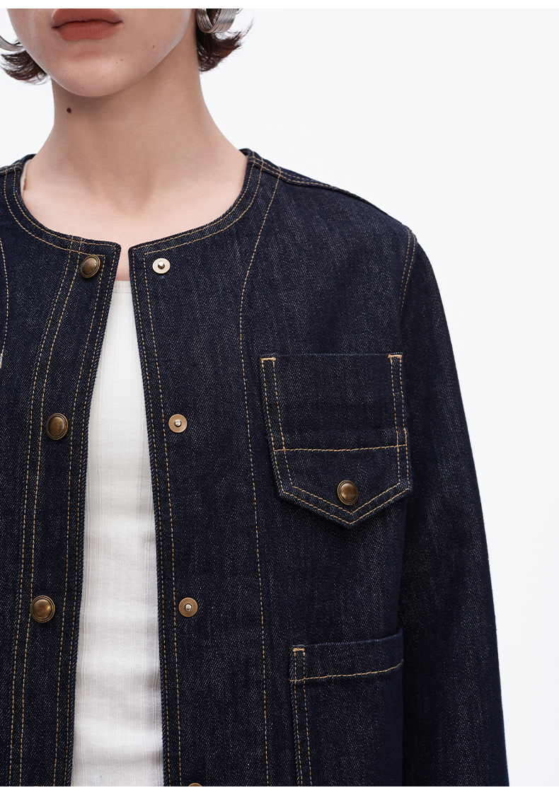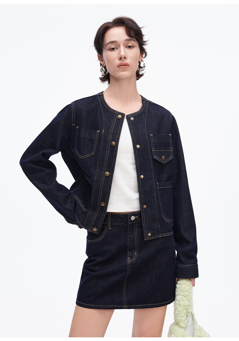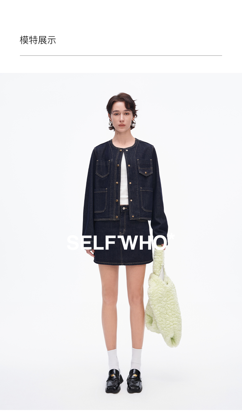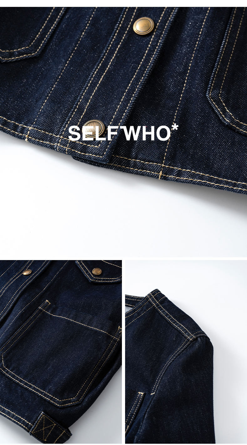 SELFWHO复古撞色线口袋牛仔外套女2025春季新款圆领箱型短款上衣