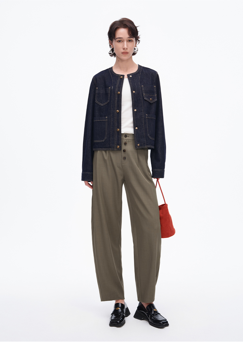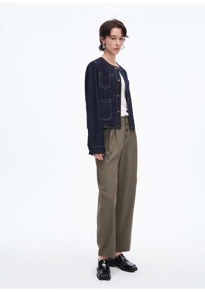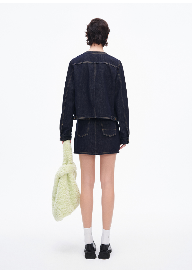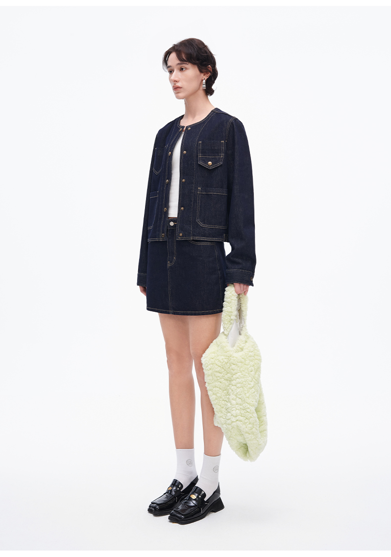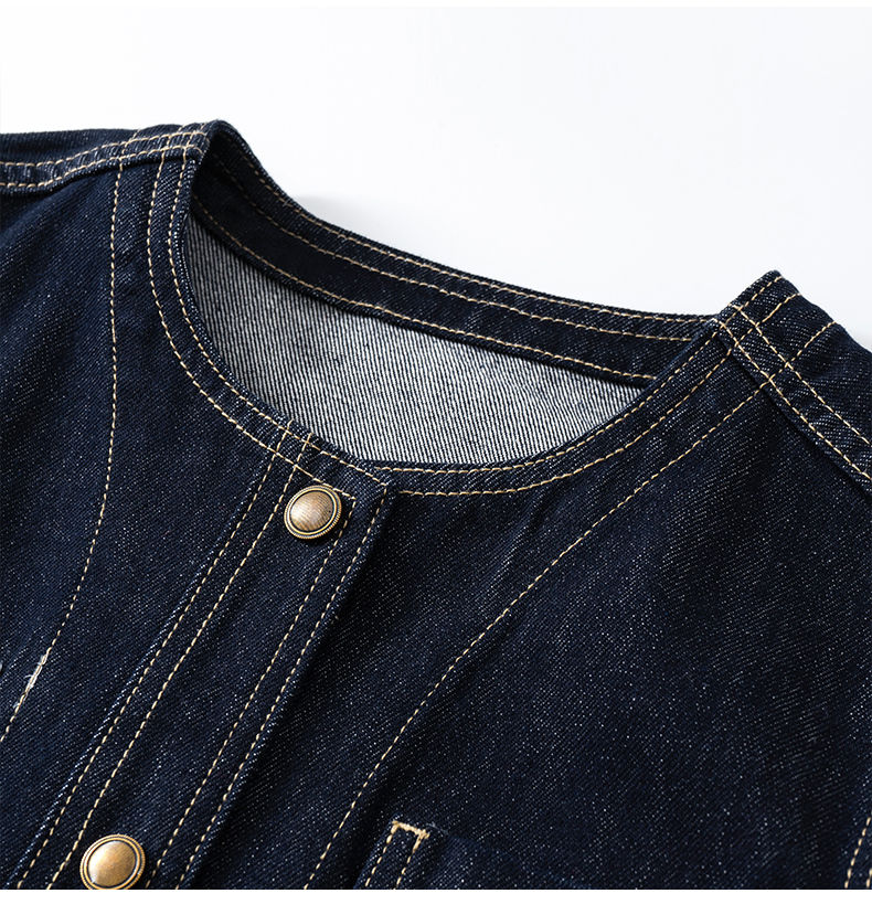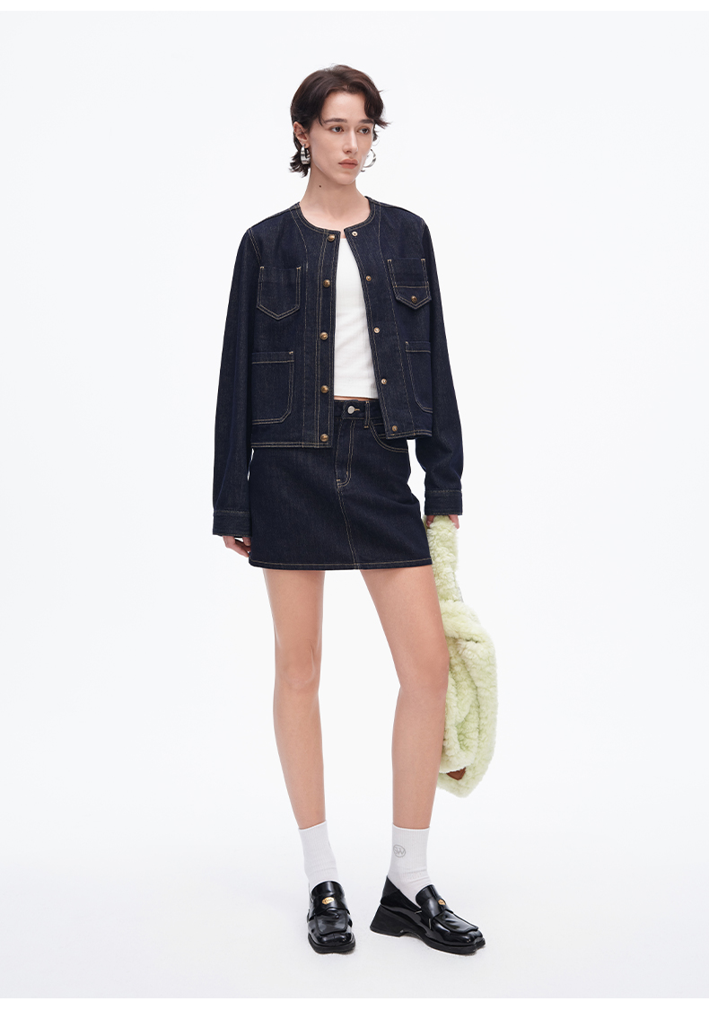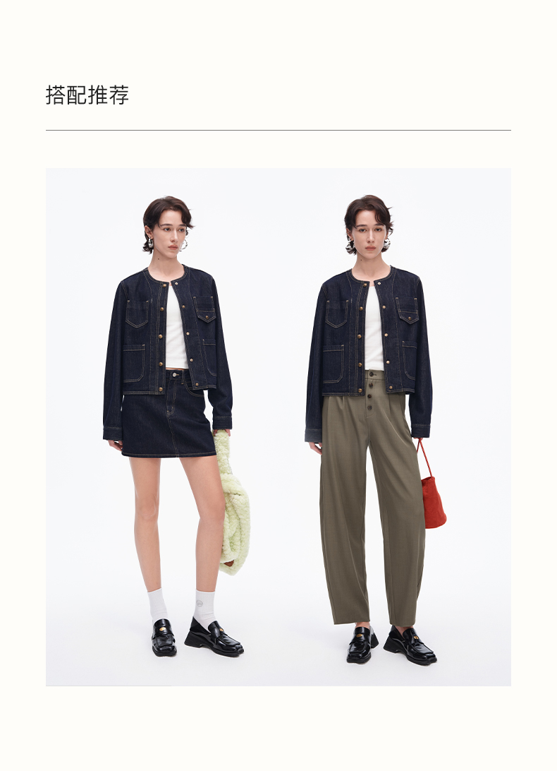 SELFWHO复古撞色线口袋牛仔外套女2025春季新款圆领箱型短款上衣
