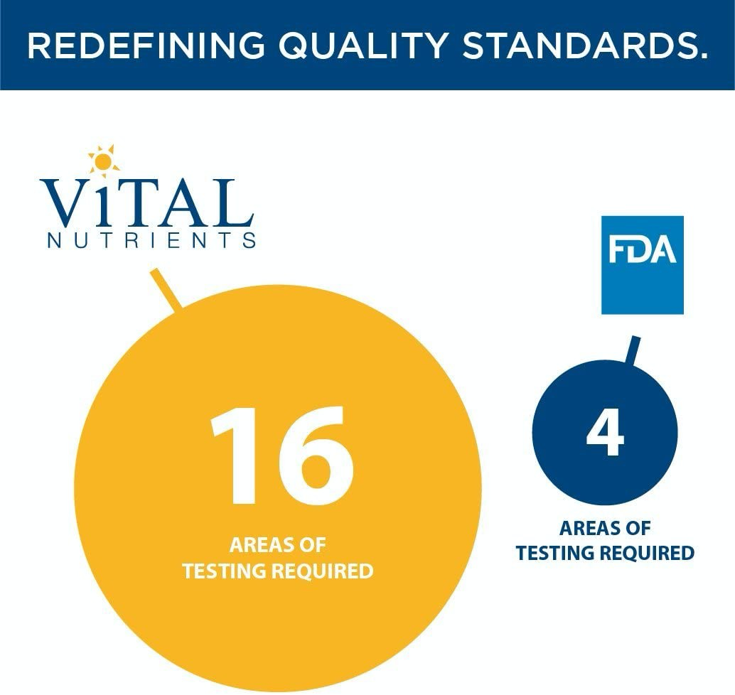 100%经过测试:我们测试使用的每种成分和制成的每种成品。 FDA法规(GMP第111部分)要求制造商测试成分和成品。 但是,它允许制造商执行最少的``跳过批次测试'',这意味着仅对某些成分进行了测试。 通过在独立认证的美国实验室对原料和制成品进行大量其他测试,Vital Nutrients始终超出了这些测试要求。