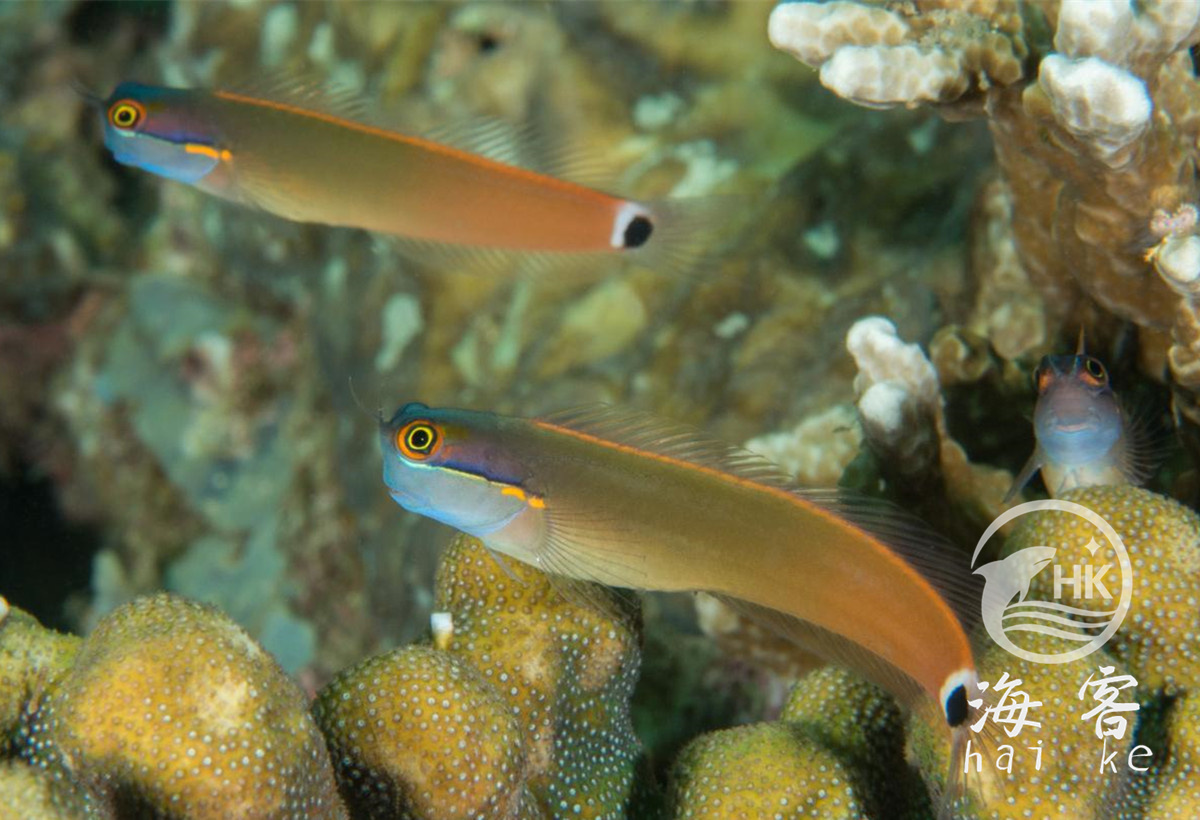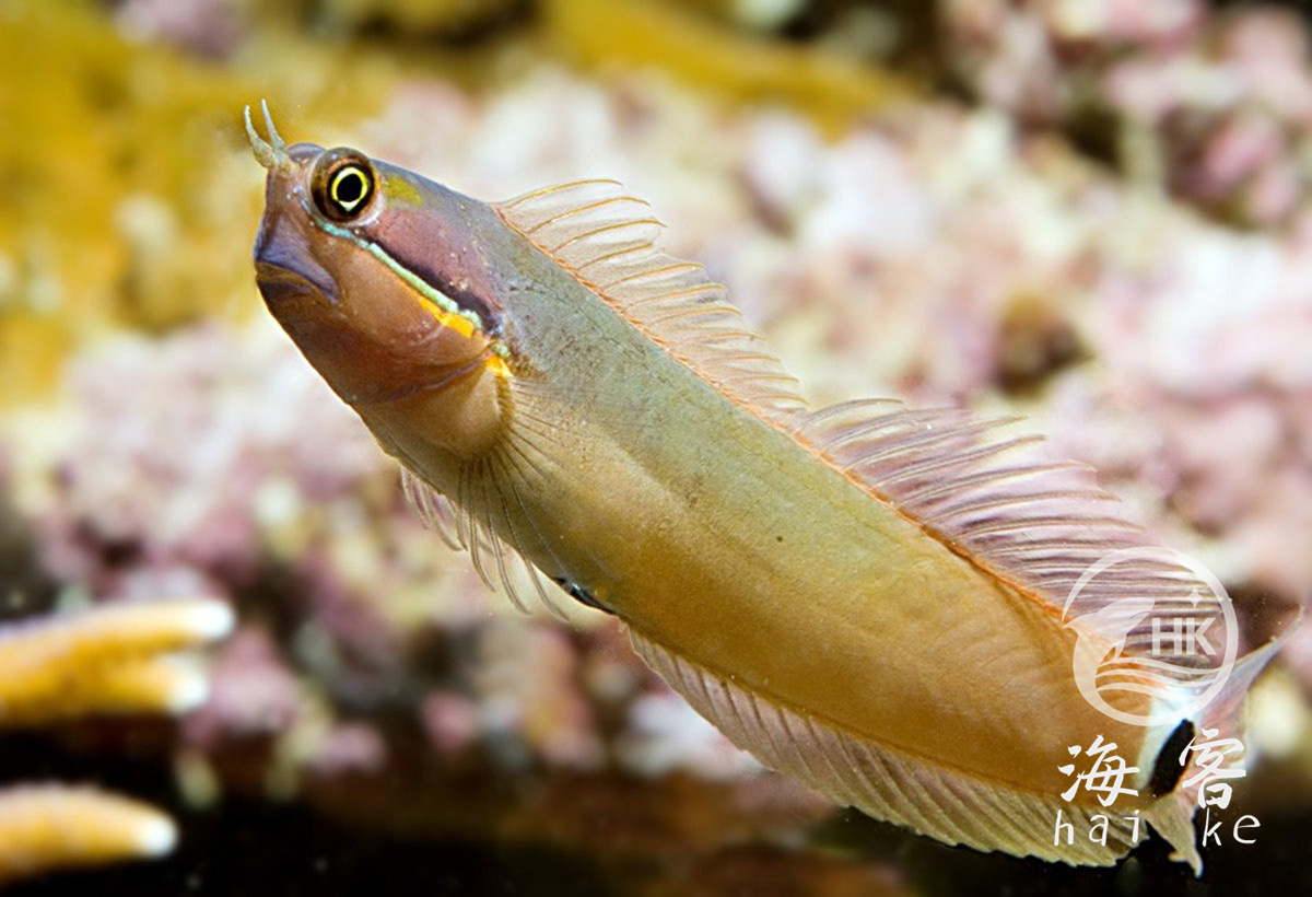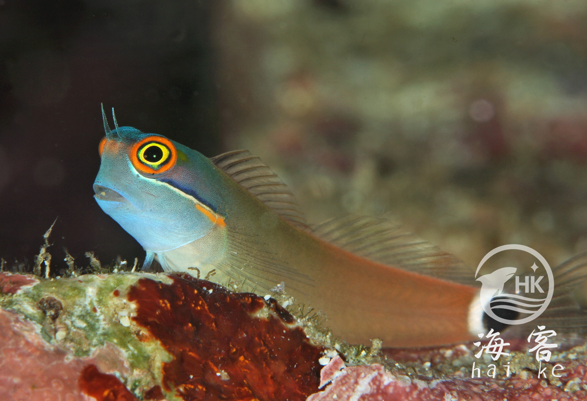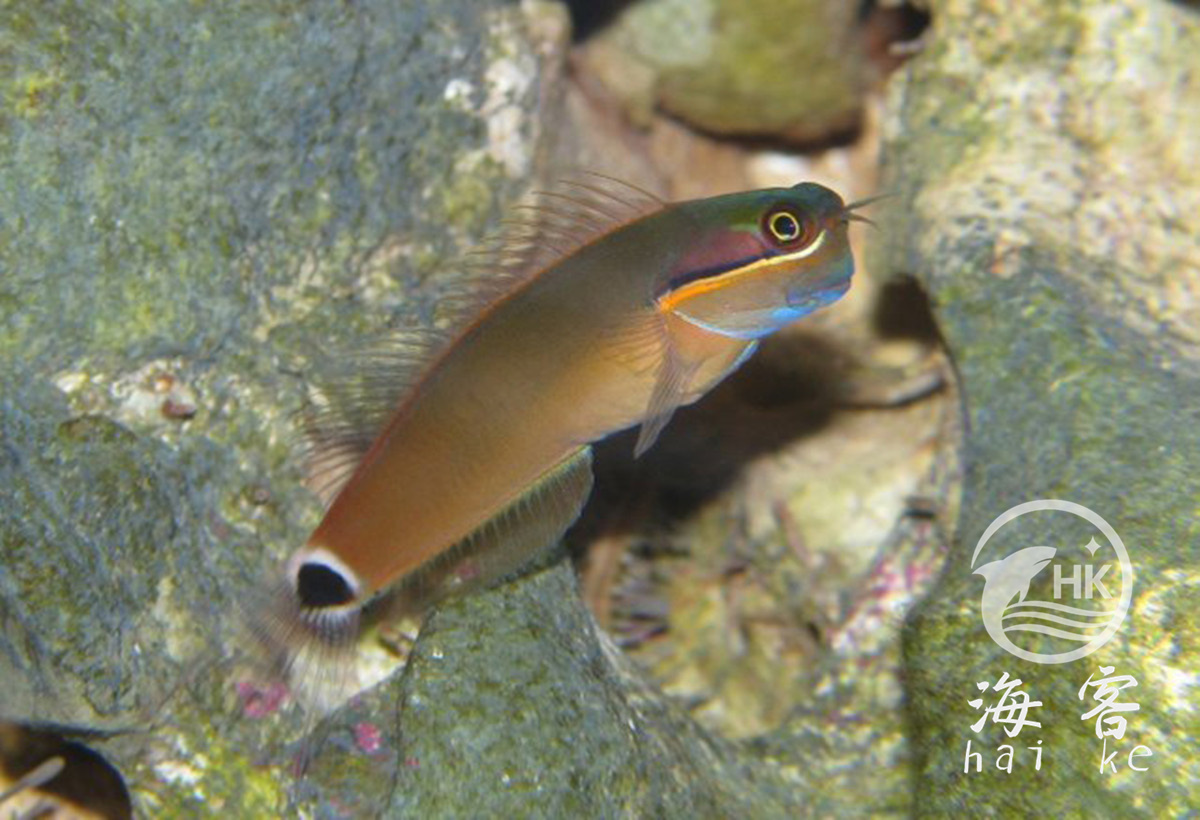 学名叫横带间颈须鳚,或点斑犁齿鳚,台湾俗名狗鲦,大陆俗称眼点虾虎、斑尾虾虎。比较明显的特征是尾巴上有一个黑点。眼部有黑色和黄色条纹穿过,可以用来迷惑敌人。体型小,眼睛大大的,看起来很有趣。