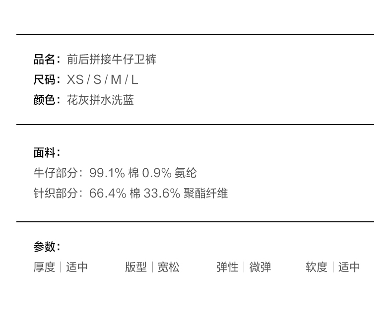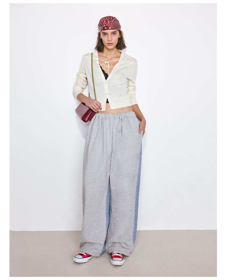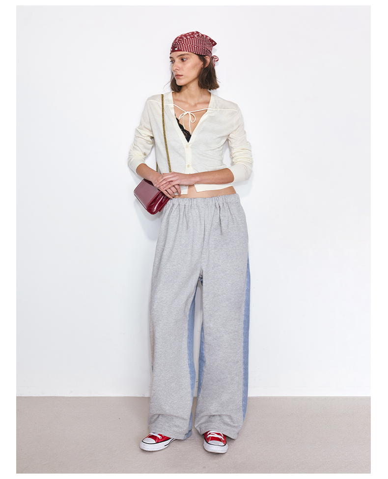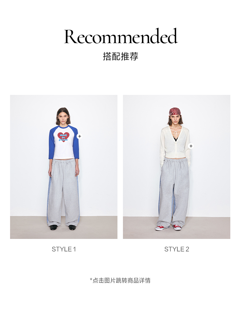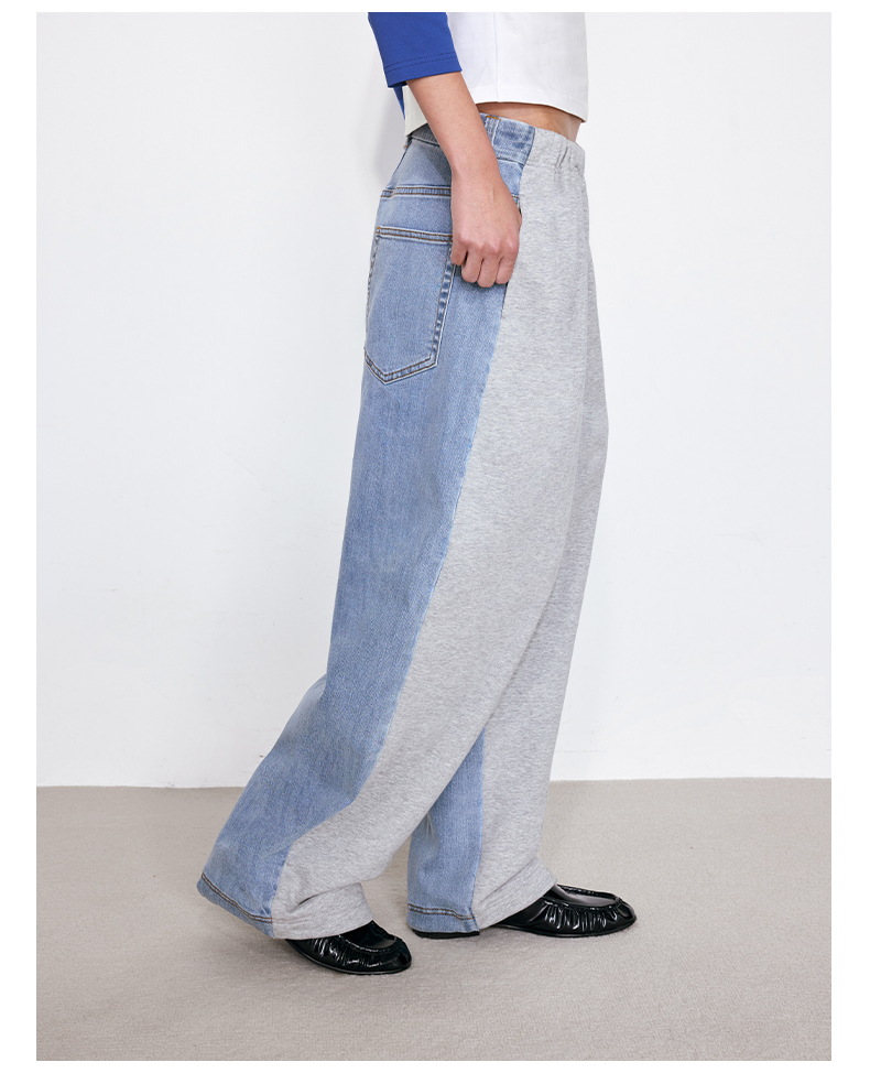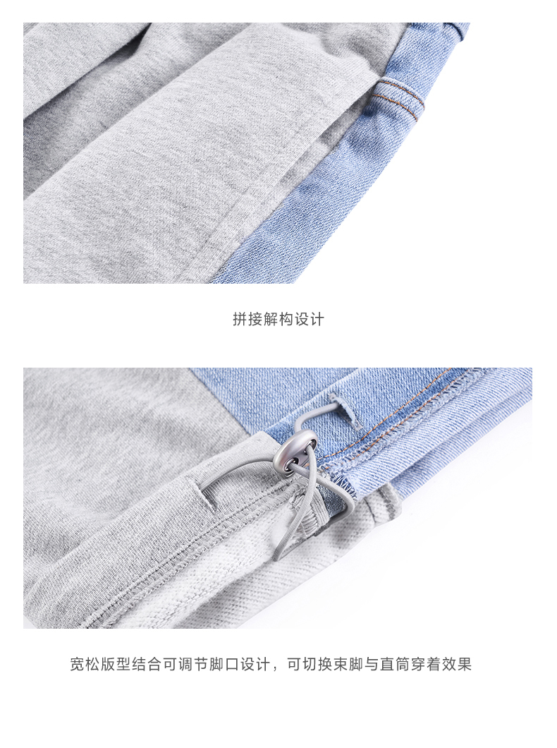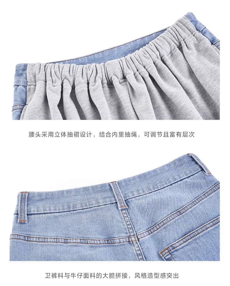 NUTH宽松牛仔拼接可束脚抽绳卫裤女 花灰拼水洗蓝