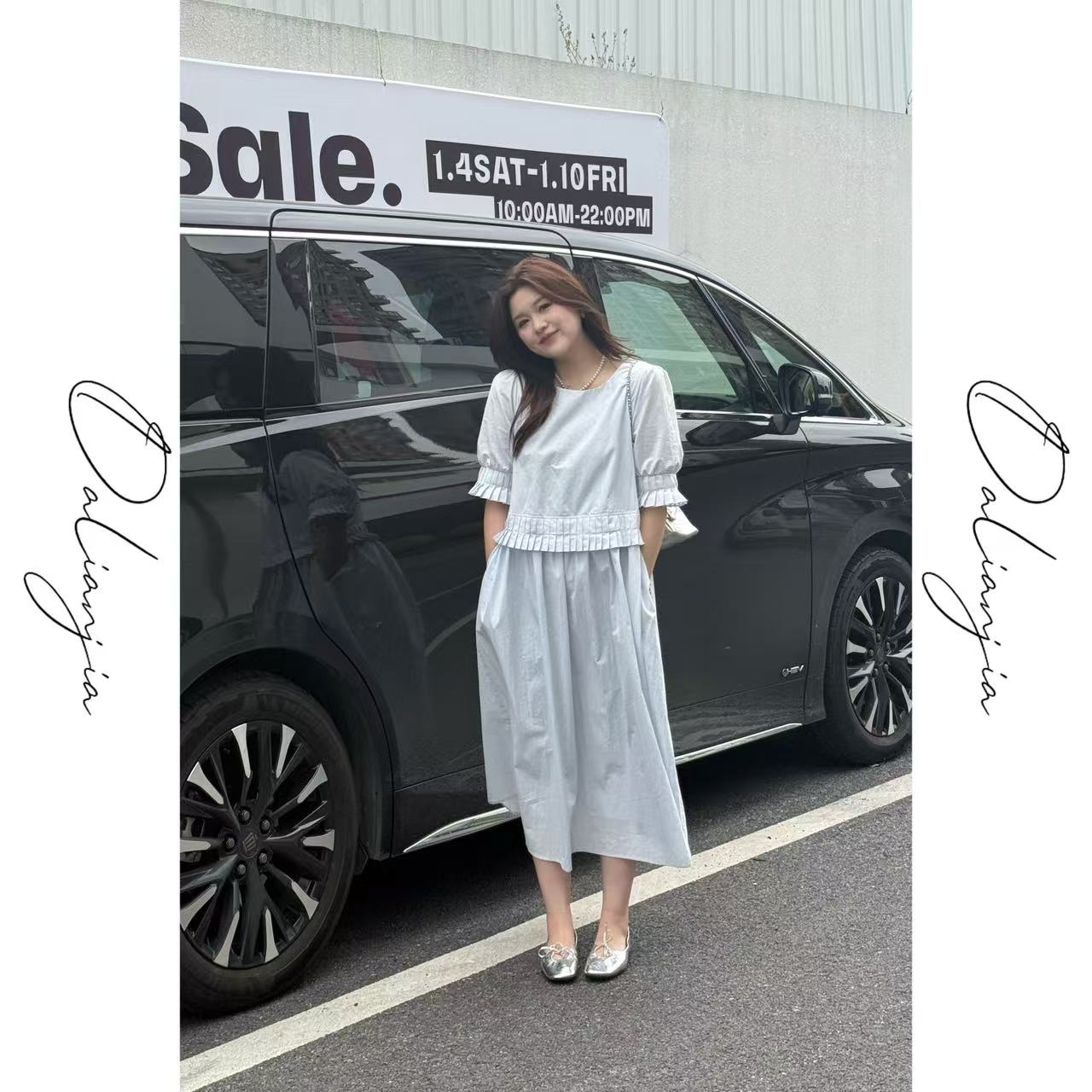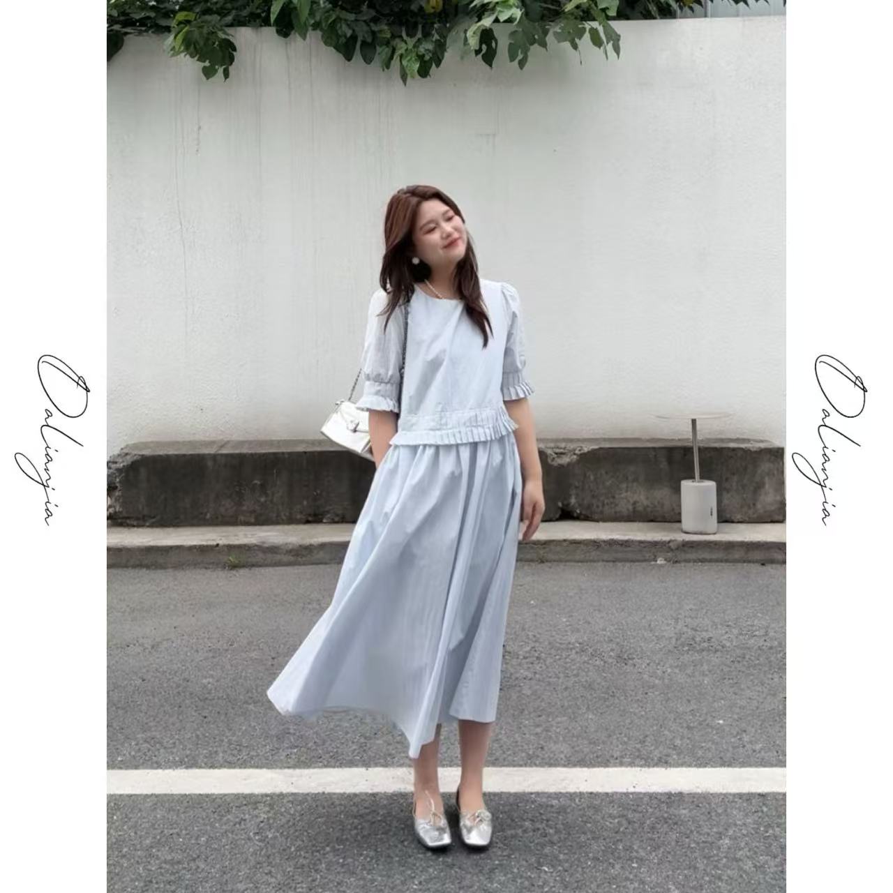2025新品 佳佳同款【淡雅铃兰】可爱褶皱设计圆领纯色连衣裙宽松法式遮肉