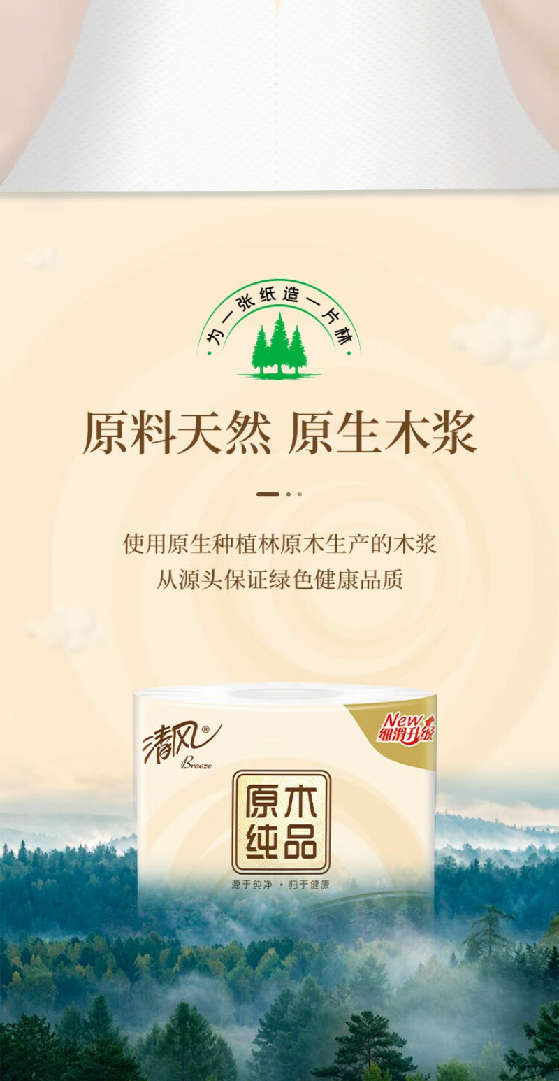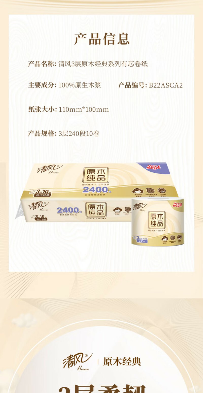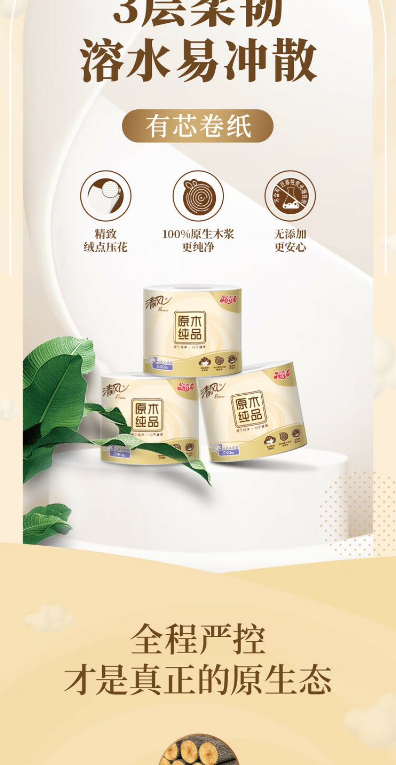 清风 原木纯品 有芯卷纸 3层240段10卷 家用卫生纸