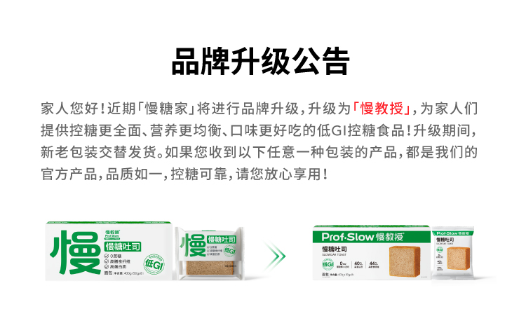- 「慢教授ProfSlow」(原慢糖家),专注于科学控糖的健康营养品牌。由2位浙大校友创立,联合全球优秀的食品科学家和健康营养专家,为有控糖需求的用户研发好吃、低升糖的健康食品和营养补充剂。