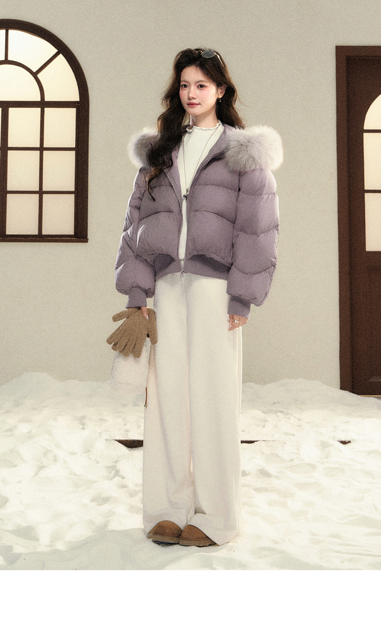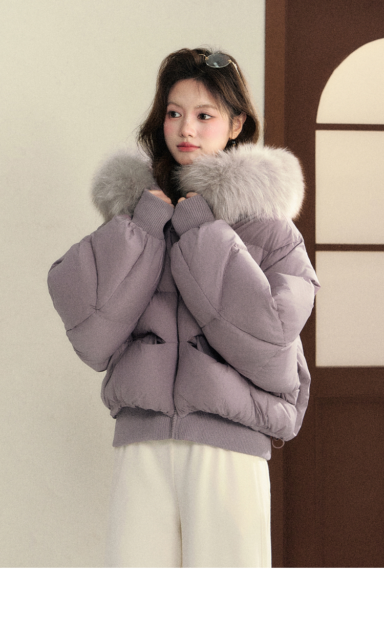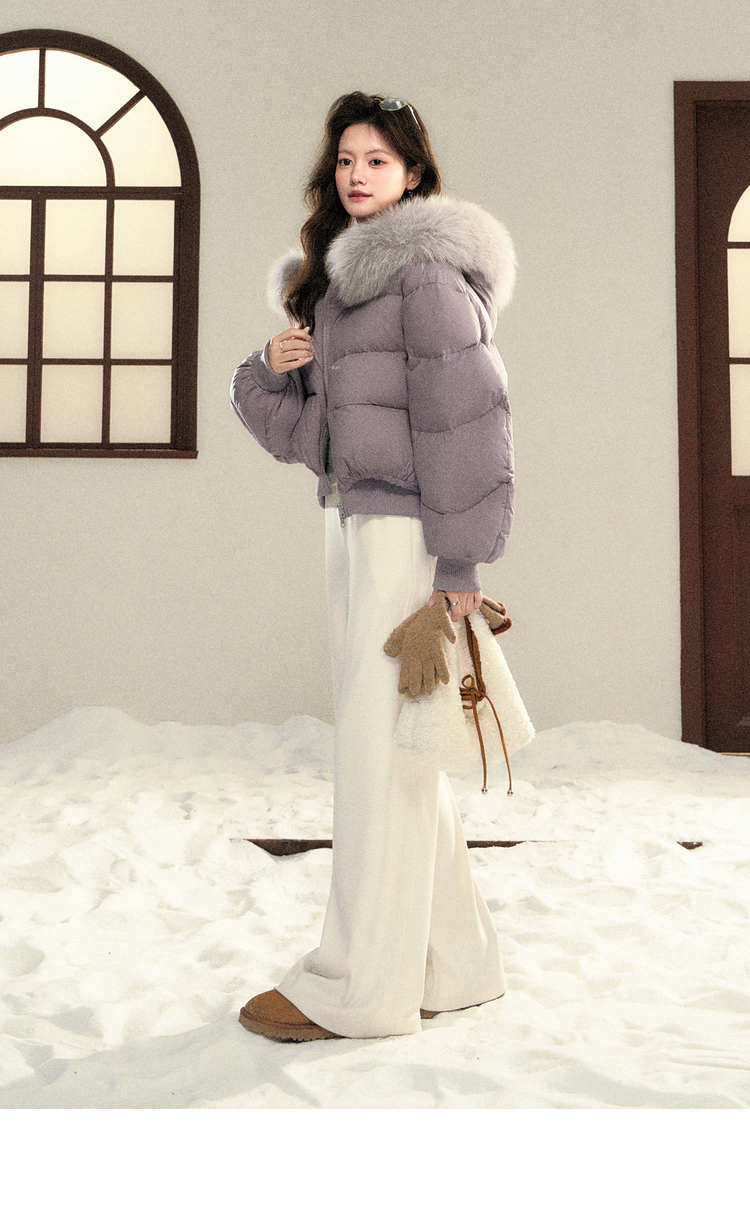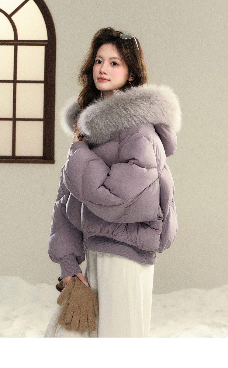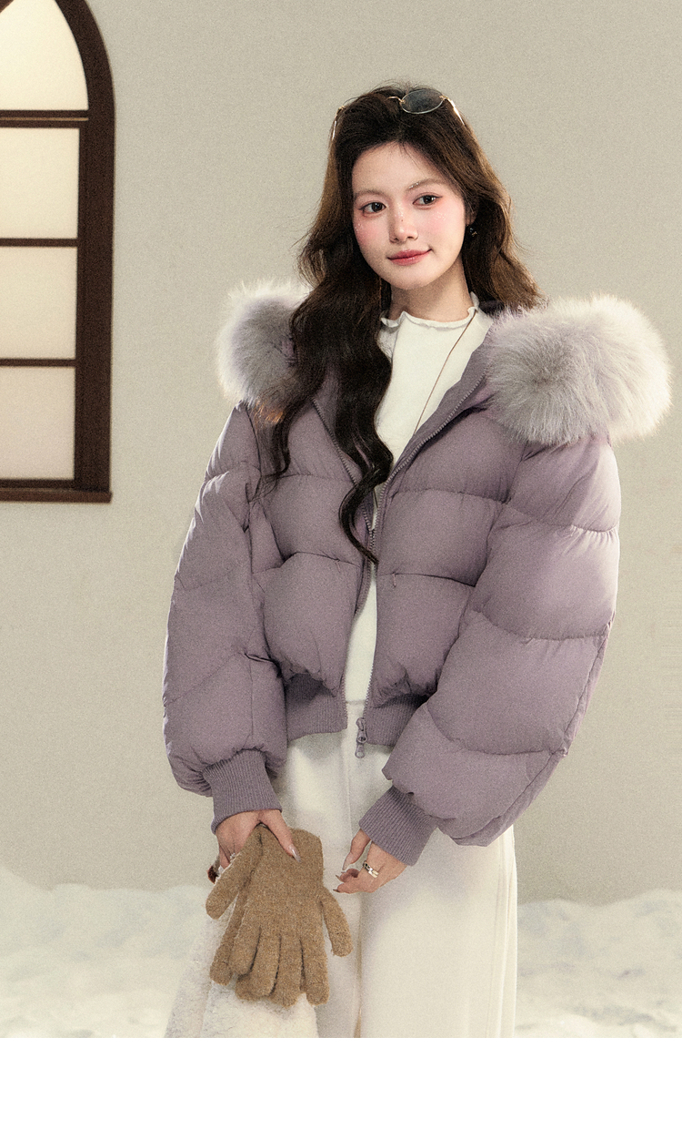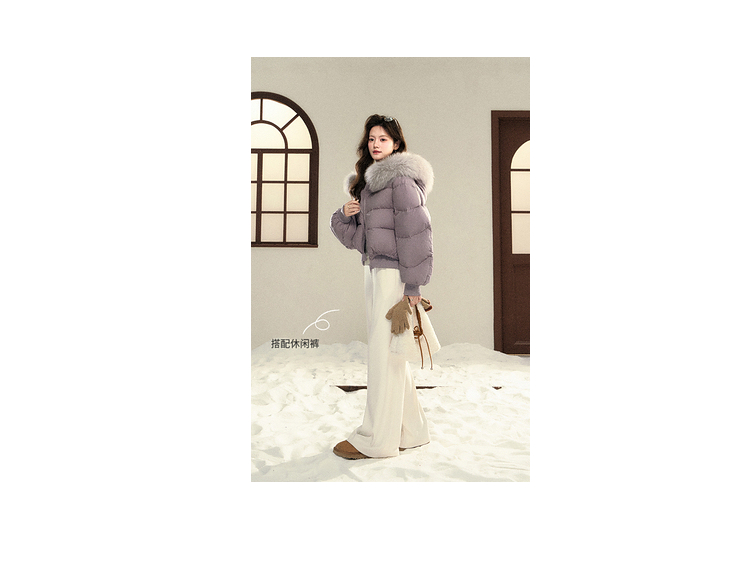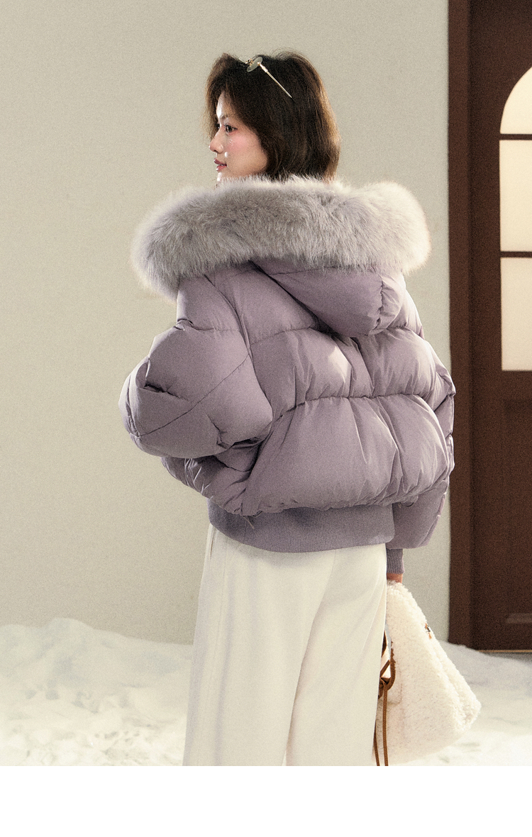 鹿向南「温暖小巷」90白鸭绒紫色毛领连帽羽绒服冬季加厚短外套女