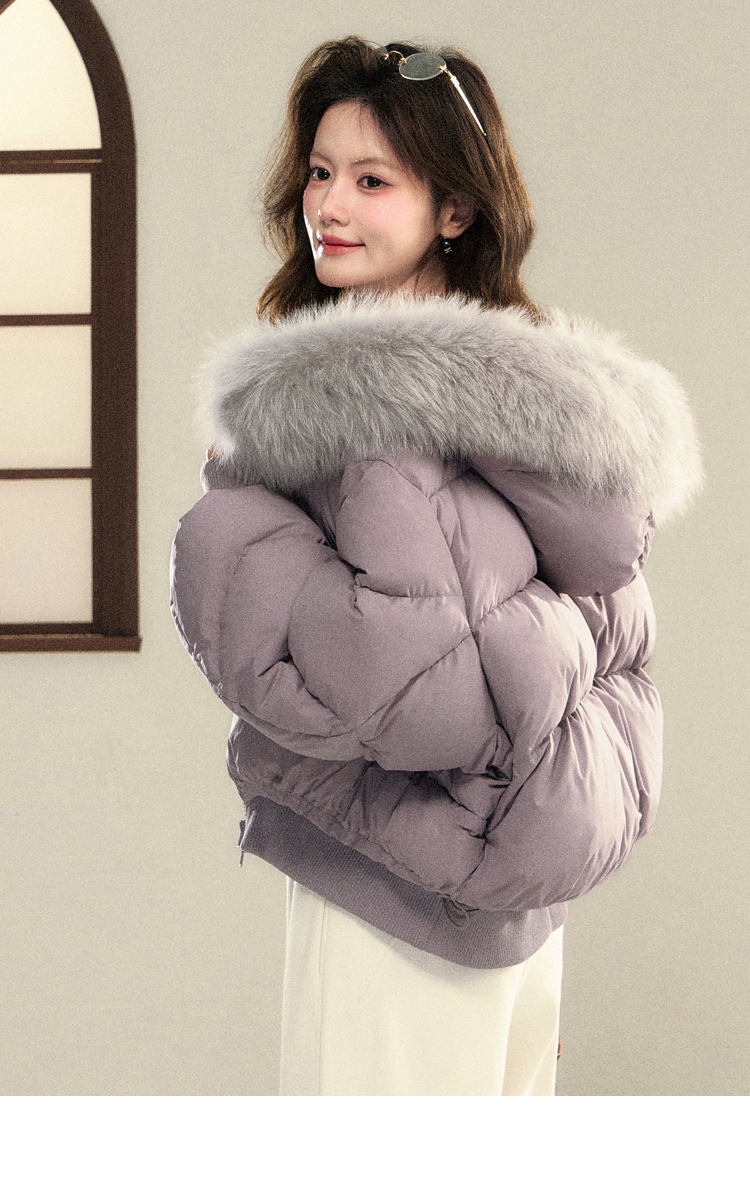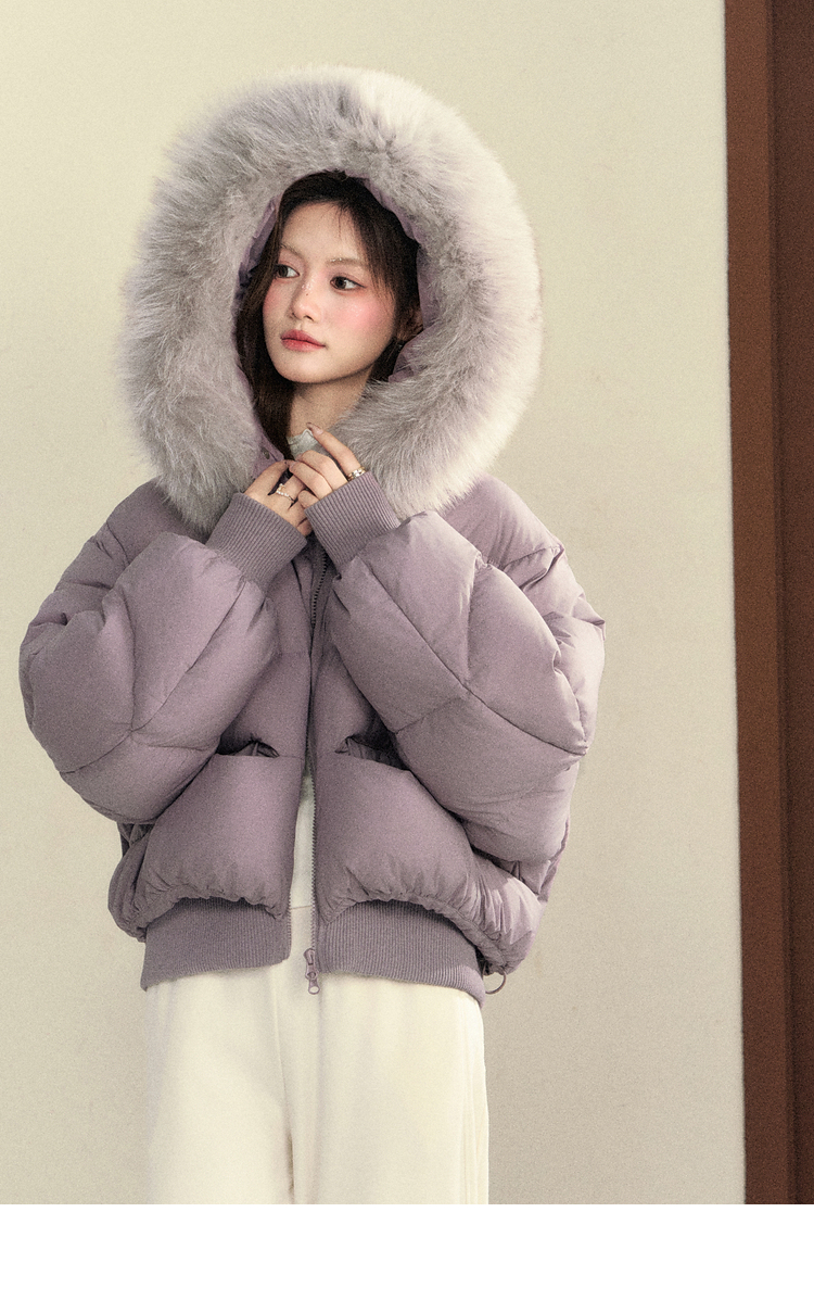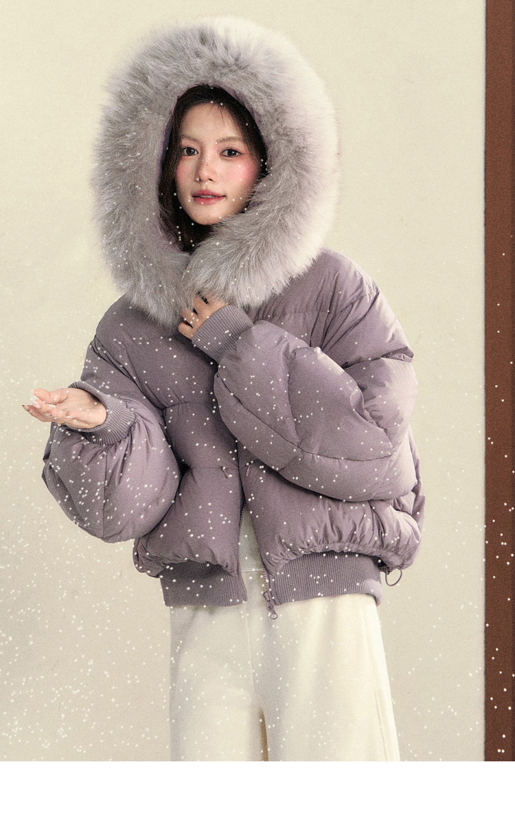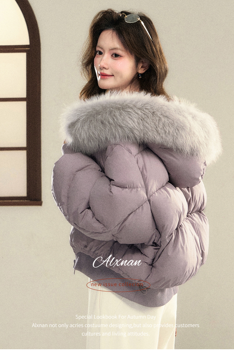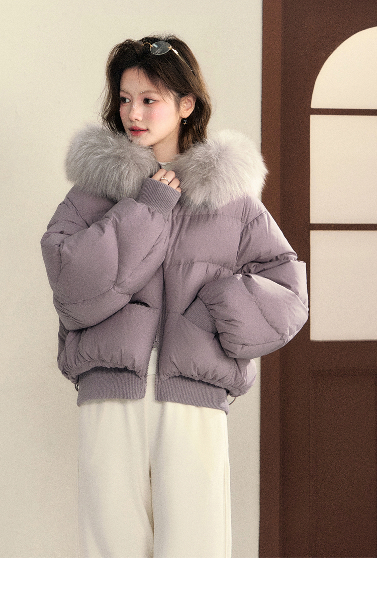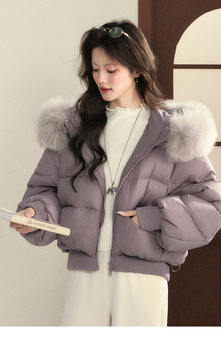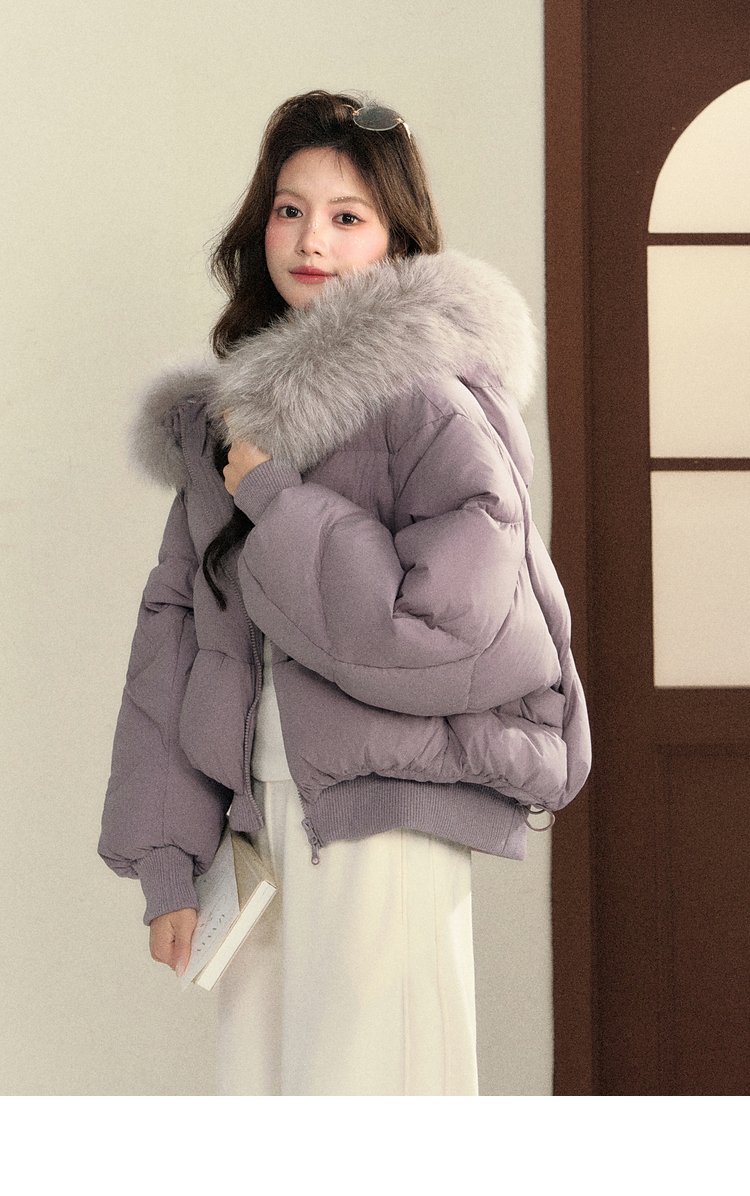 鹿向南「温暖小巷」90白鸭绒紫色毛领连帽羽绒服冬季加厚短外套女