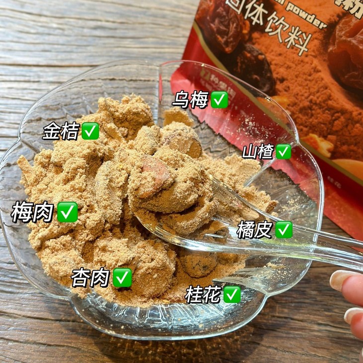 我们并非简单粗暴用乌梅浓缩汁还原 都是用真材实料研磨成粉。 一打开包装,就闻到酸甜浓郁的梅子香。 冲泡入口,不刮喉,不涩口 一杯便唇齿生津,泛着淡淡桂花香。