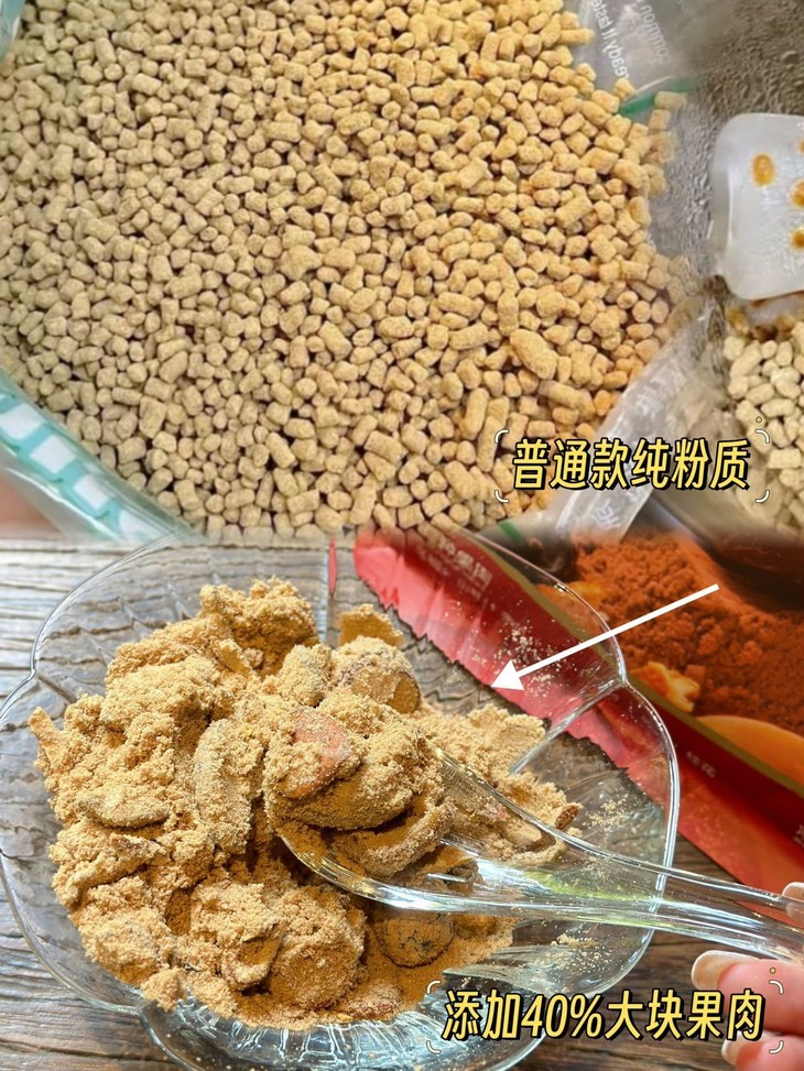 拆开包装那一刻,你就会惊喜发现 它确实和市面上的酸梅粉不一样 粉粒感较粗,极致还原了梅子研磨后 的粗糙感和颗粒感 同时梅粉中还藏着好多梅子果肉 每一颗果肉都是来自精挑细选 饱满又Q弹,嚼起来超有劲。