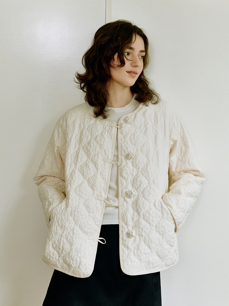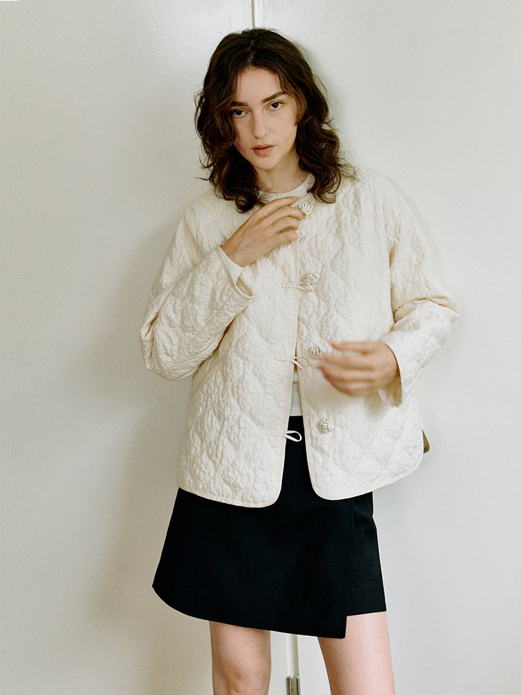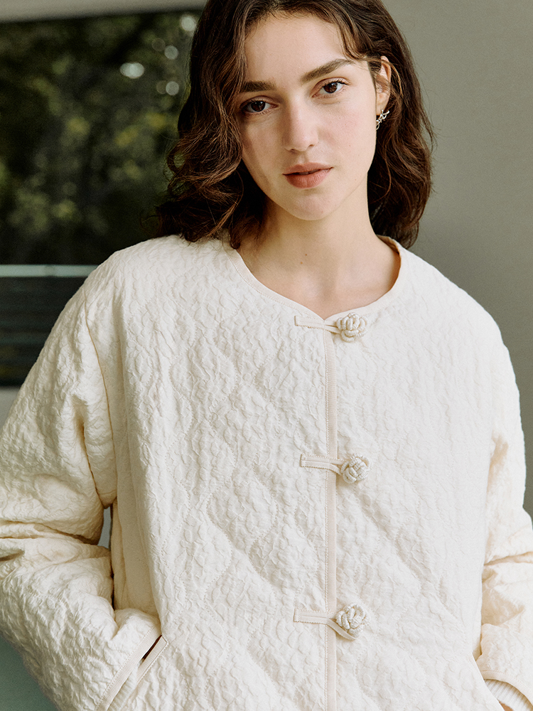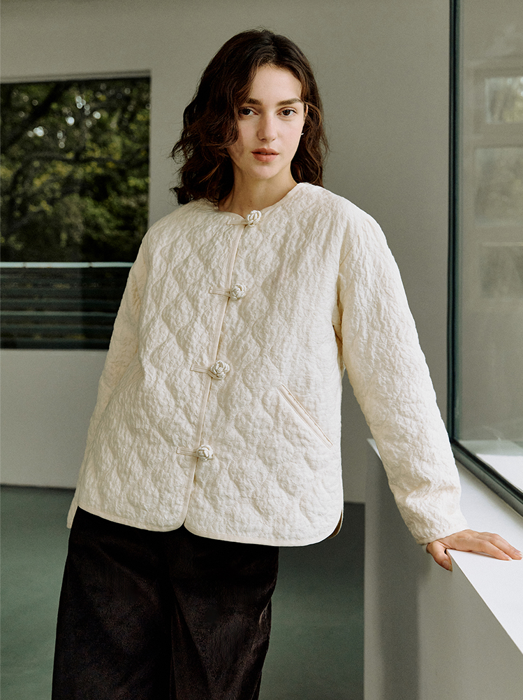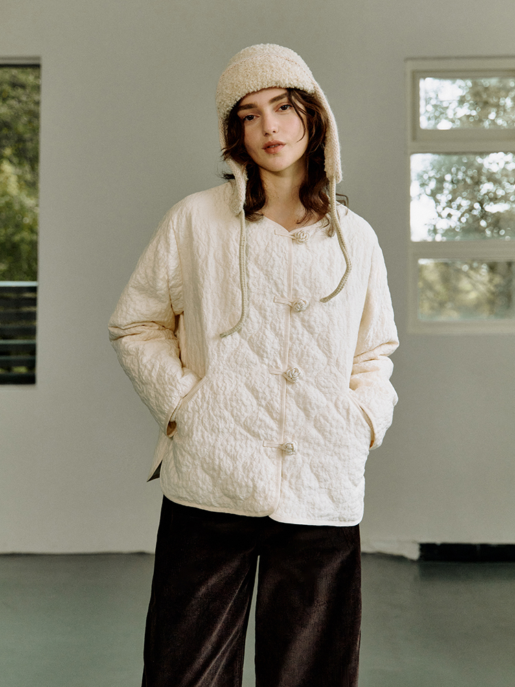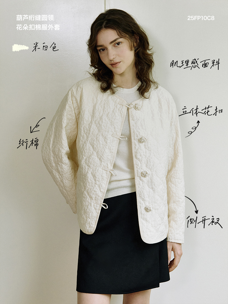 ForPoem 现货 25/FW原创设计葫芦绗缝挺阔圆领花朵扣米白色棉服外套