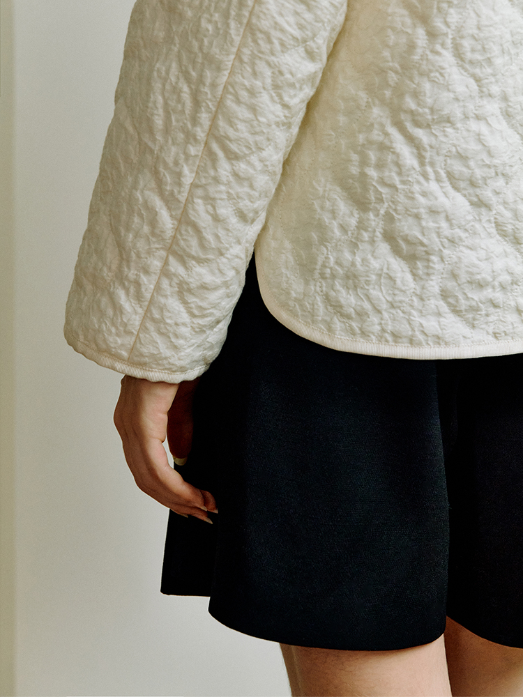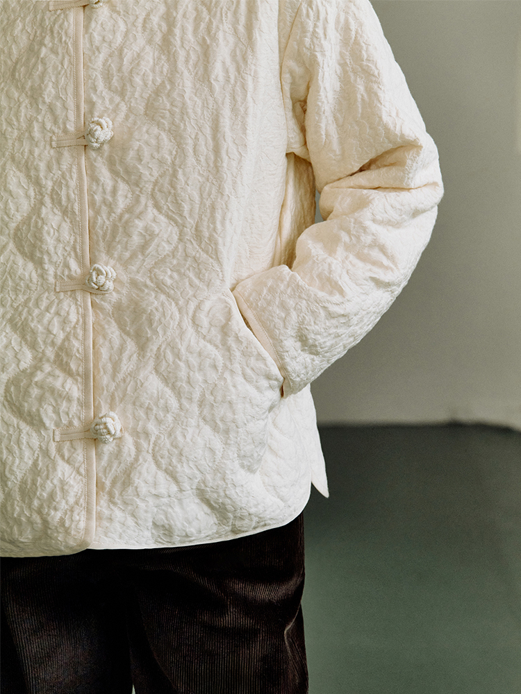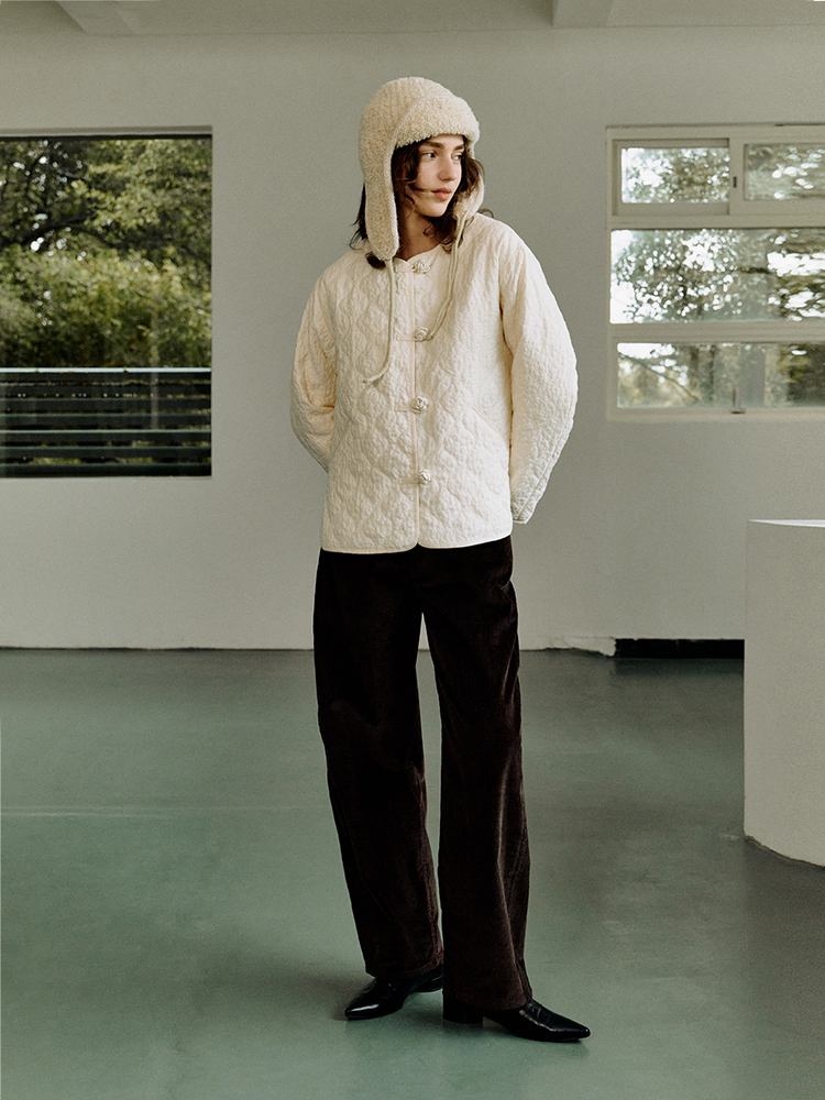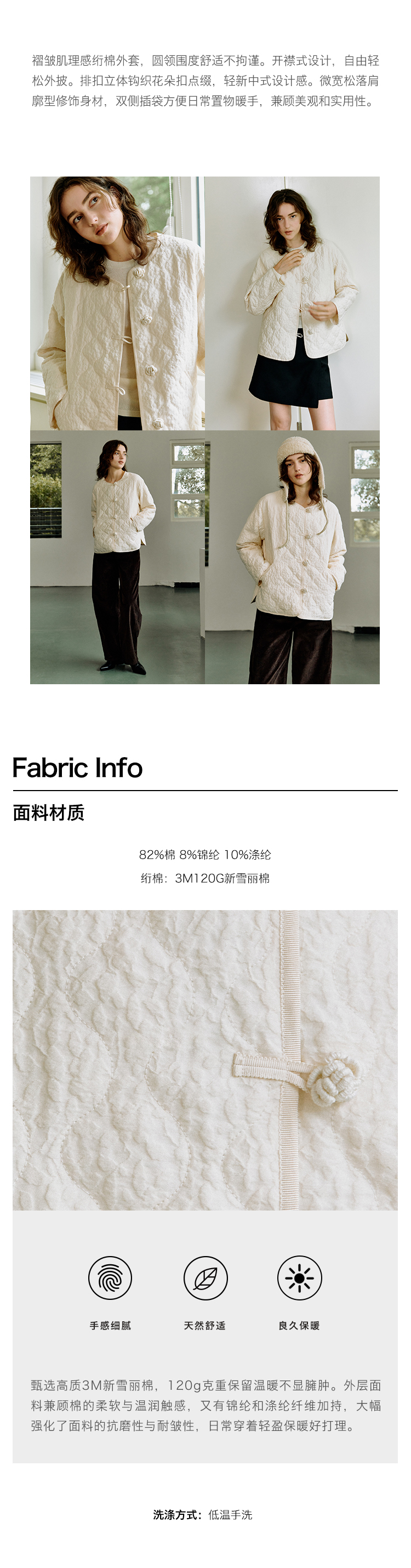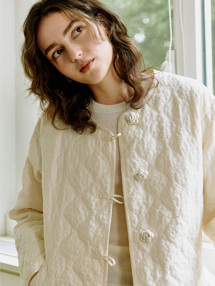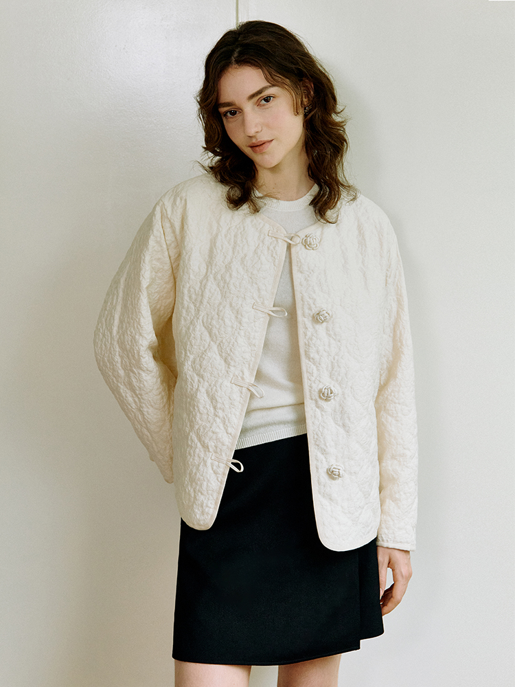 ForPoem 现货 25/FW原创设计葫芦绗缝挺阔圆领花朵扣米白色棉服外套