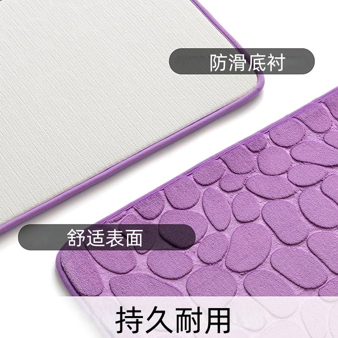 柔和触感:正面采用珊瑚绒材质,简单的卵石压印工艺搭配绒面,你会惊讶于它的舒适度。踩上去时有种丝滑的感觉,感觉垫子更厚。