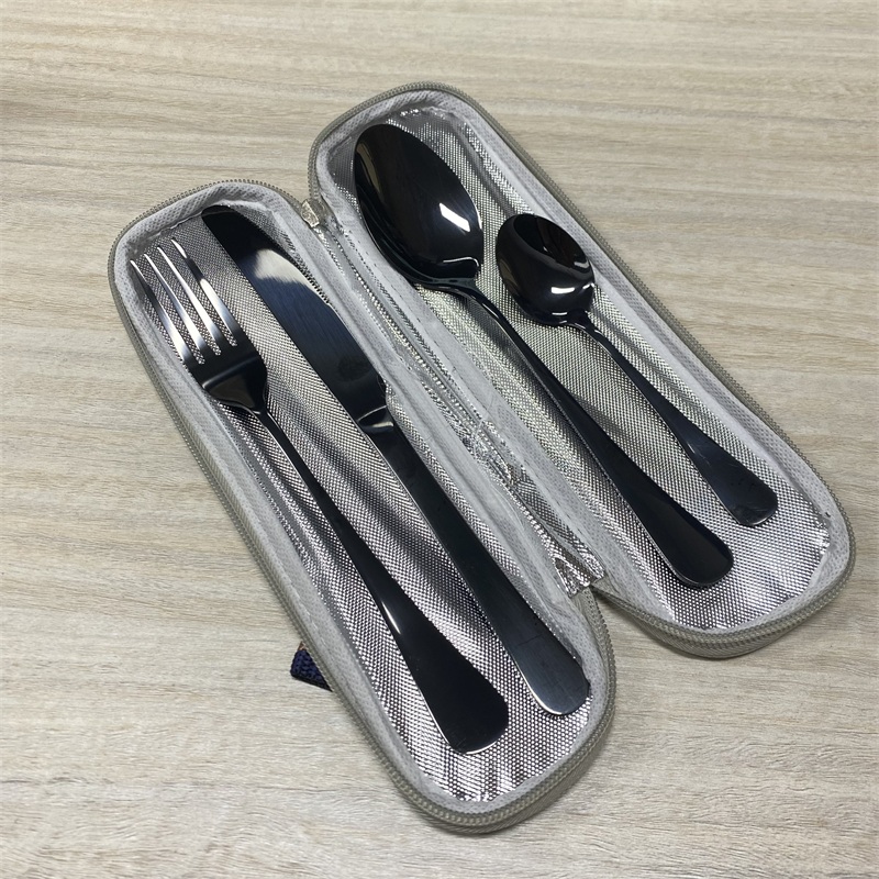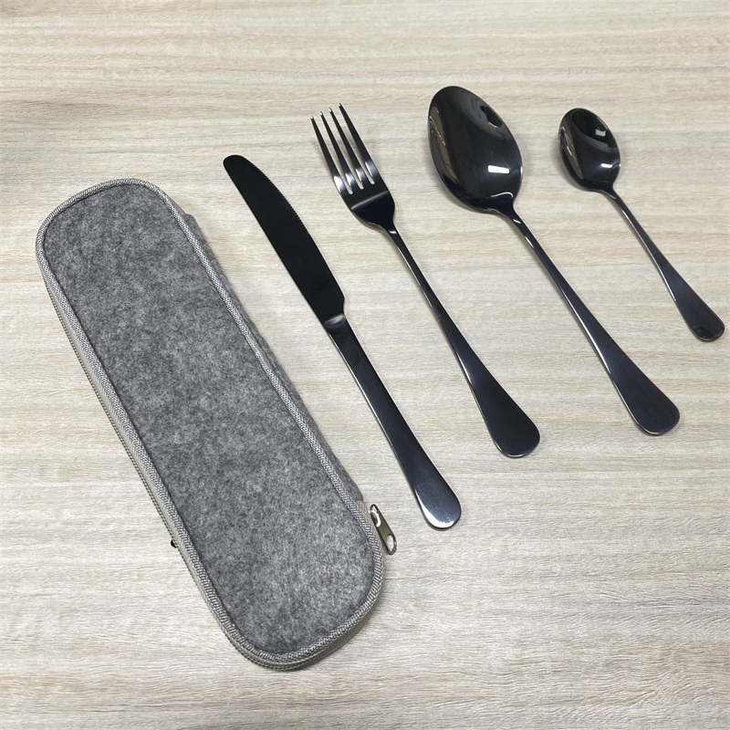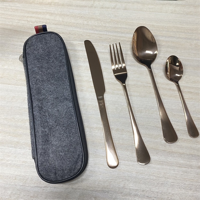 4件餐具套装,包括勺子x2个、叉子x1、牛排刀x1个+收纳袋1个,适合特殊场合或日常用餐,非常适合作为精美的餐桌装饰。