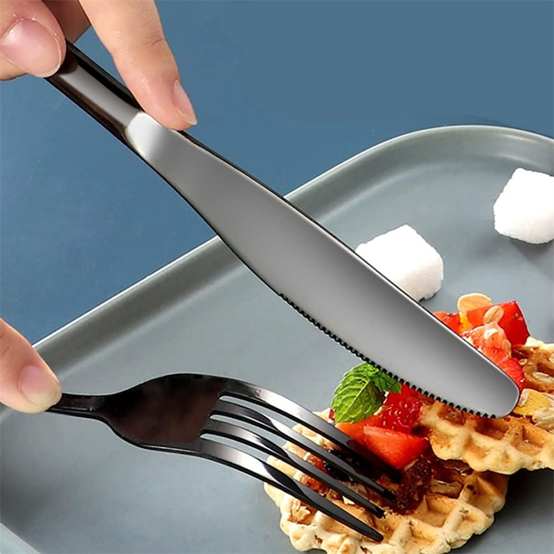 这套餐具采用食品级不锈钢制成,能保障健康。更棒的是,刀具和叉子套装不仅耐用,还具备防锈和防腐蚀功能。其坚固性确保不易弯曲,且可使用多年。