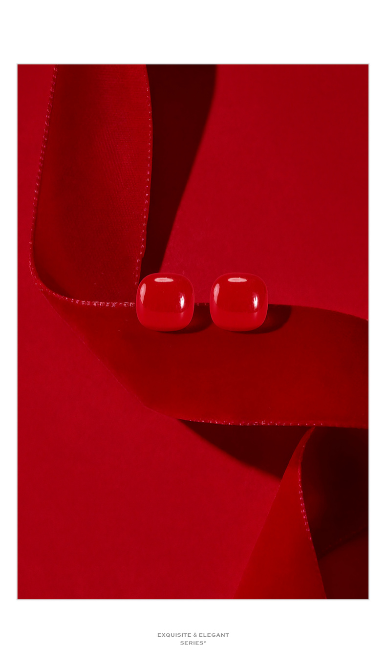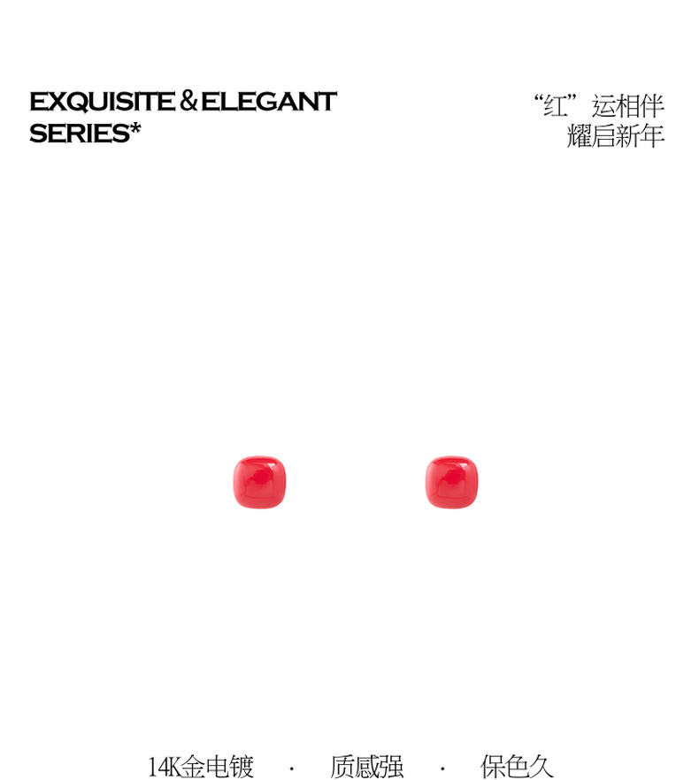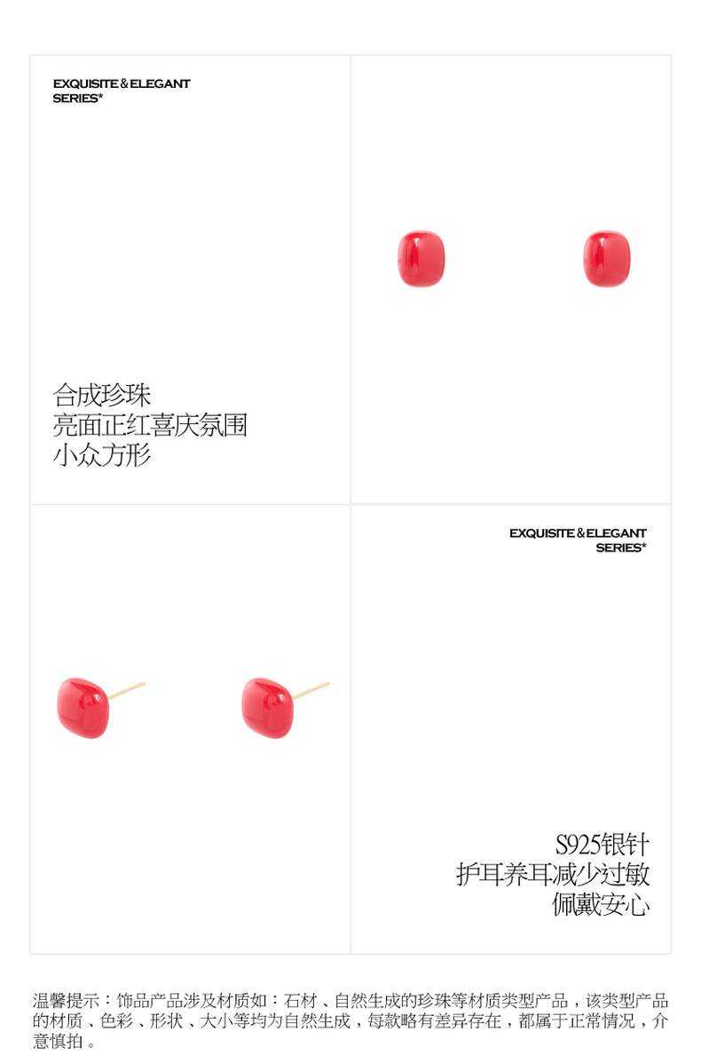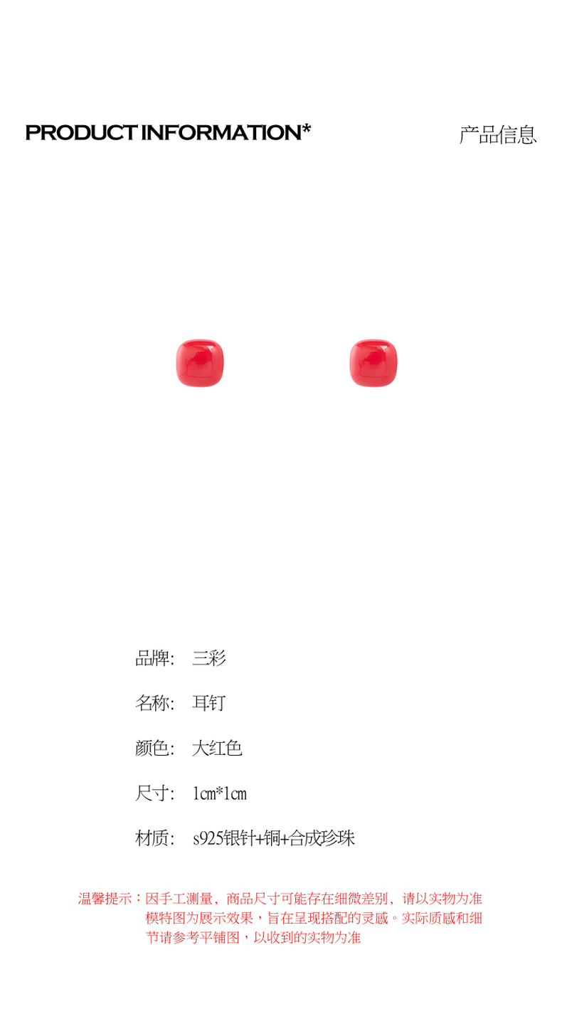 三彩2026新款红色方形珍珠耳钉S925银针国风甜酷节庆通勤氛围感