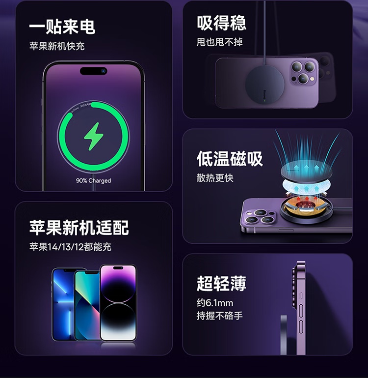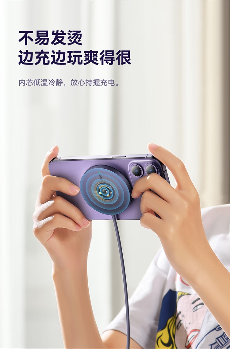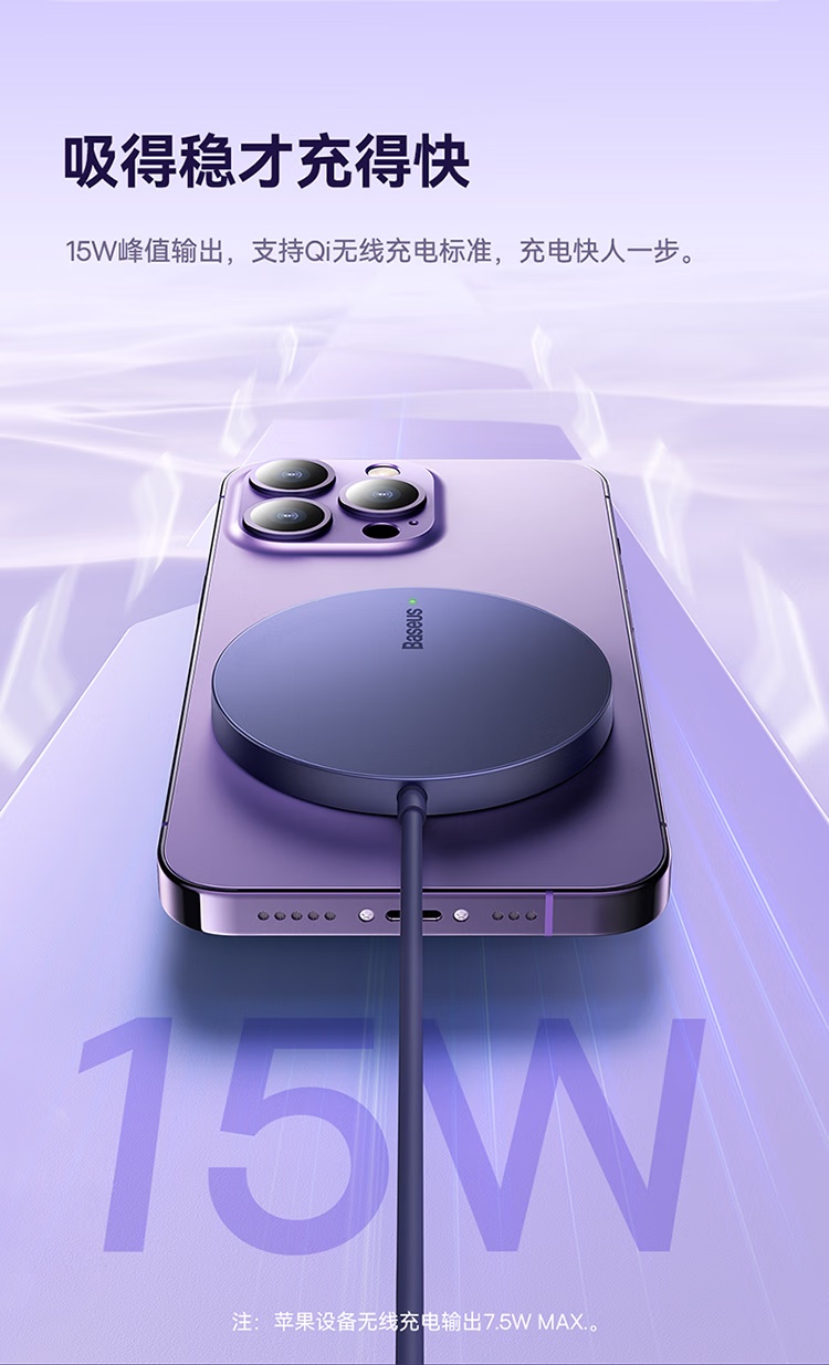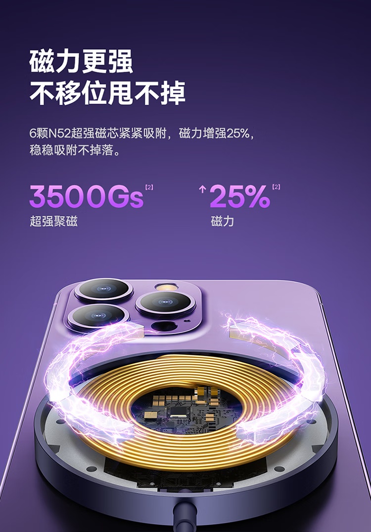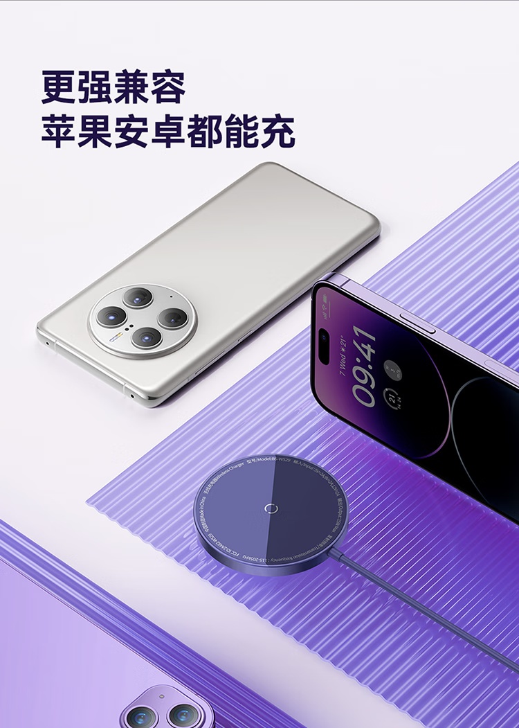 注意!安卓手机需搭配磁吸环使用才吸得住,苹果手机脱壳磁力很强,如果要带壳充,推荐要又磁吸环的