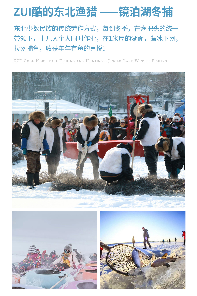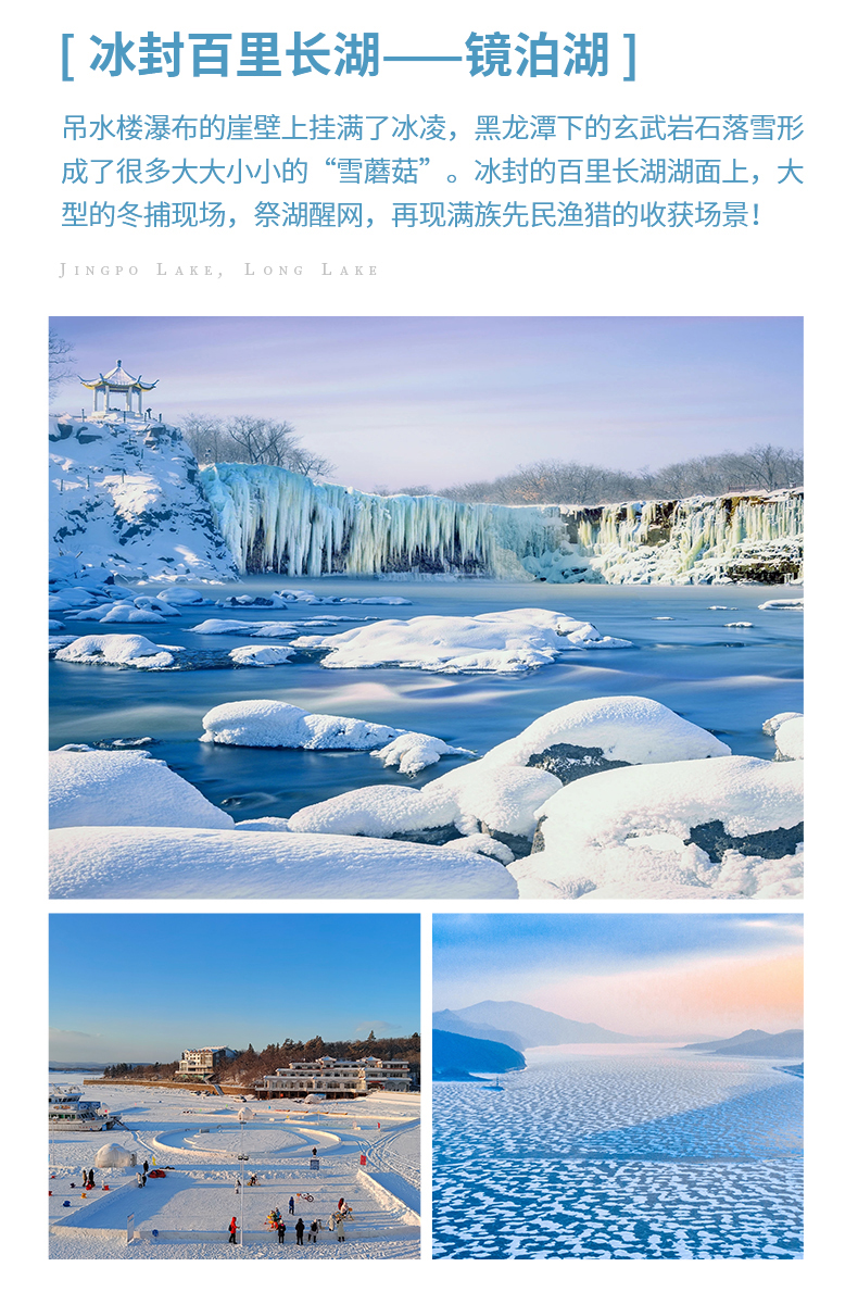 1.1号及之后含镜泊湖门票、镜泊湖观光车票、镜泊湖冰雪大滑梯(仅1次游玩)、镜泊湖冰上娱乐通票(6项目各游玩1次)、冬捕区往返小交通雪圈、渤海传奇朝贡之路冬捕情景演绎。