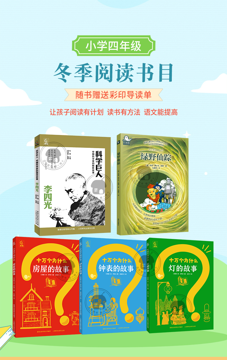 四年级适读《科学巨人·李四光》《绿野仙踪》《十万个为什么·房屋的故事》《十万个为什么·钟表的故事》《十万个为什么·灯的故事》