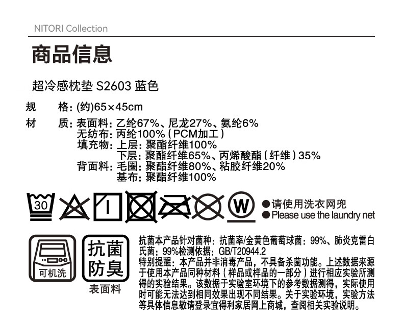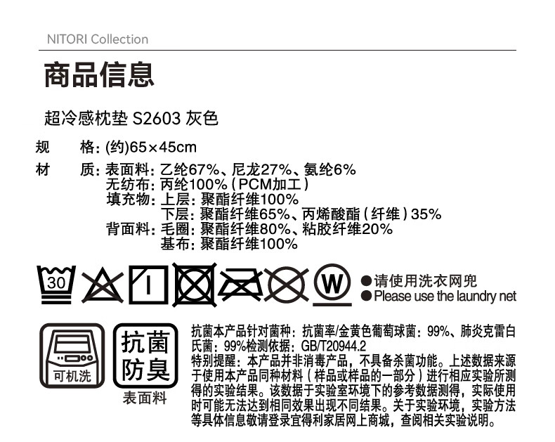 NITORI宜得利家居 夏季凉感枕头垫抗菌防臭超凉感枕垫 S2603