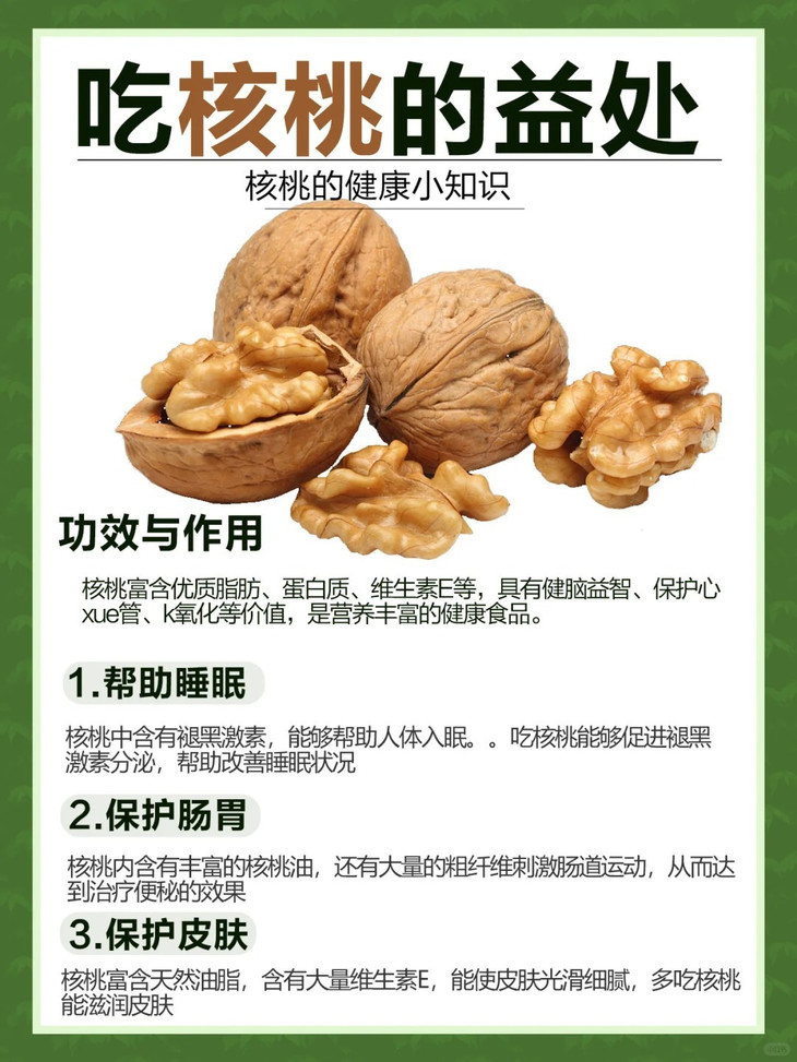 核桃的营养价值与功效: 💚帮助睡眠 核桃中含有褪黑激素,能够帮助人体入眠,多吃核桃能够帮助改善睡眠状况。 💙保护肠胃 核桃内含有丰富的核桃油,还有大量的粗纤维刺激肠道运动,从而达到治疗便秘的效果。 💗保护皮肤 核桃富含天然油脂,含有大量维生素E,能使皮肤光滑细腻,多吃核桃能滋润皮肤。