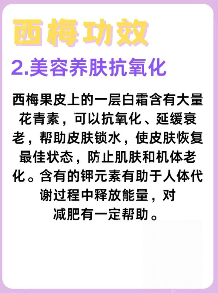 西梅含丰富的营养价值和功效: 💛润肠通便 西梅干中含有大量膳食纤维,具有润肠通便的功效 💜延缓衰老 西梅干中含有维生素A和维生素C,有较好的抗氧化作用 🧡补气血 西梅干中含有铁、维生素K等,可以有助于补气血和预防贫血哦