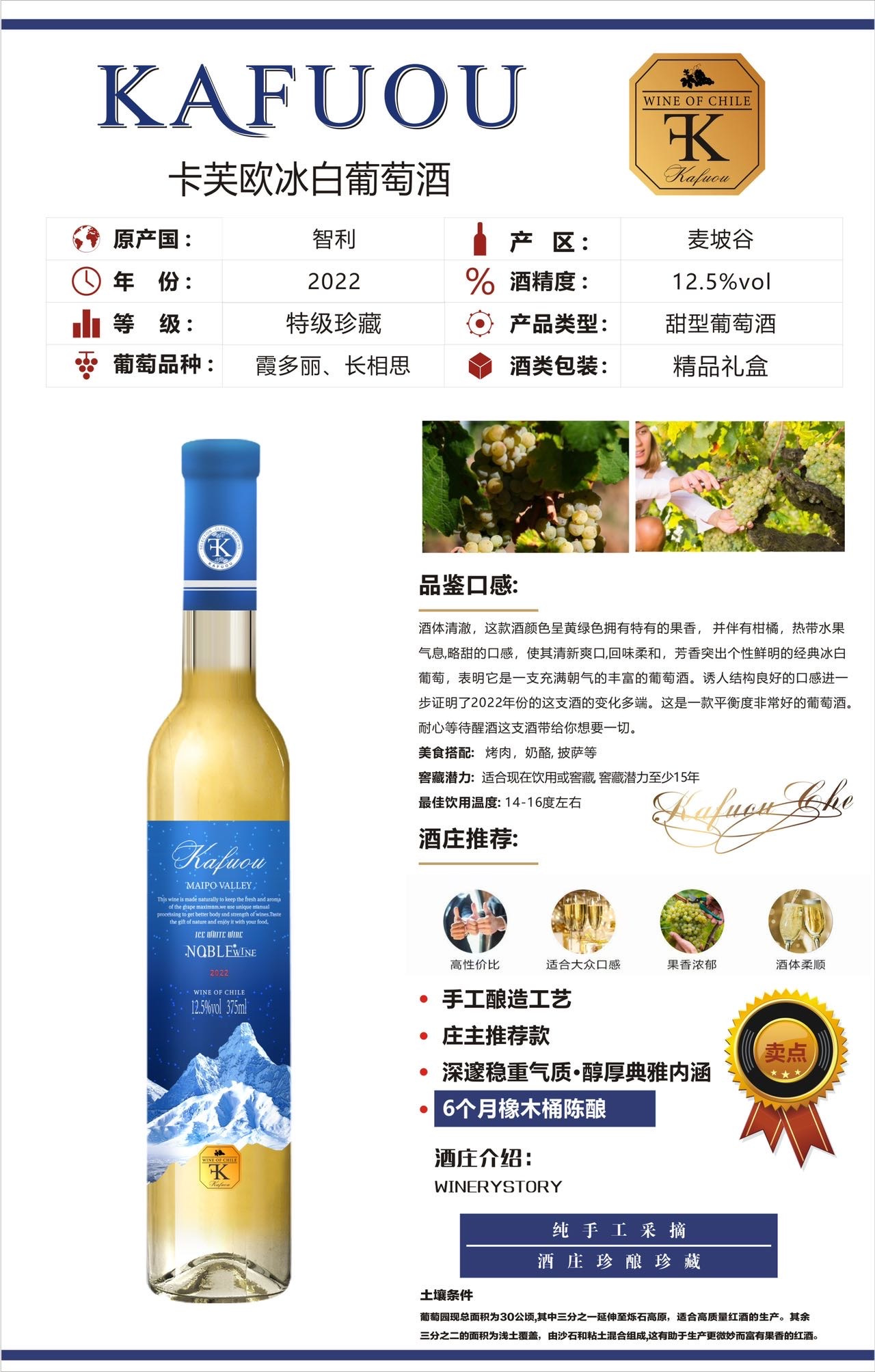 【72h发货智利原瓶进口】KAFUOU冰白葡萄酒 冰镇口感更佳12.5%vol 375ml*4瓶 手提礼盒装送礼袋+海马刀