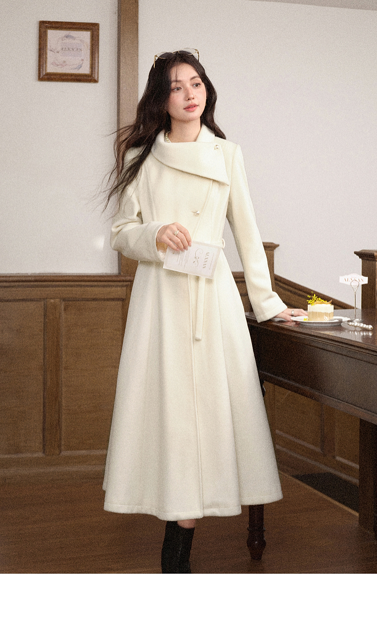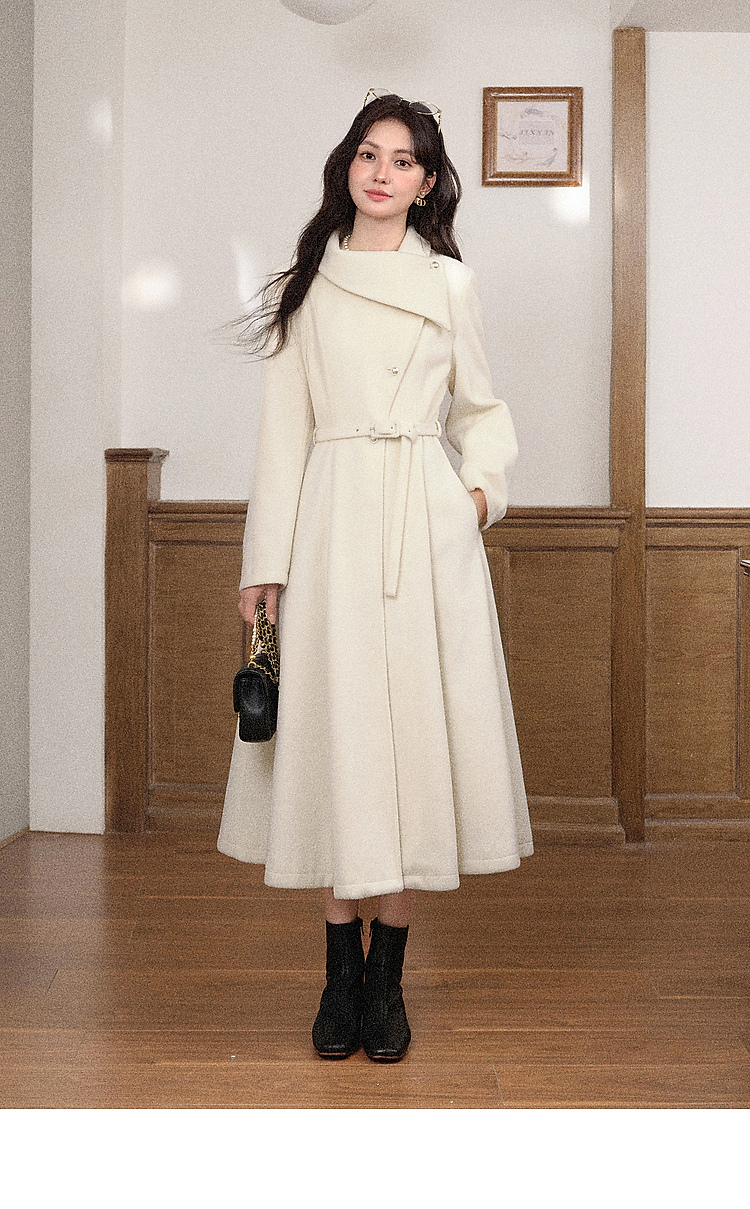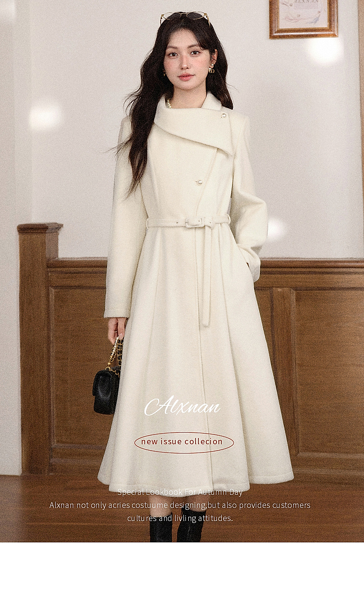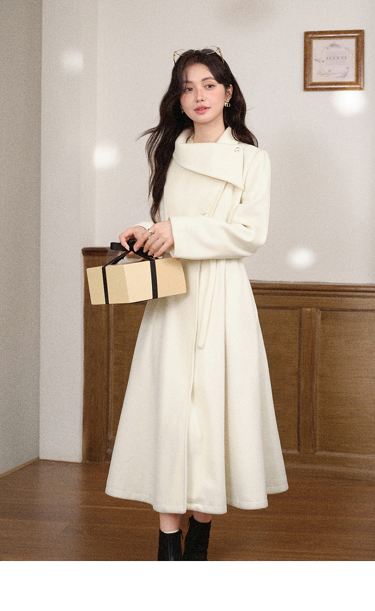 鹿向南「海岛热恋」秋冬装新款气质杏色毛呢外套长款呢子连衣裙女