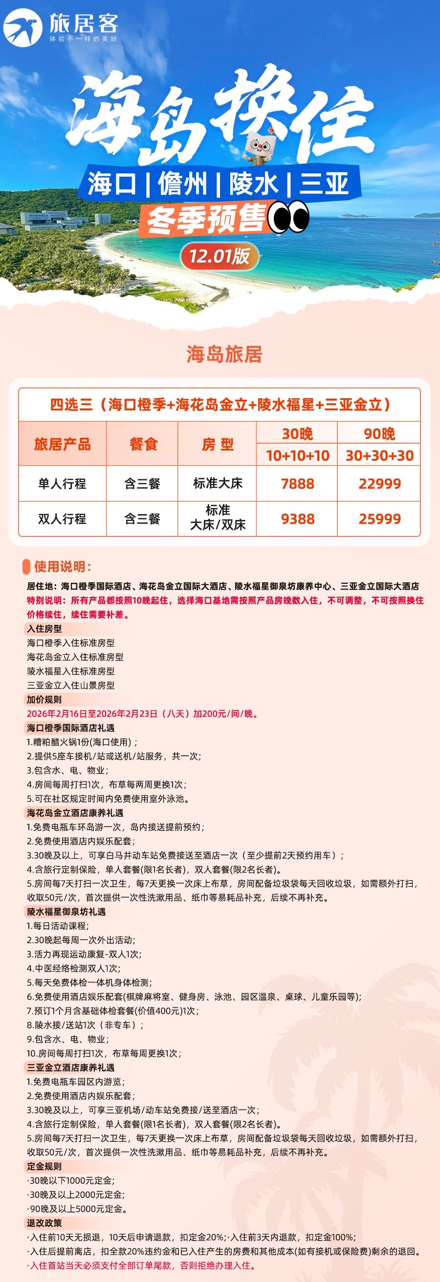 【海岛冬季旅居·三亚/陵水/海花岛/海口·三地换住】15晚、30晚、90晚换住·可含三餐含早不含餐·含接站服务1次