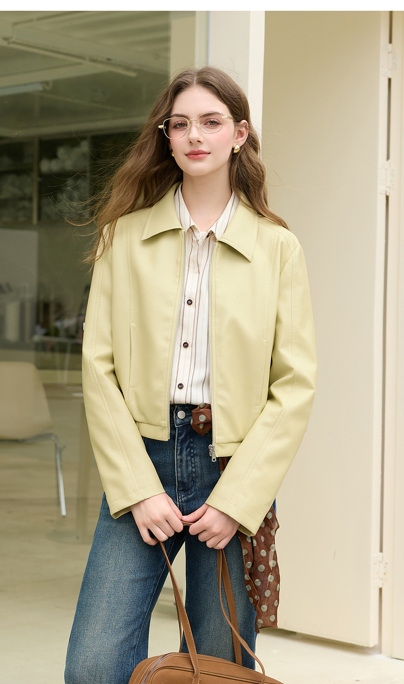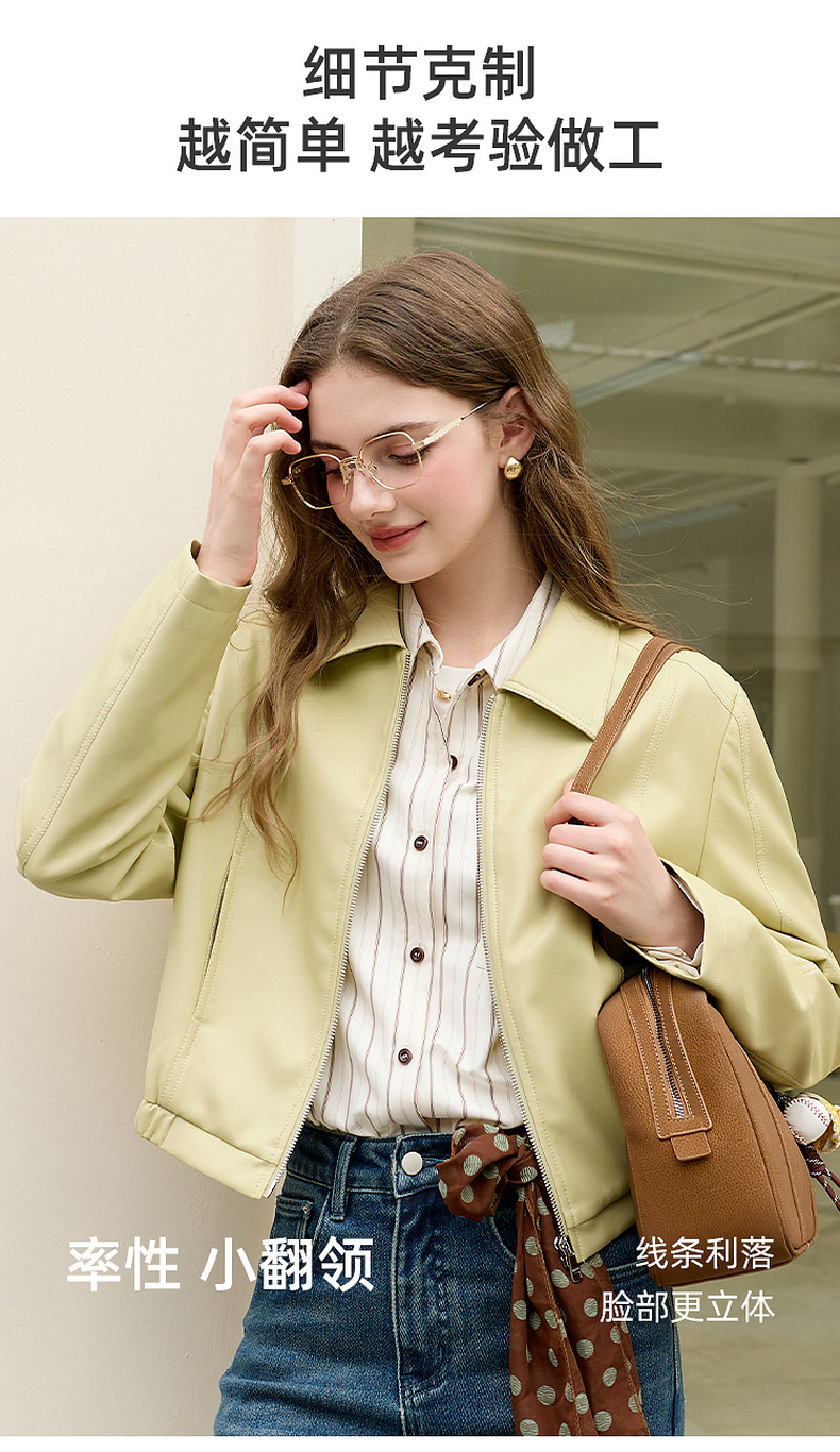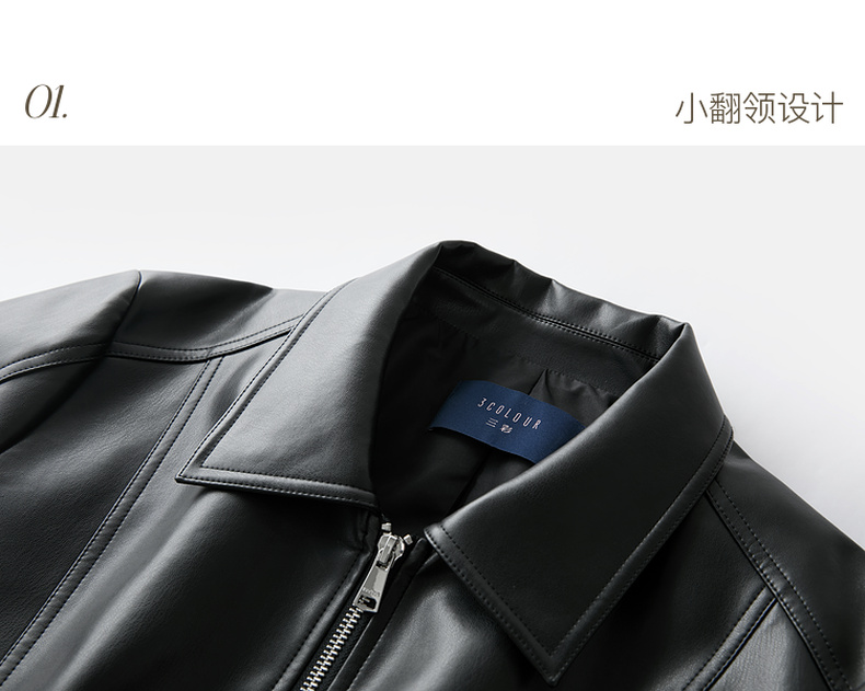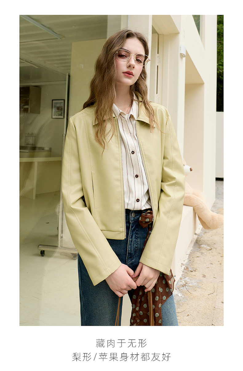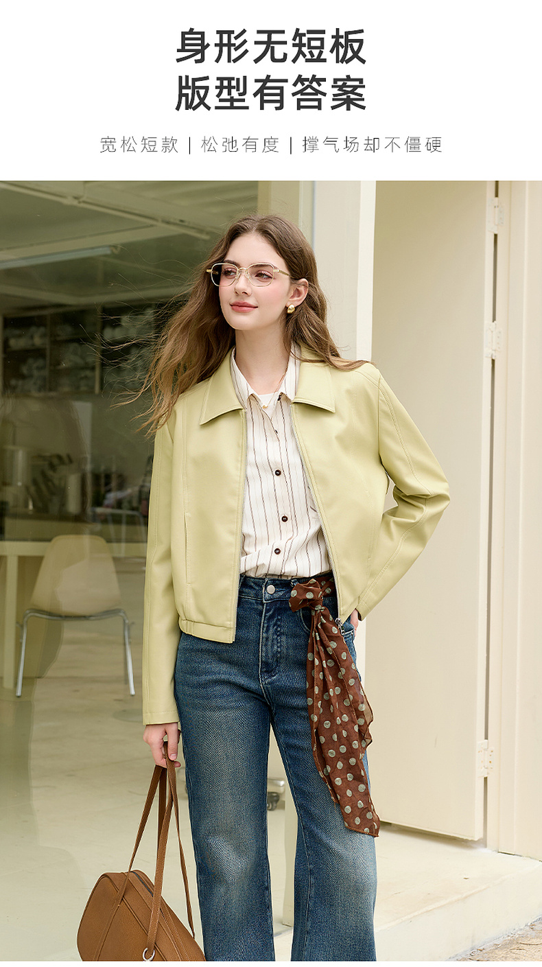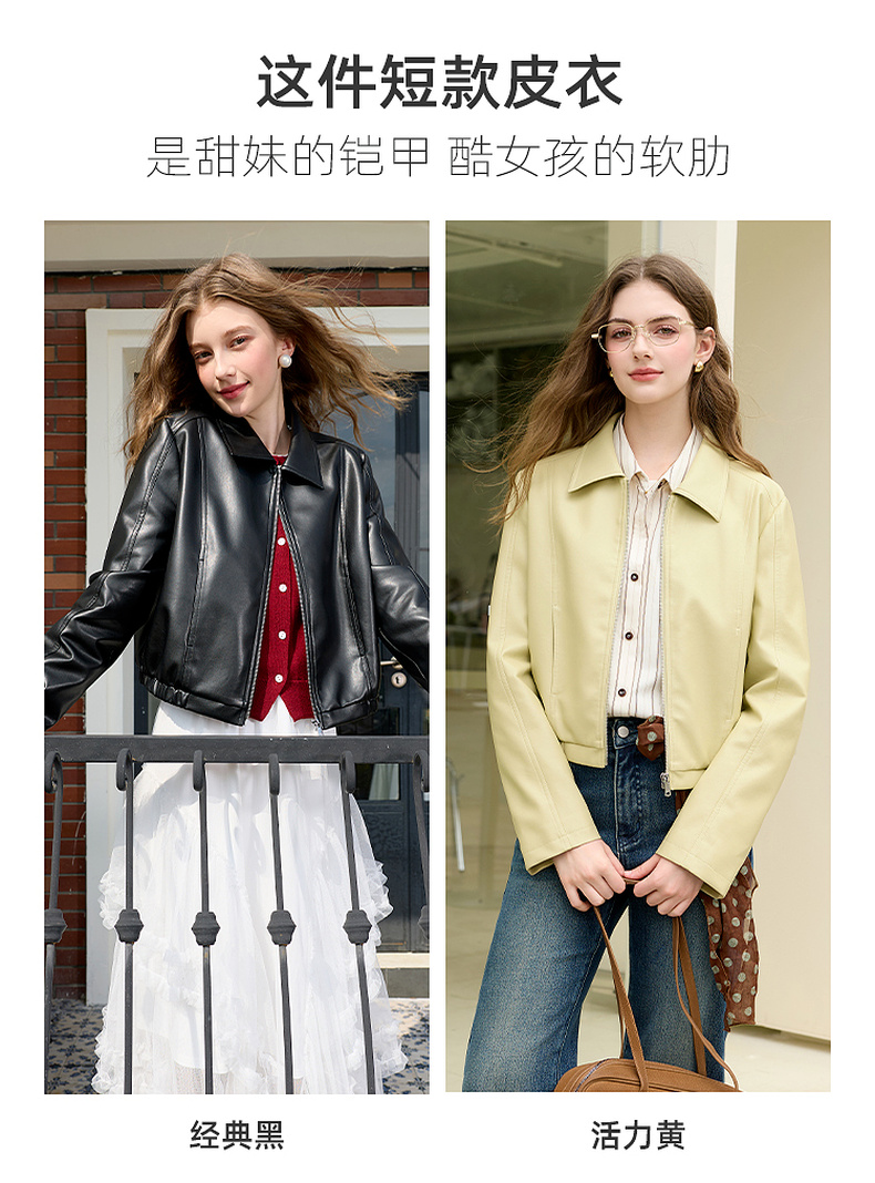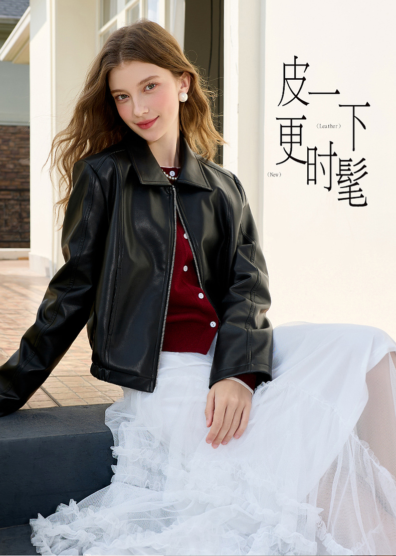 三彩2026春季新款PU皮衣外套翻领拉链夹克开衫小短款宽松M