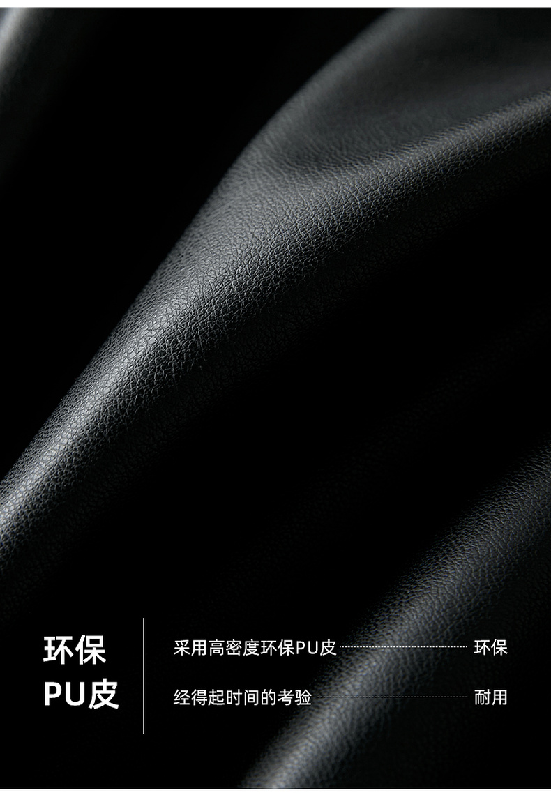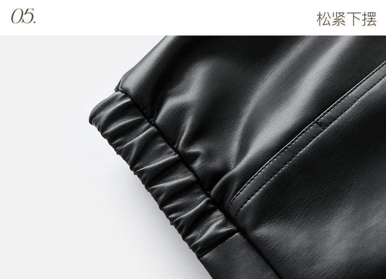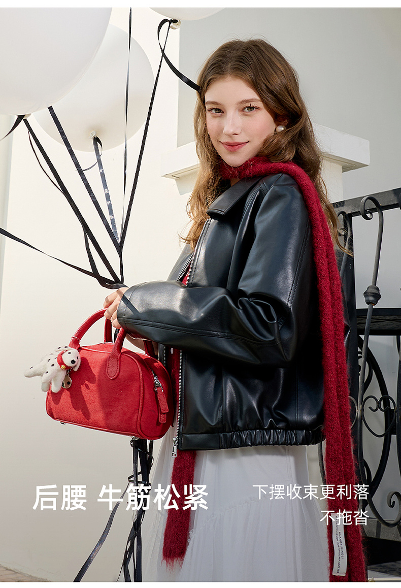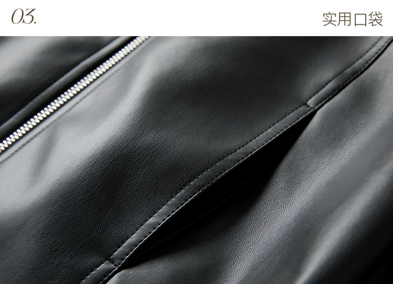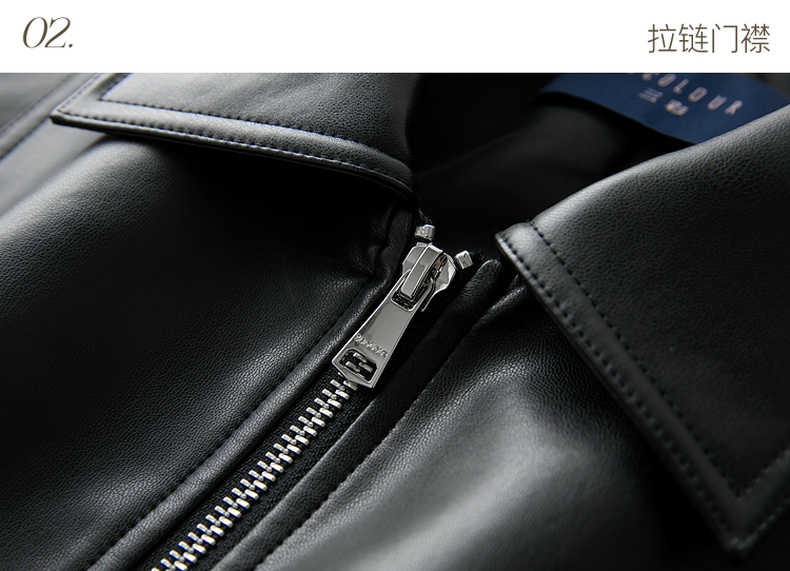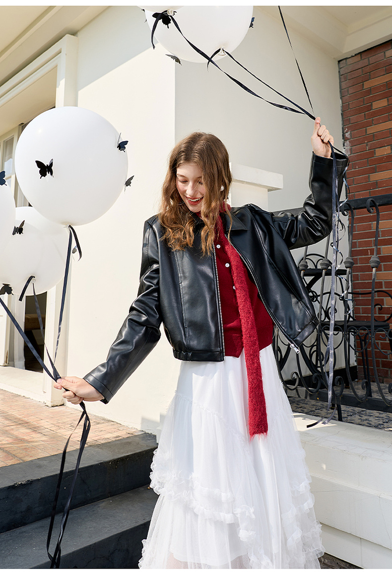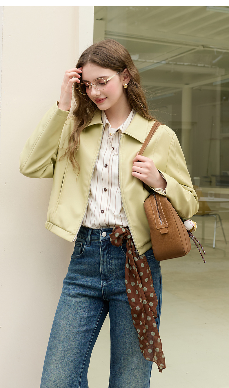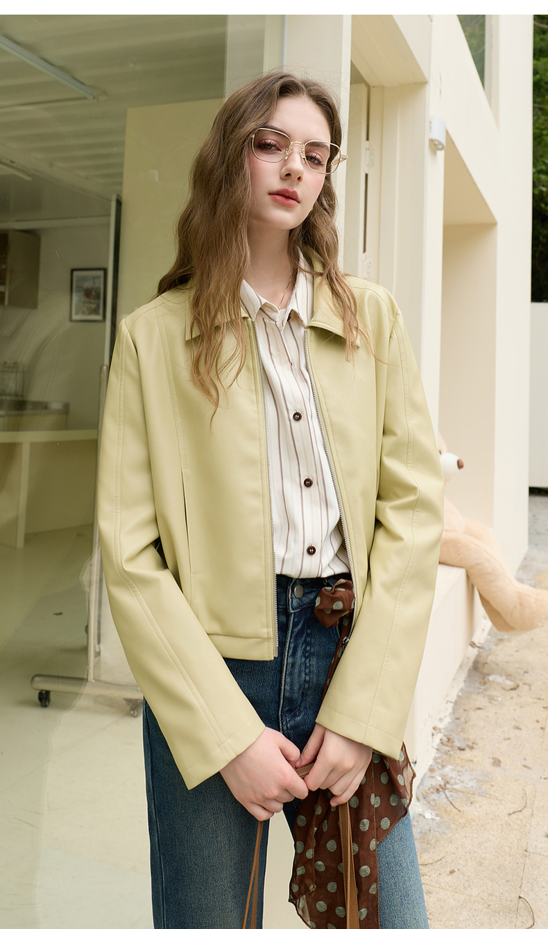 三彩2026春季新款PU皮衣外套翻领拉链夹克开衫小短款宽松M