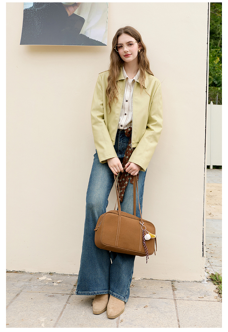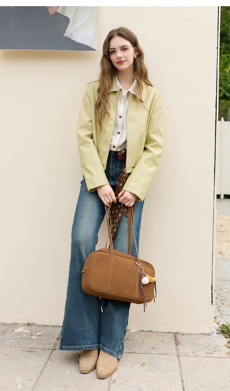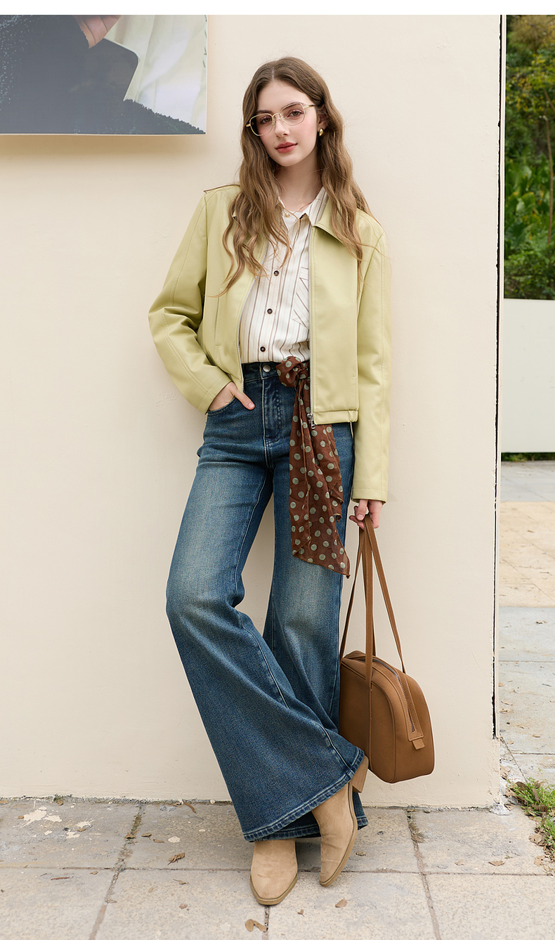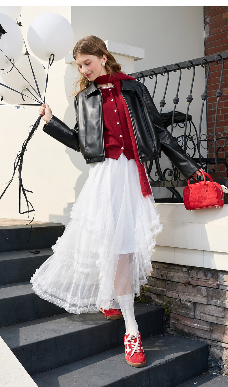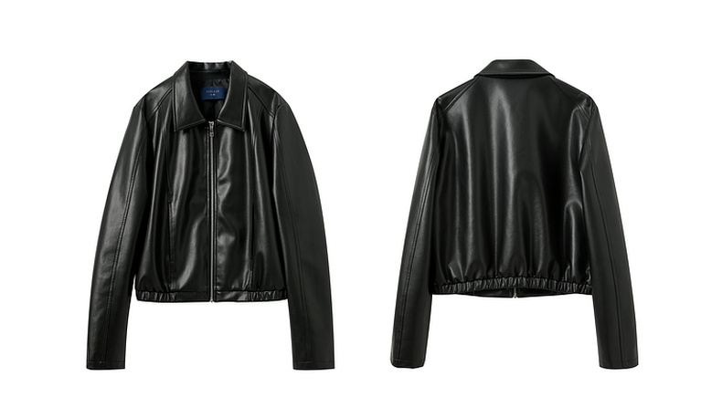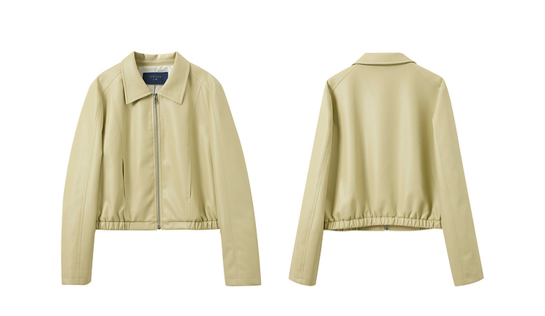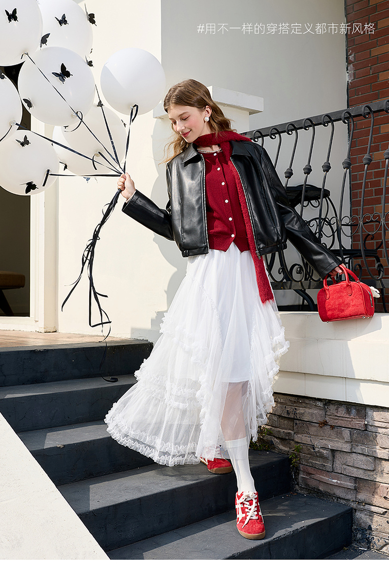 三彩2026春季新款PU皮衣外套翻领拉链夹克开衫小短款宽松M