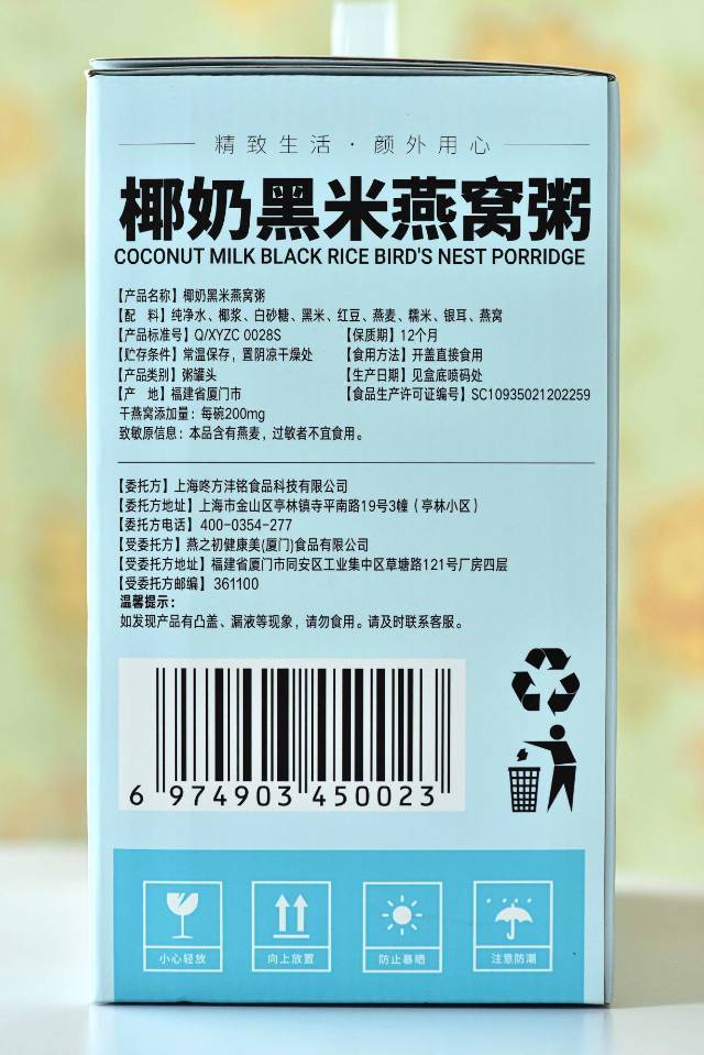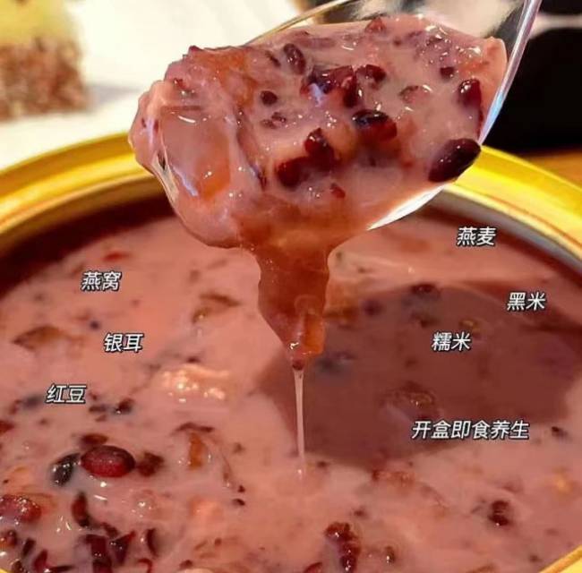 配料:燕窝,银耳,黑米,椰浆,纯净水,红豆,燕麦,糯米