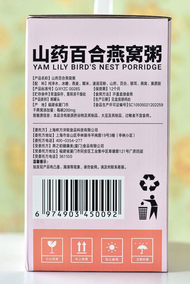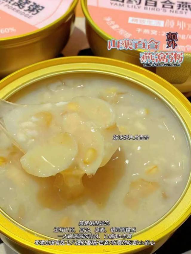 配料:燕窝,银耳,百合,山药,纯净水,冰糖,燕麦,糯米