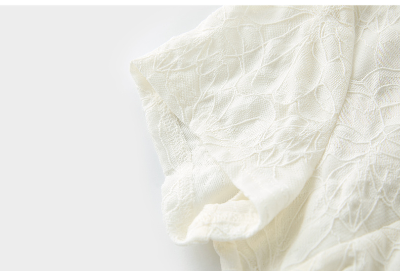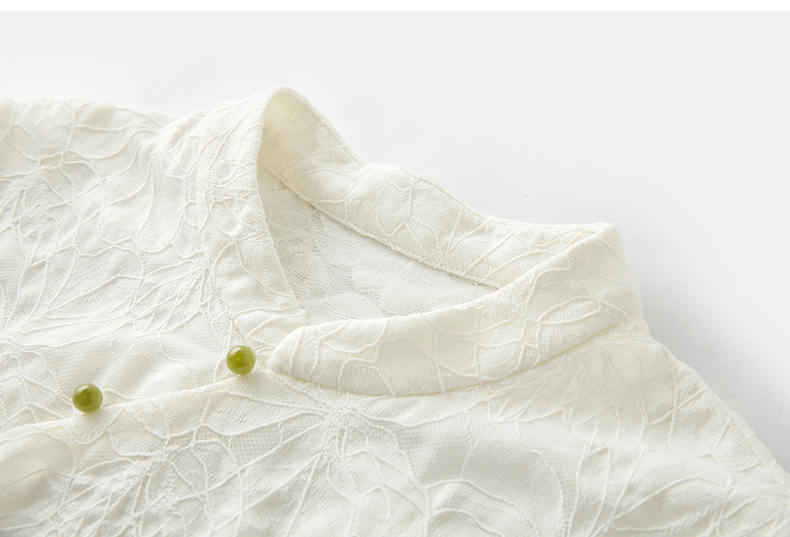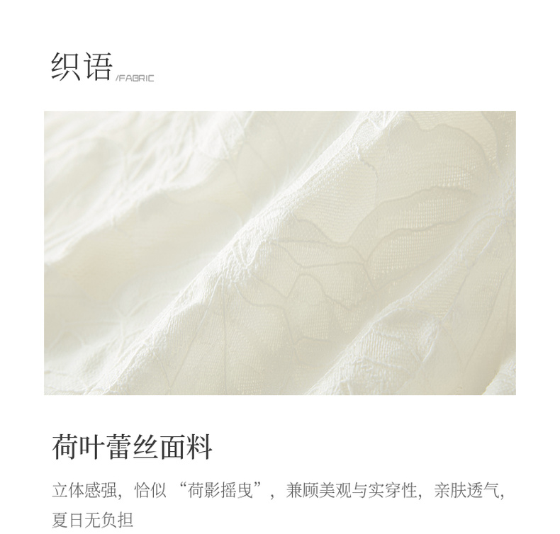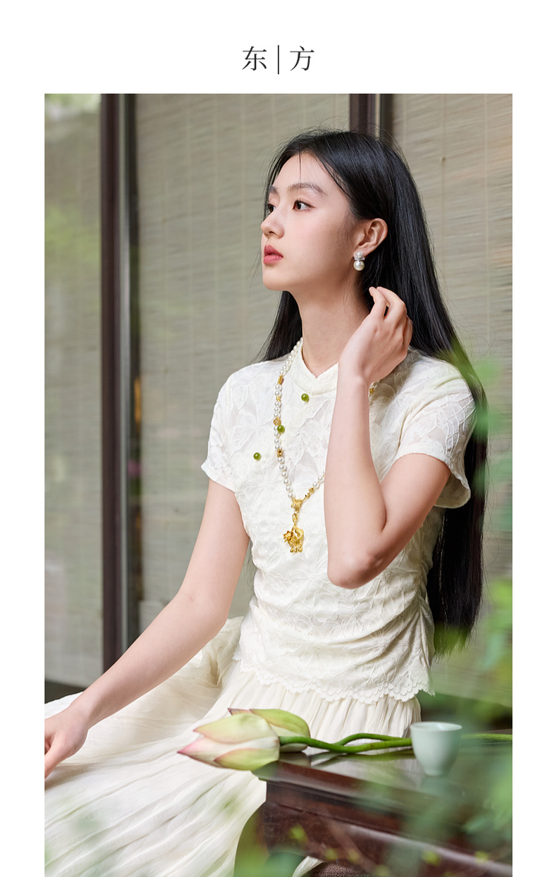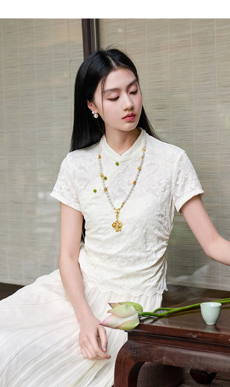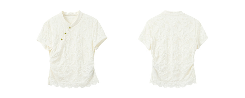 三彩【荷叶田田】2025夏季新款荷叶蕾丝衫立领短袖修身套头C