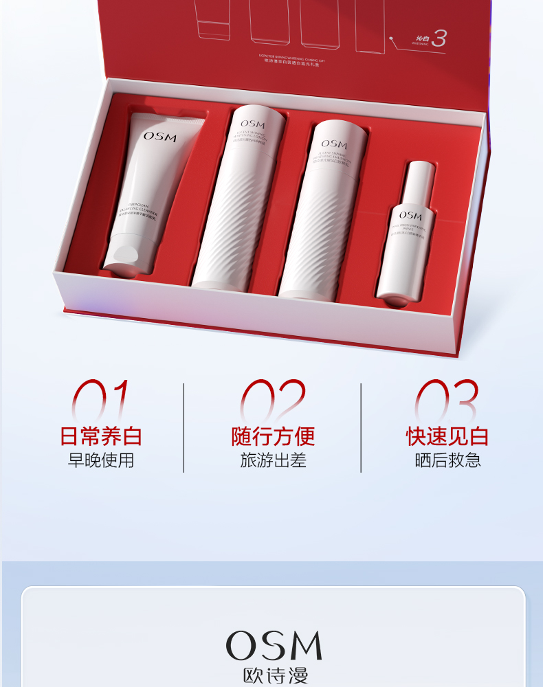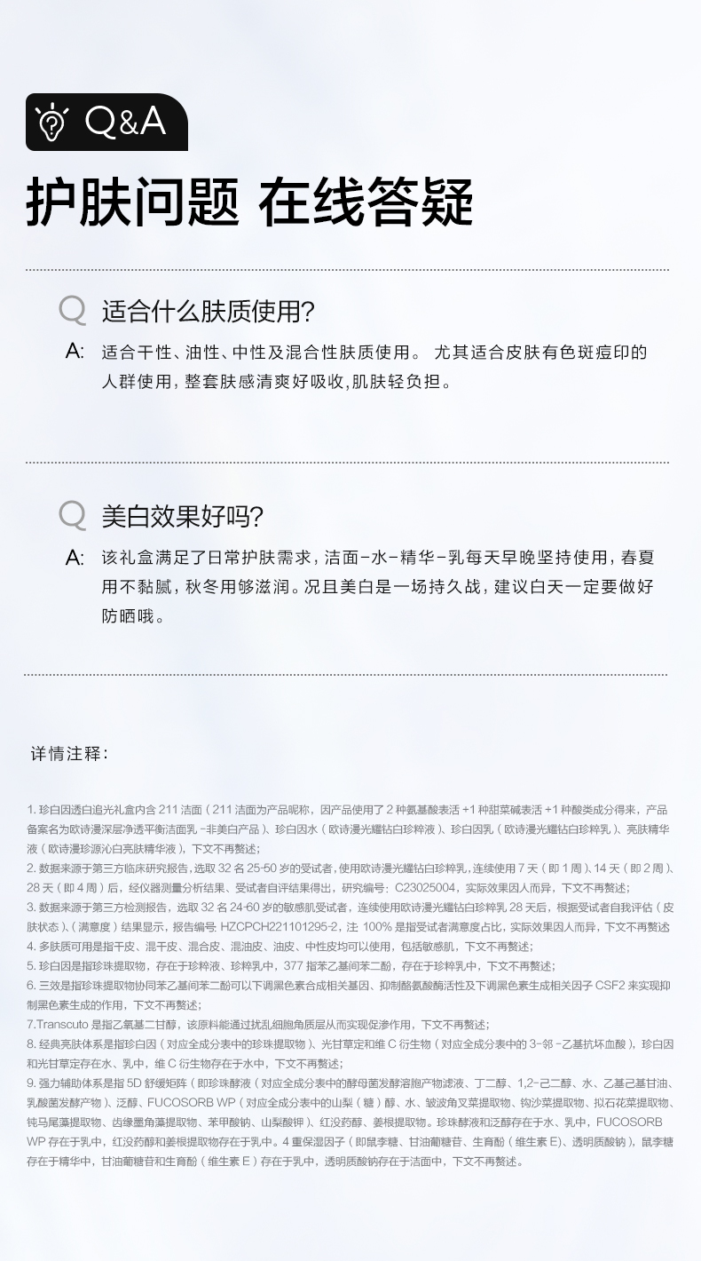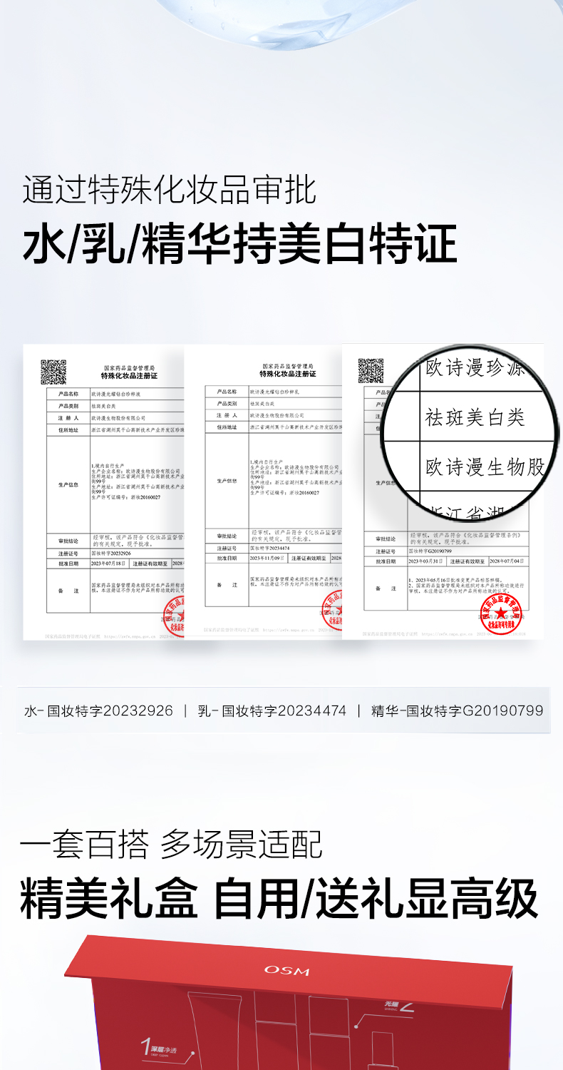 【美白套盒】欧诗漫珍白因追光礼盒(100g洁面+120ml水+100ml乳+精华30ml)赠:同款水120ml+同款乳100ml+沁白亮肤面霜50g+润白淡斑面膜5片*1盒+奢颜精华5支*2+礼品袋