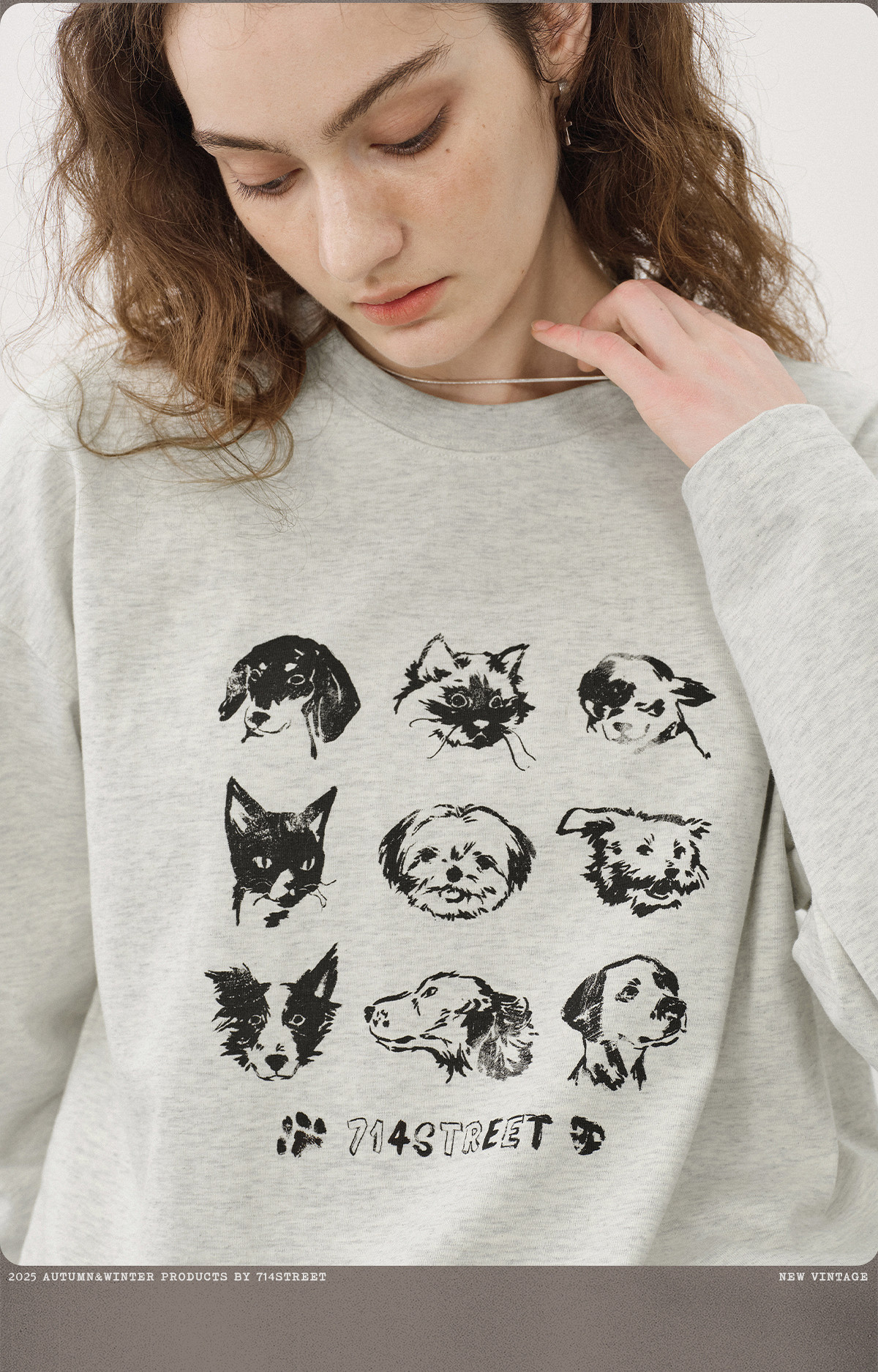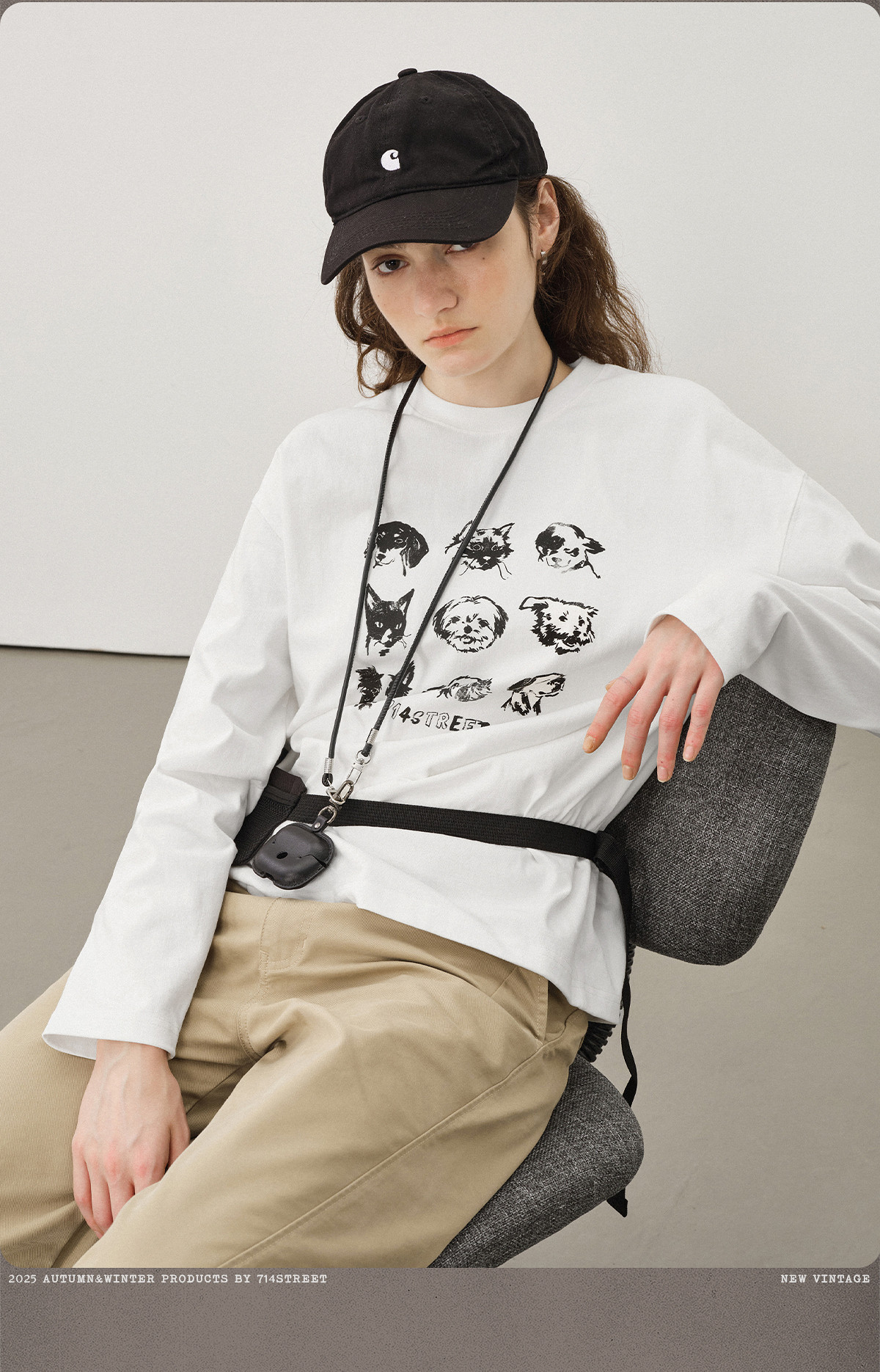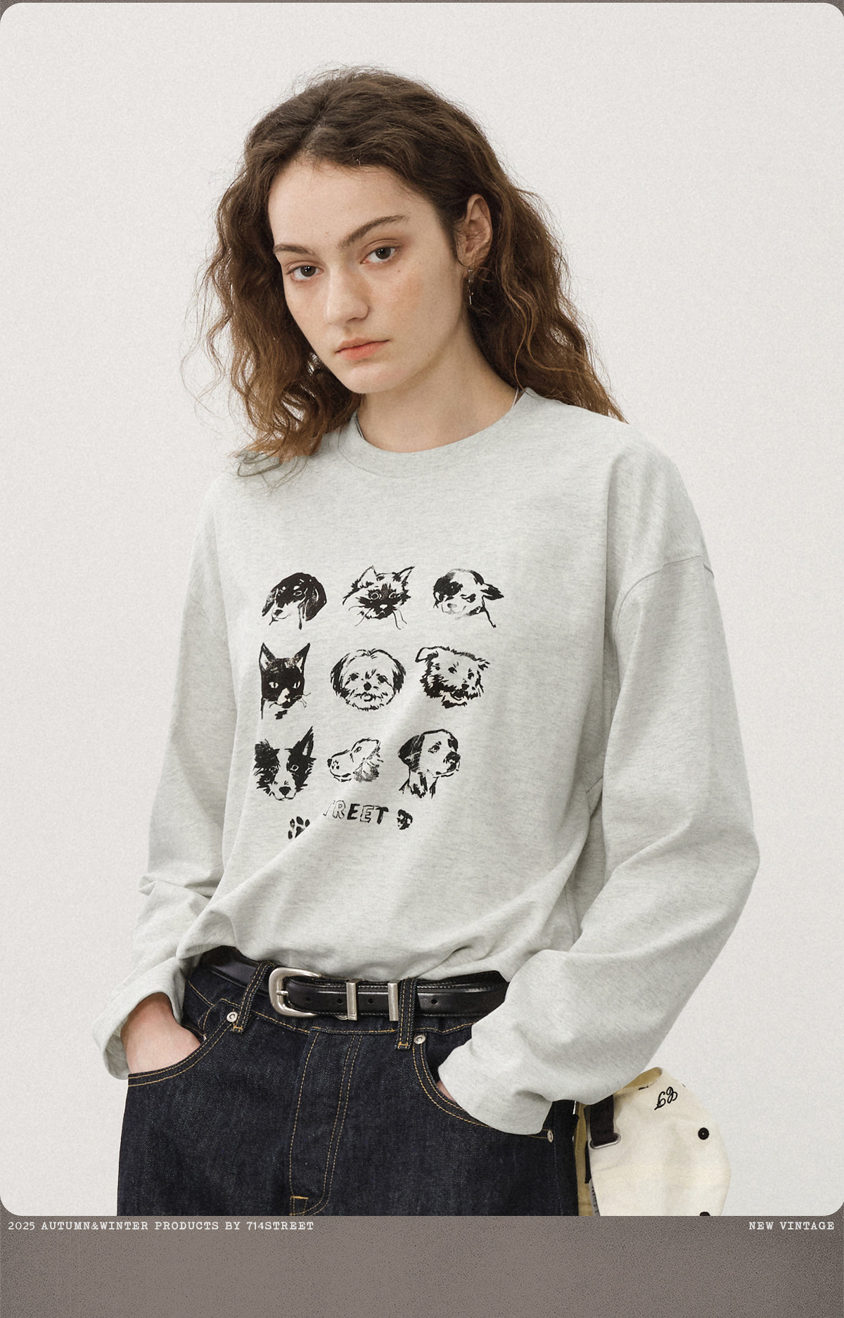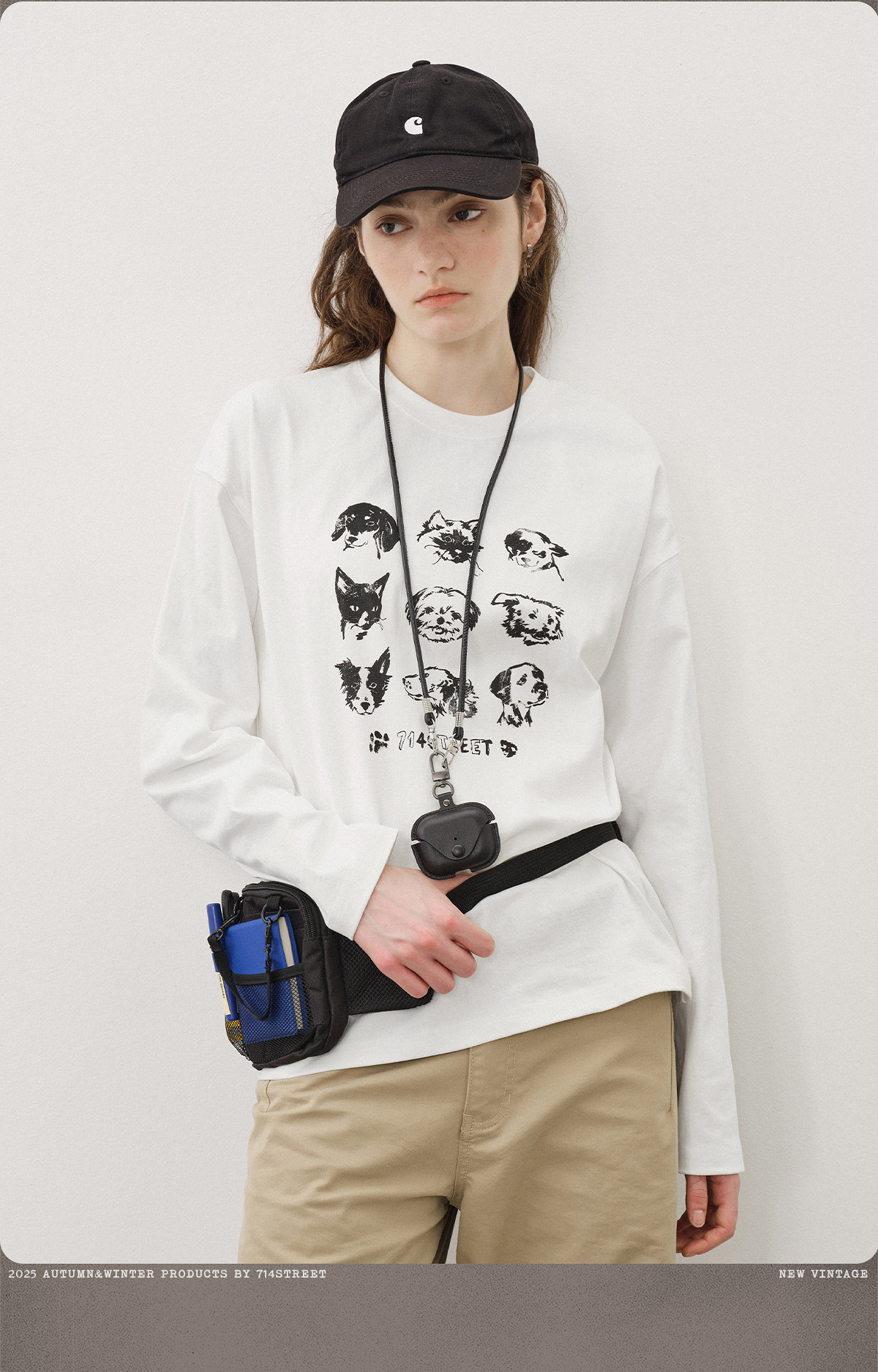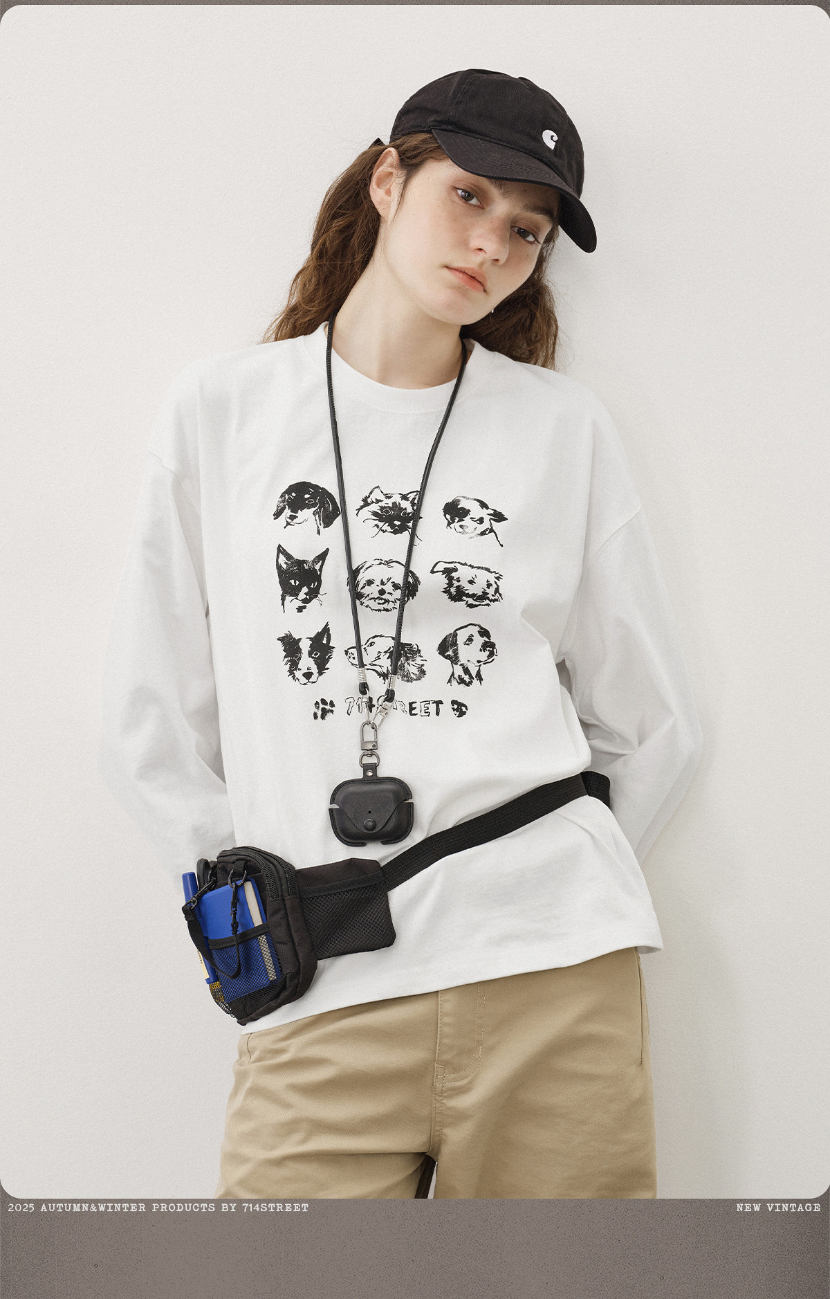 714street美式复古猫狗印花宽松长袖上衣男2025秋季纯棉情侣T恤女