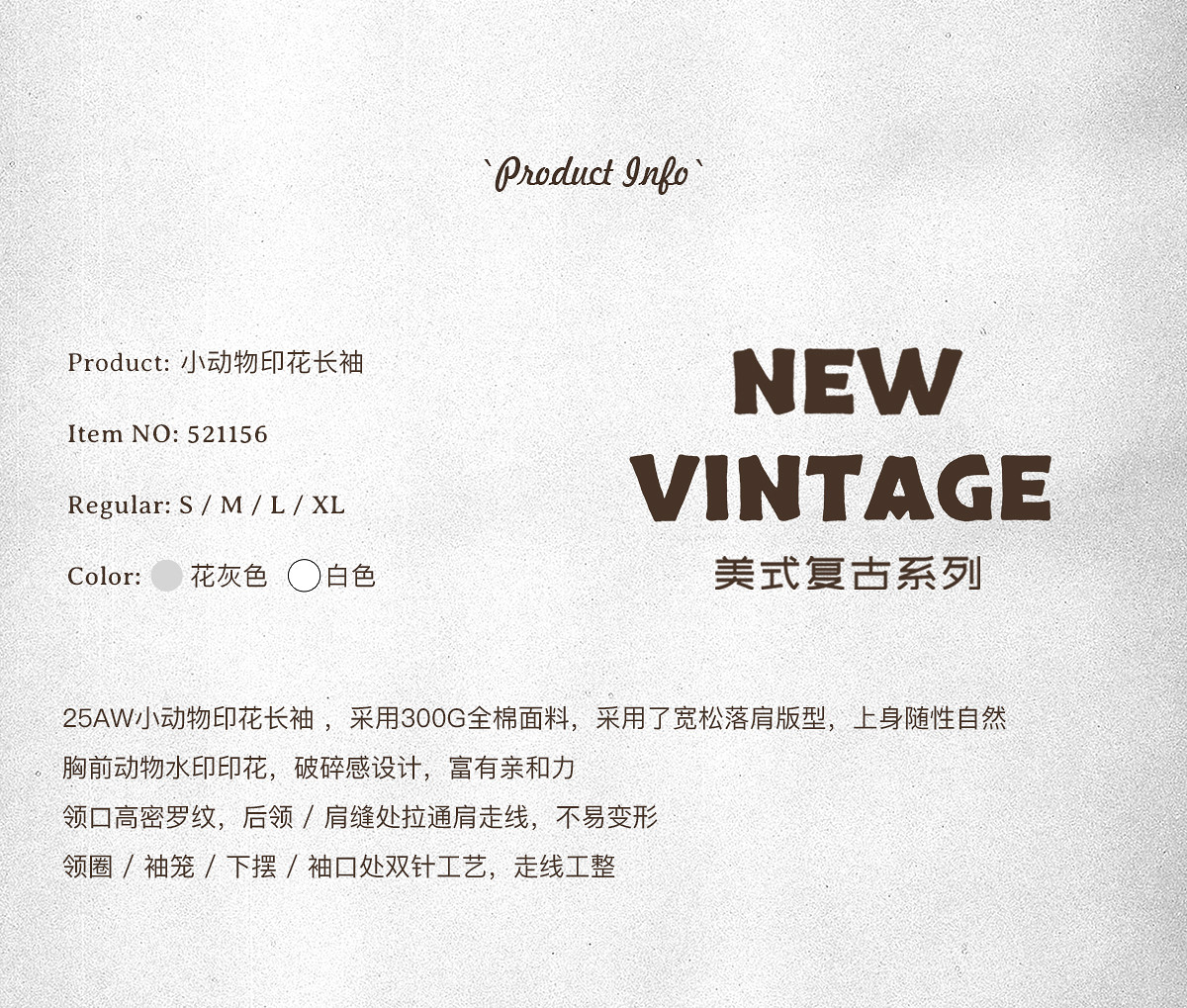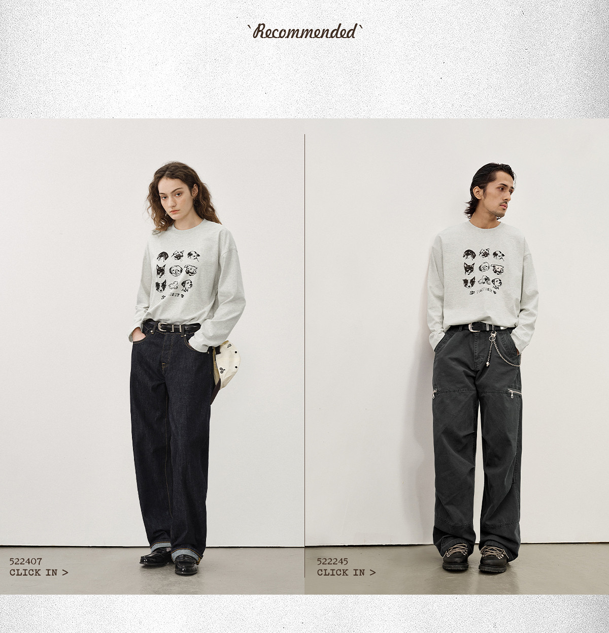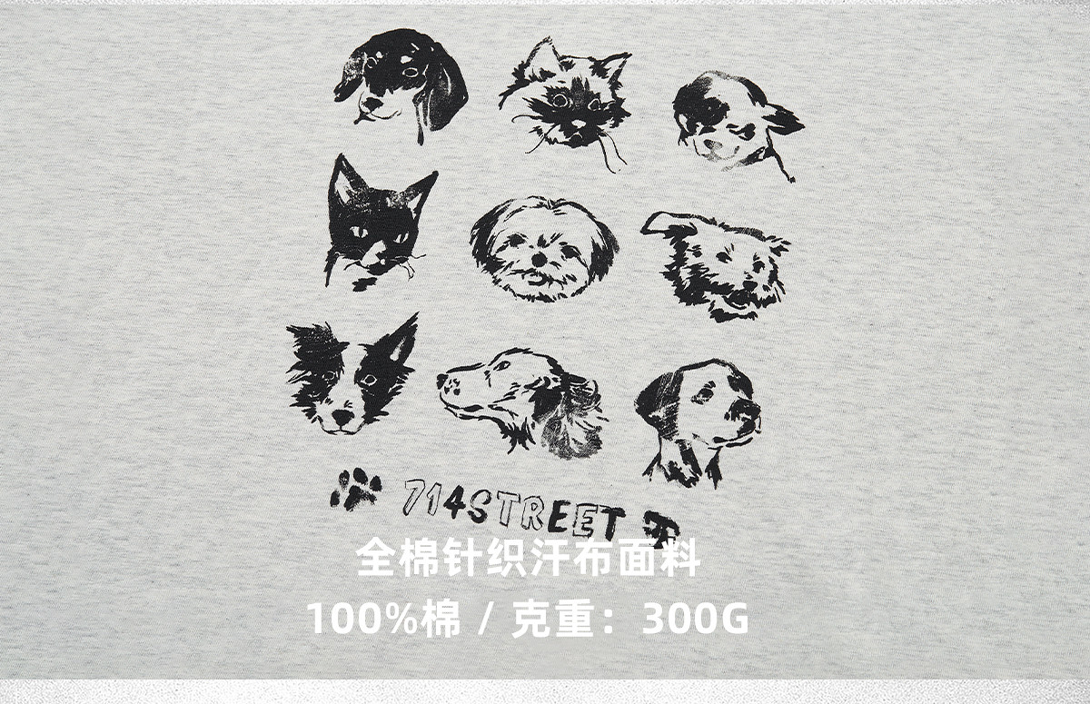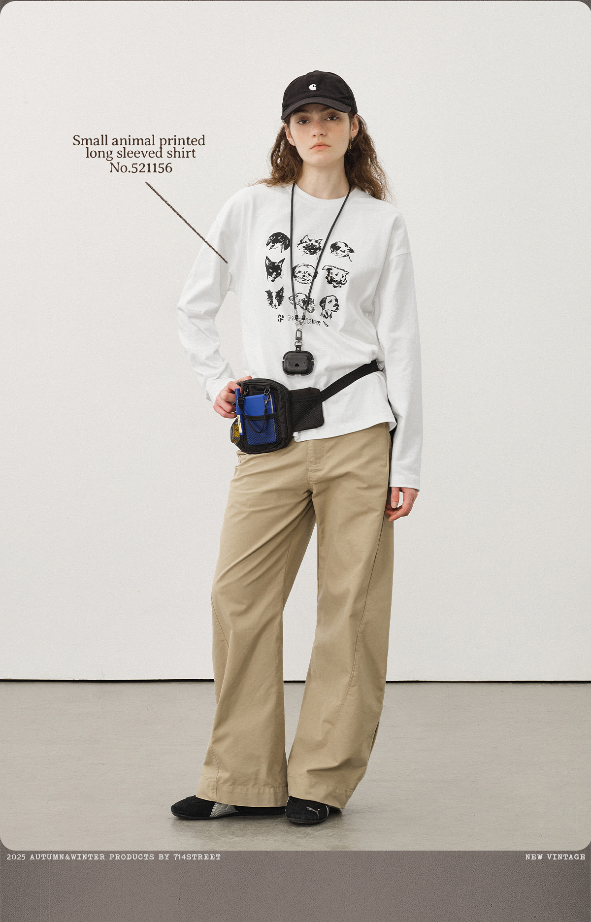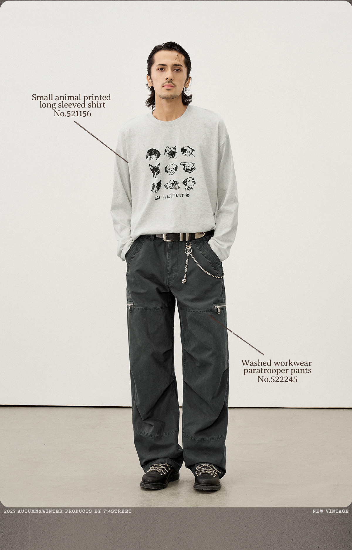 714street美式复古猫狗印花宽松长袖上衣男2025秋季纯棉情侣T恤女