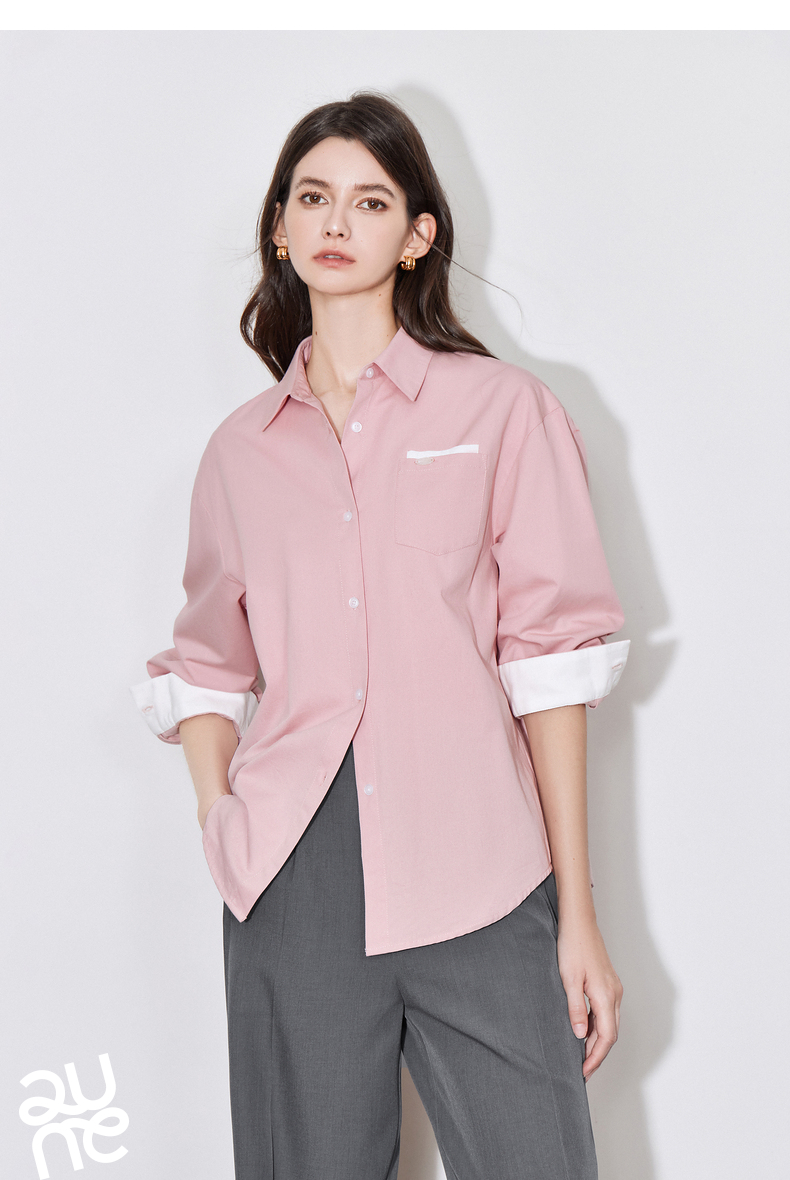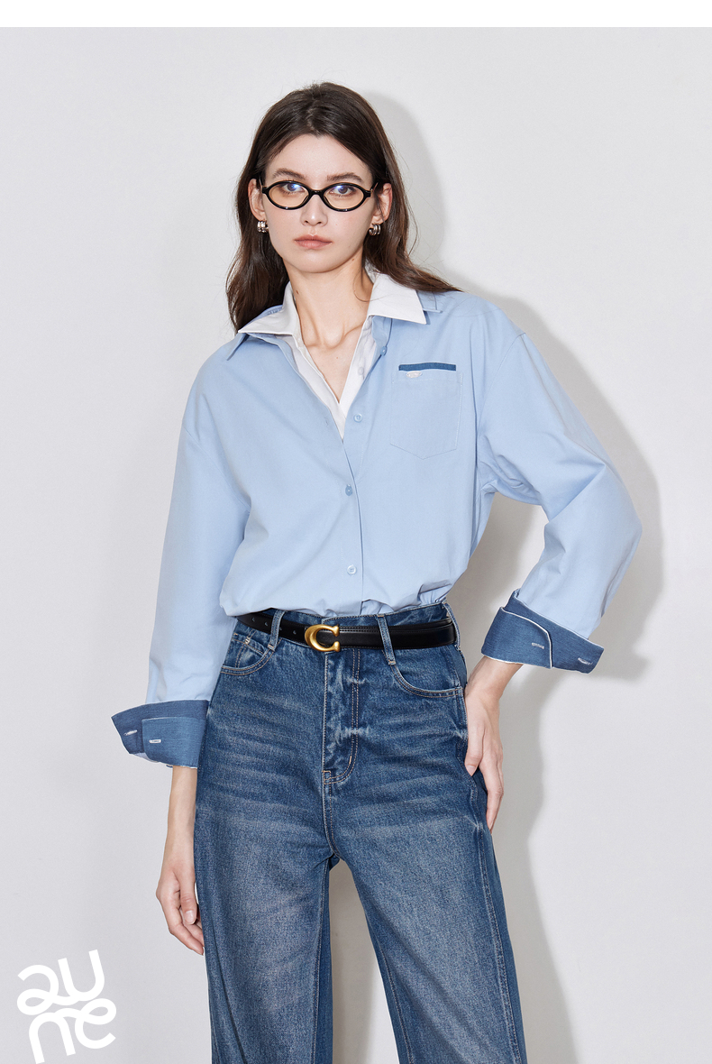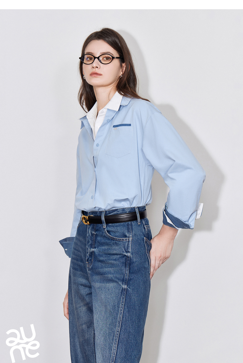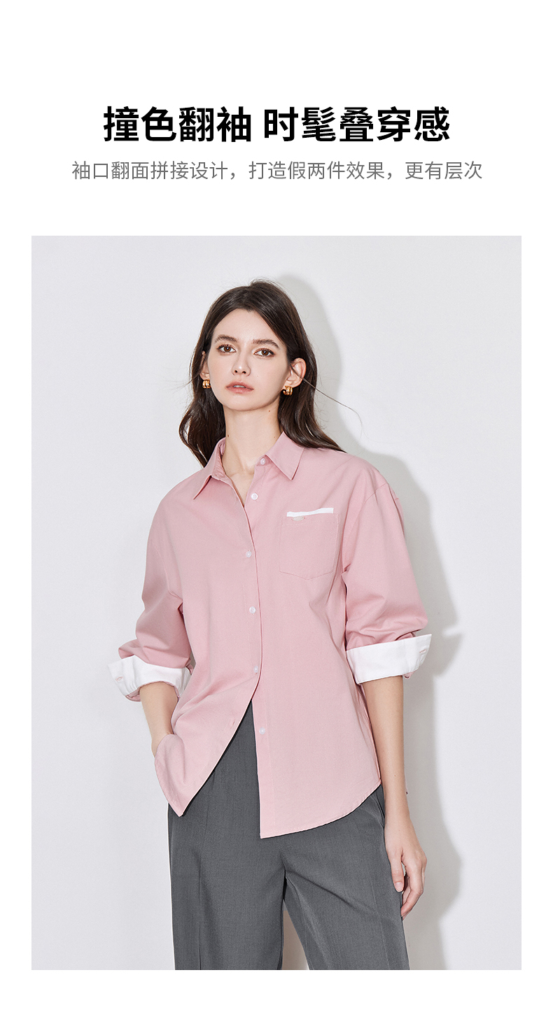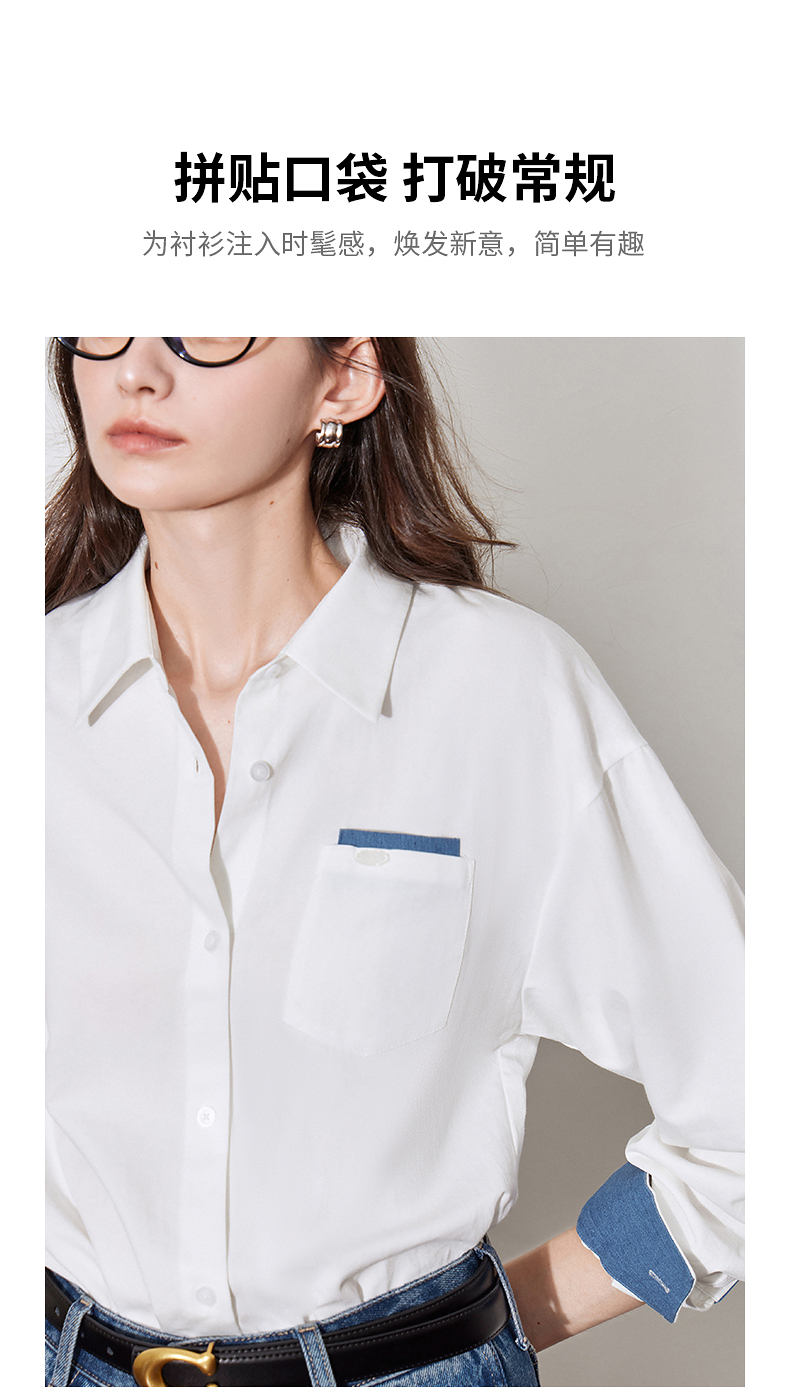 初语 别致口袋设计感衬衫女 简约休闲百搭上衣拼色长袖