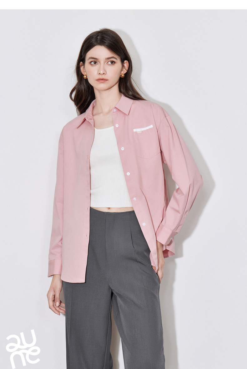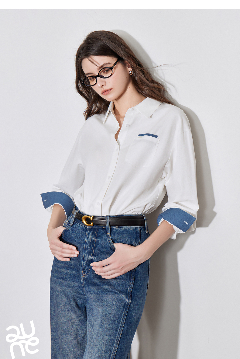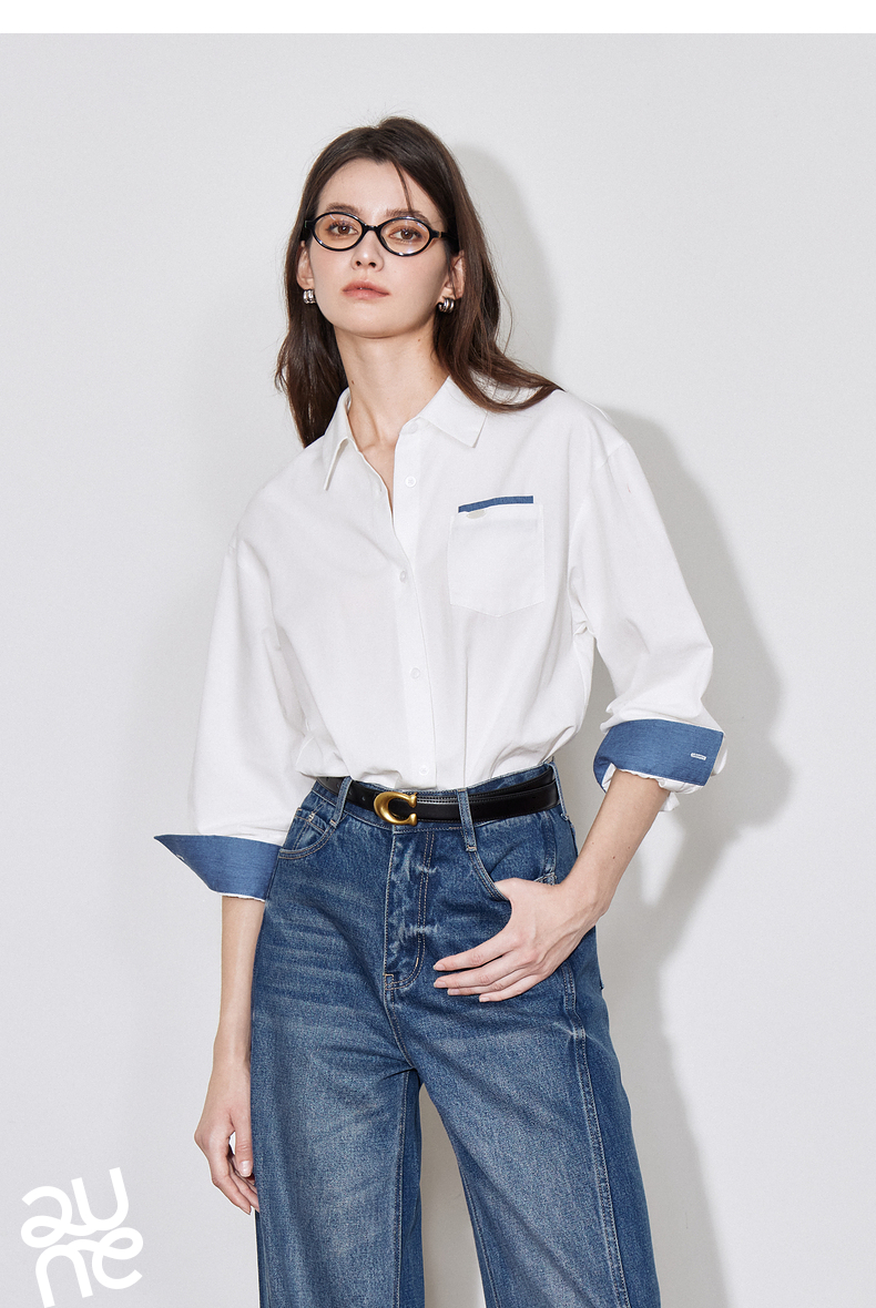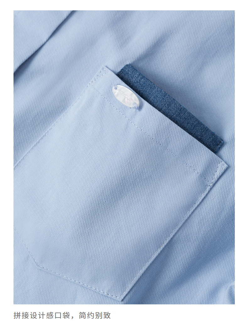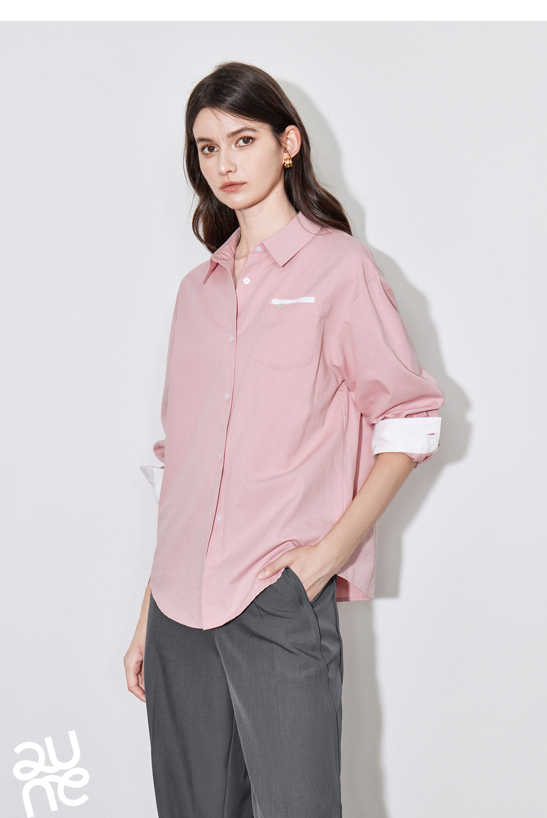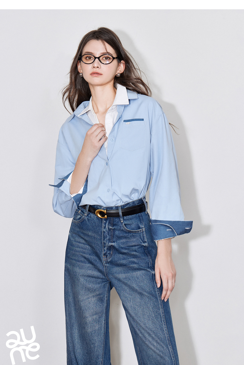 初语 别致口袋设计感衬衫女 简约休闲百搭上衣拼色长袖