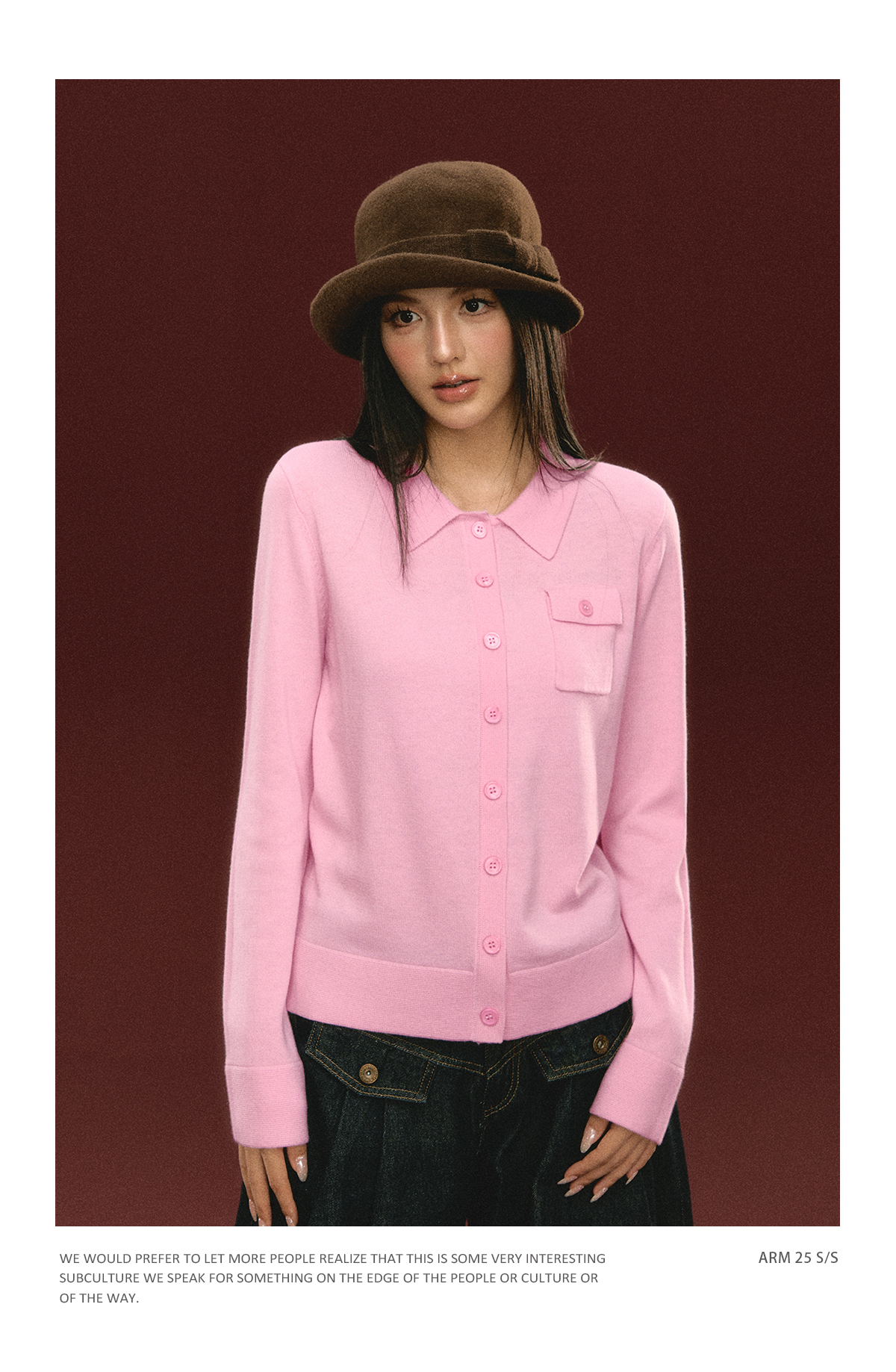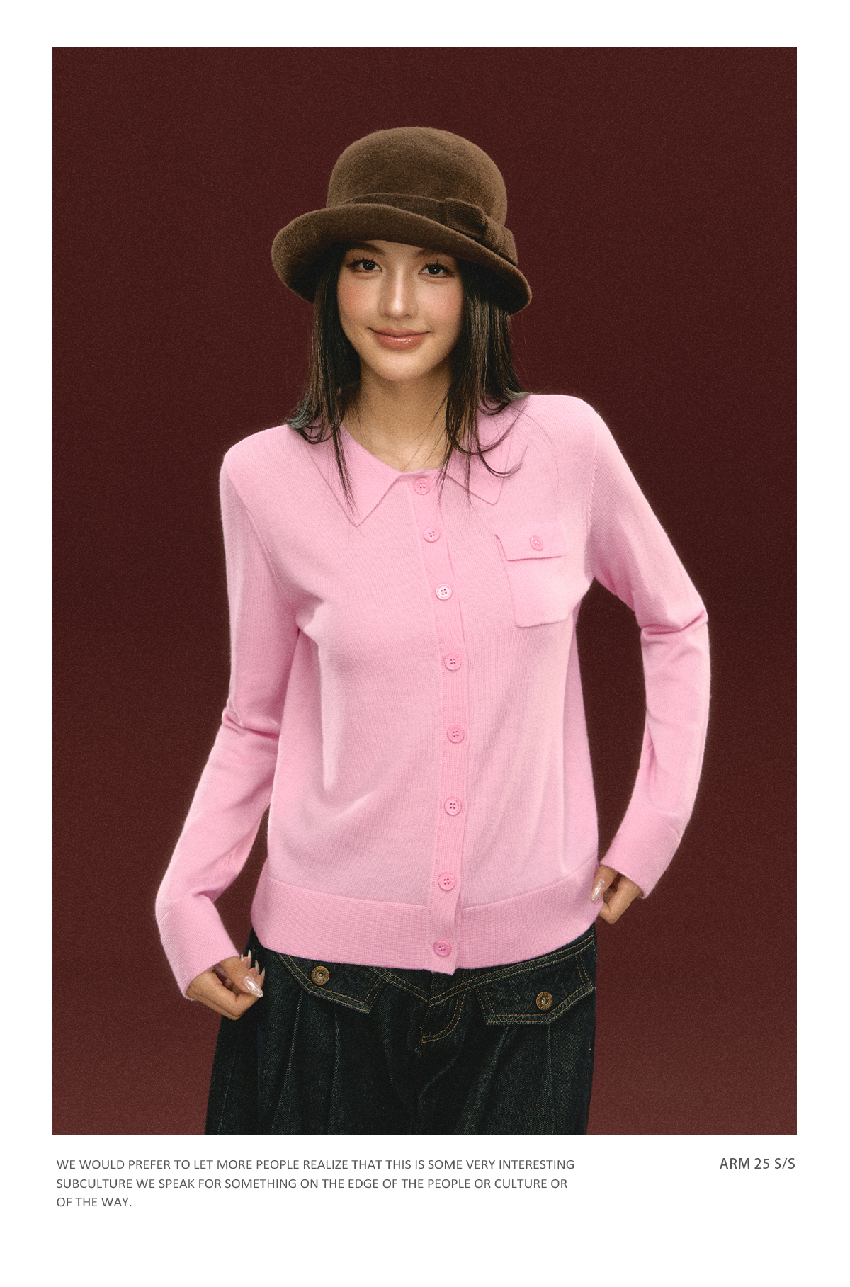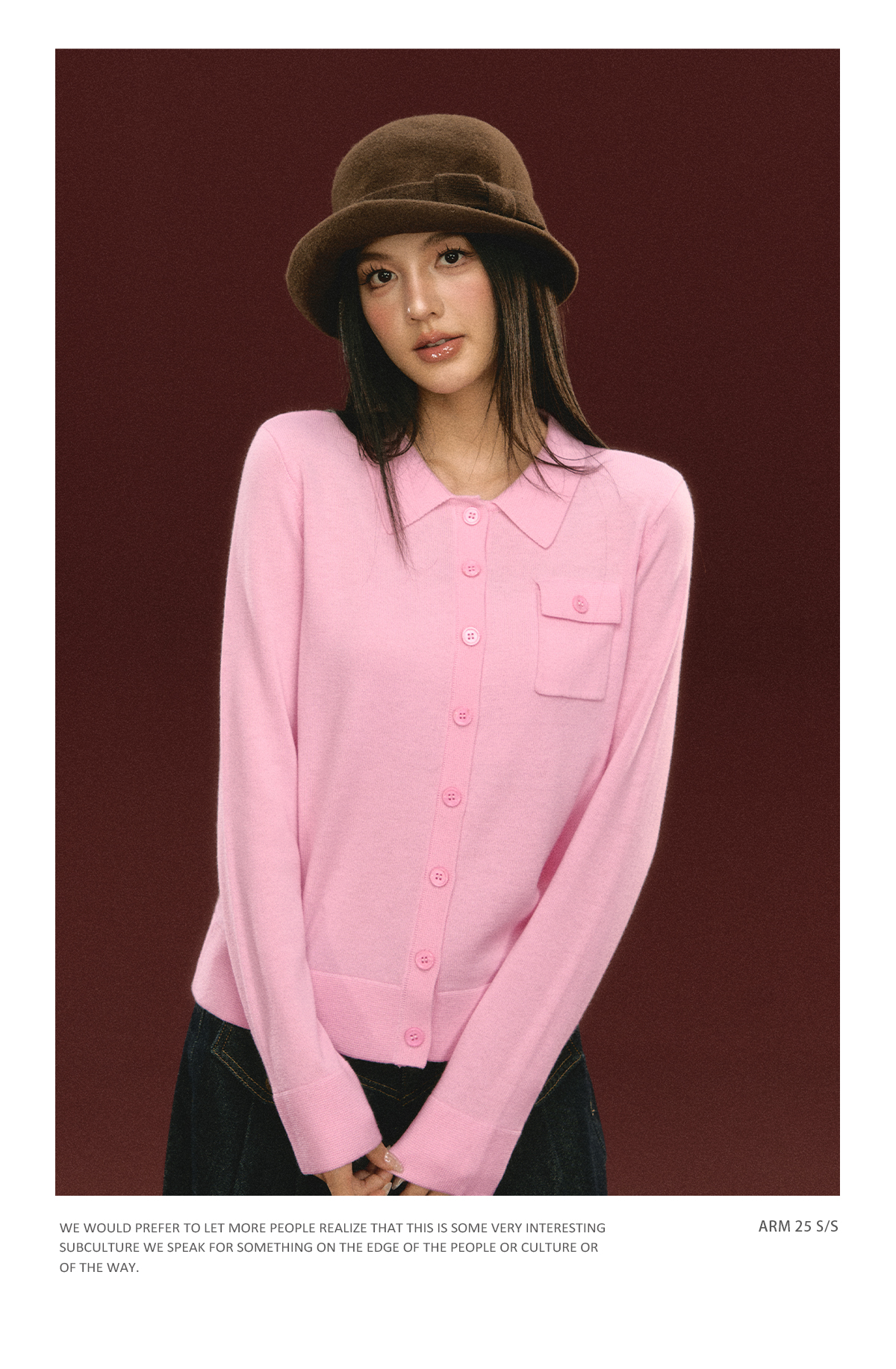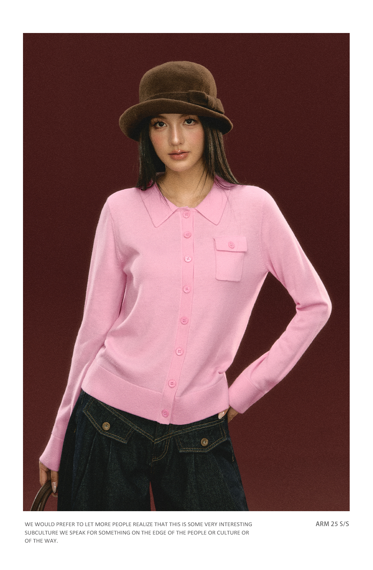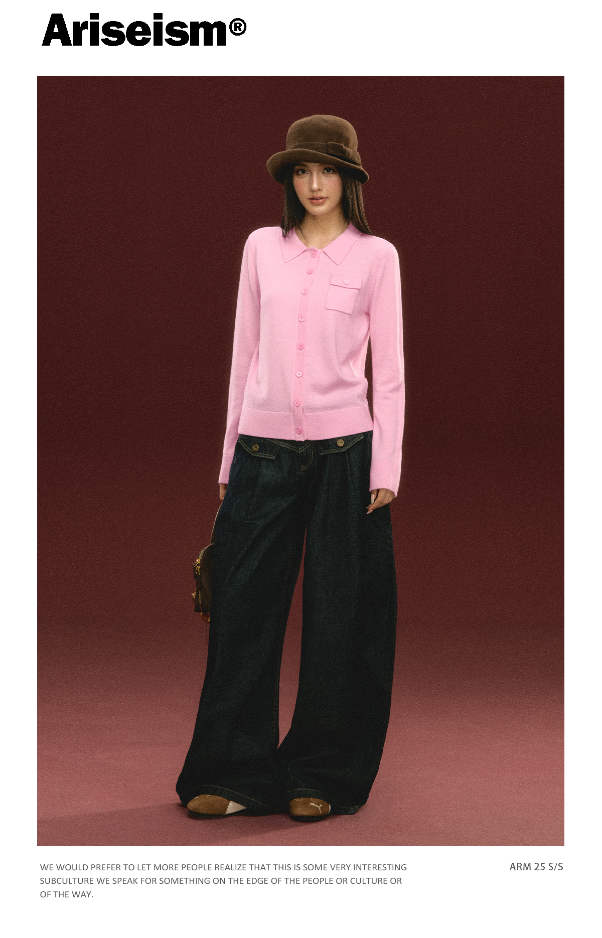 Ariseism 美式复古粉色翻领针织开衫毛衣女秋冬新款上衣