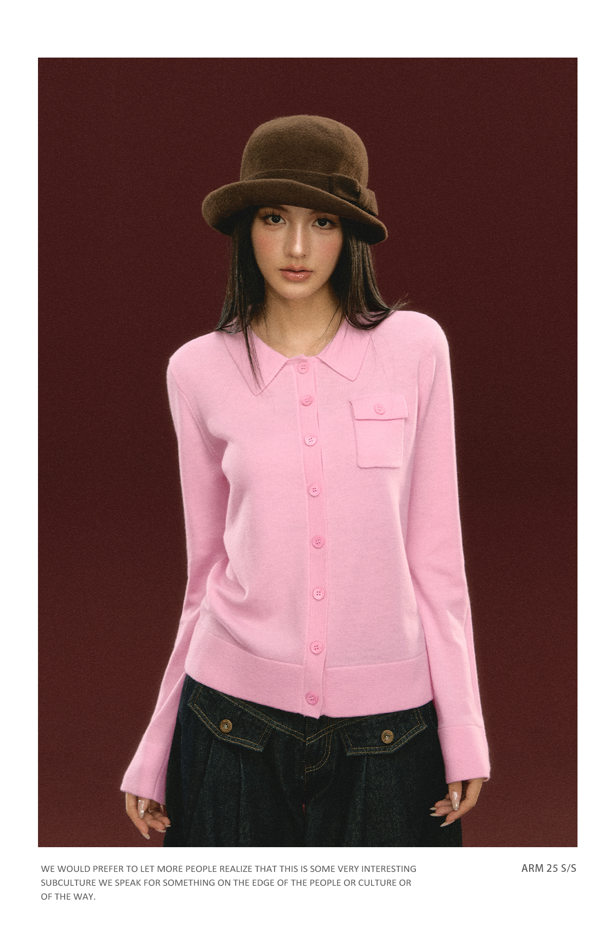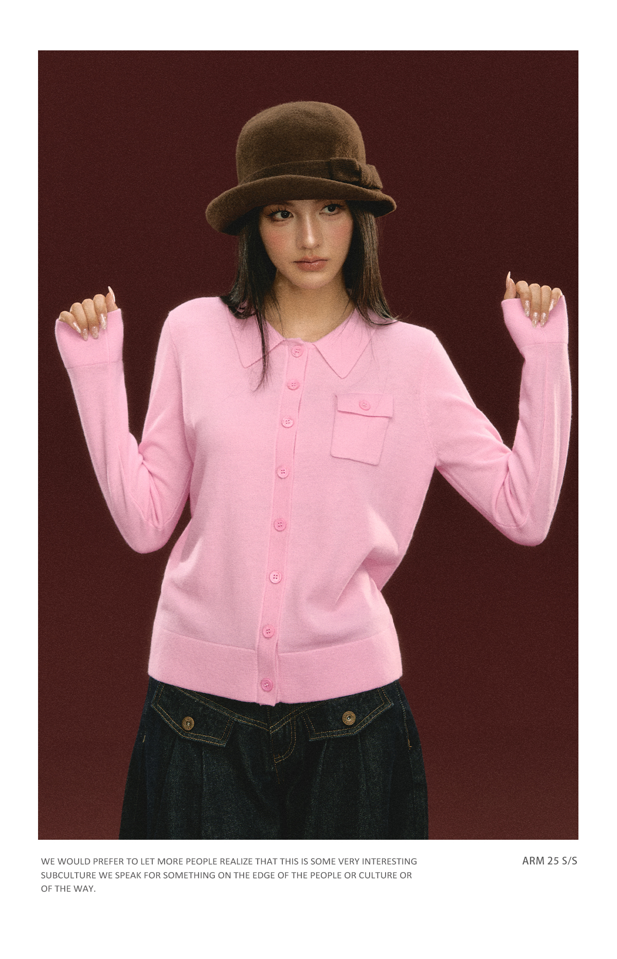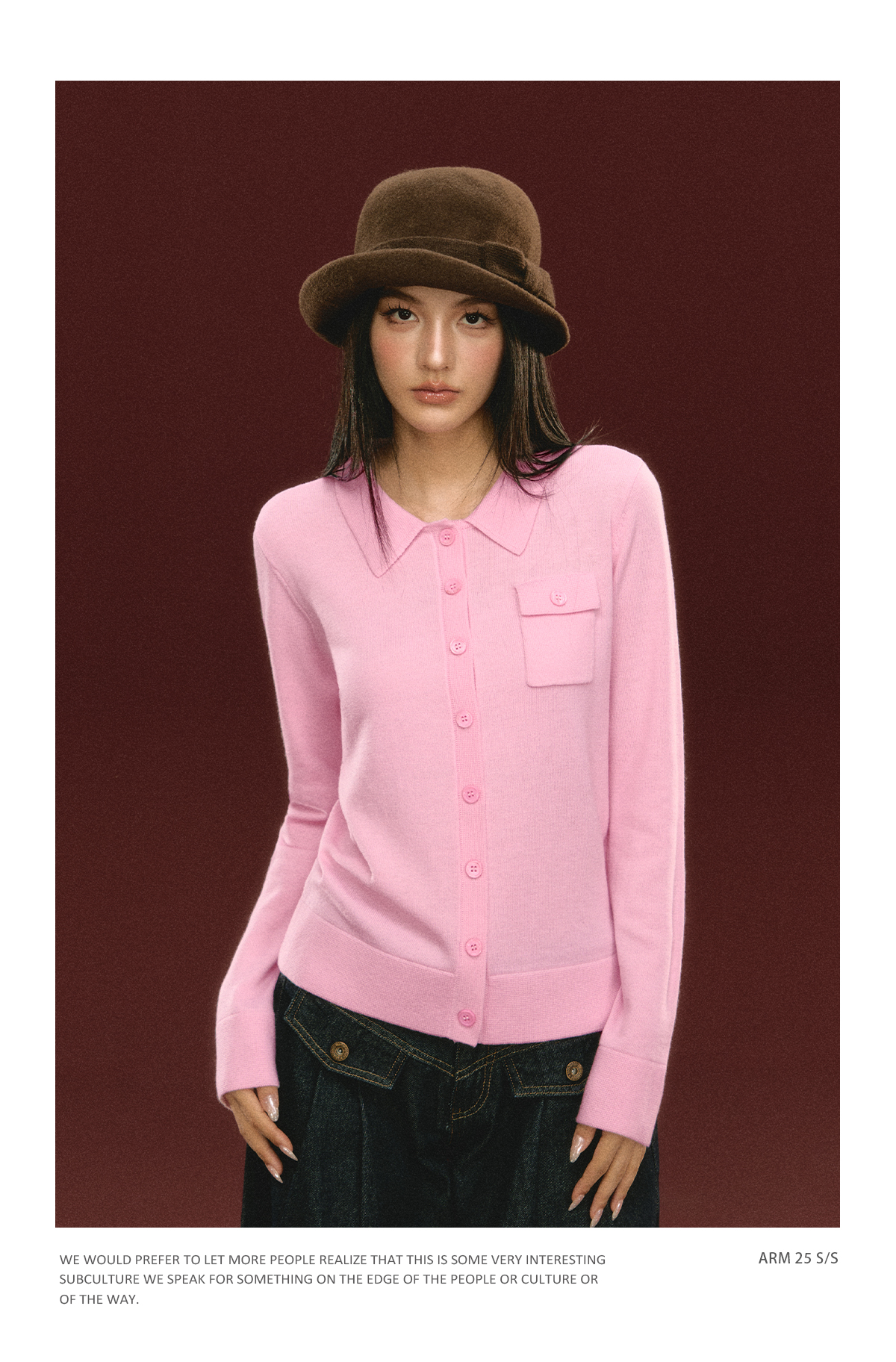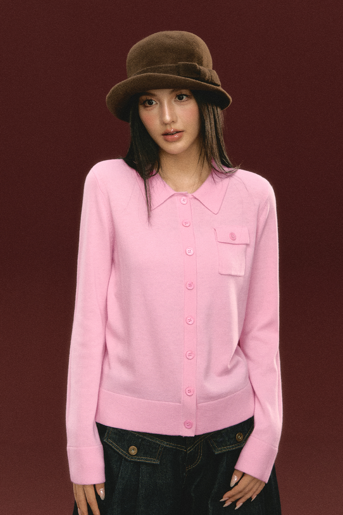 Ariseism 美式复古粉色翻领针织开衫毛衣女秋冬新款上衣