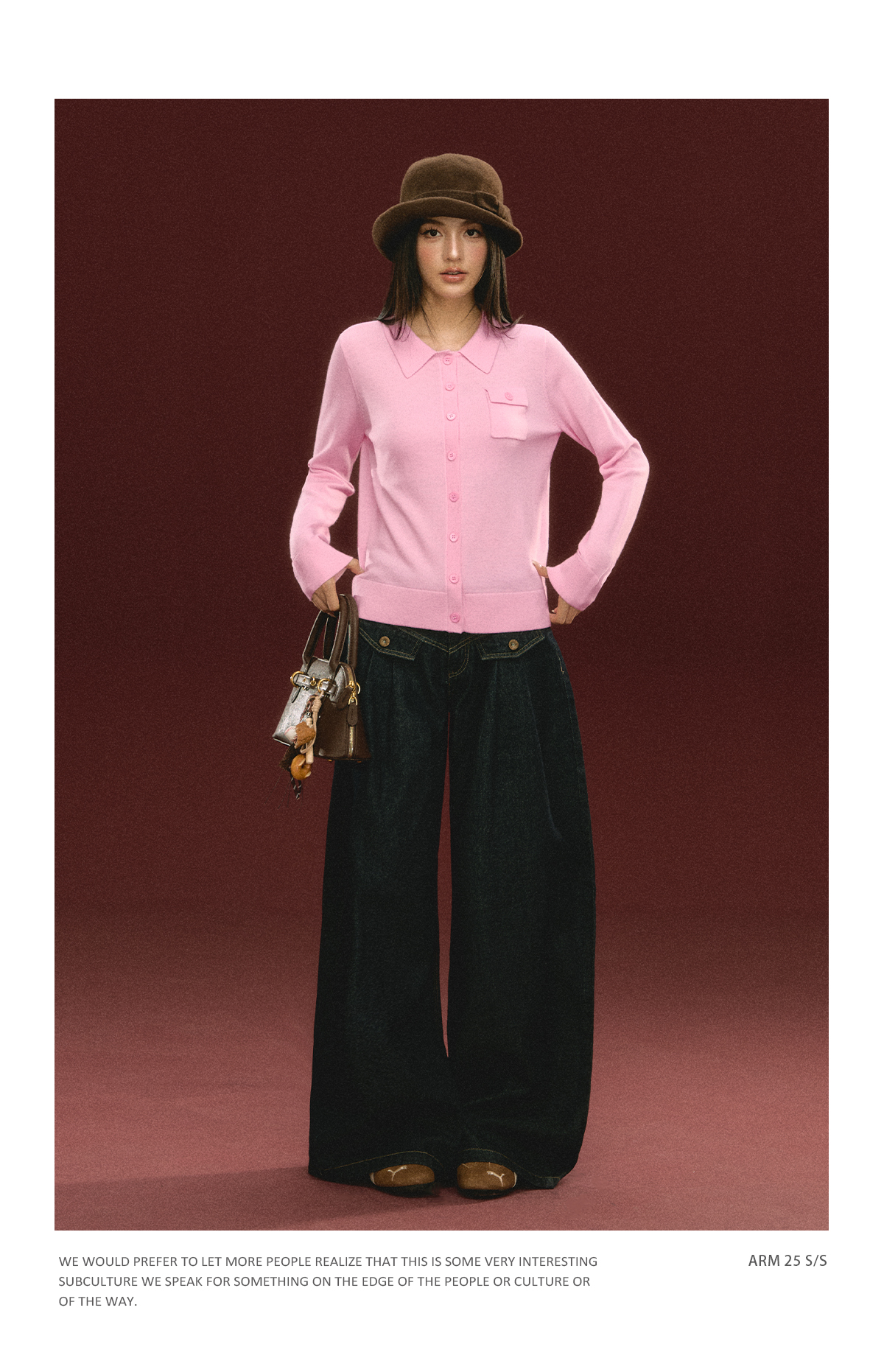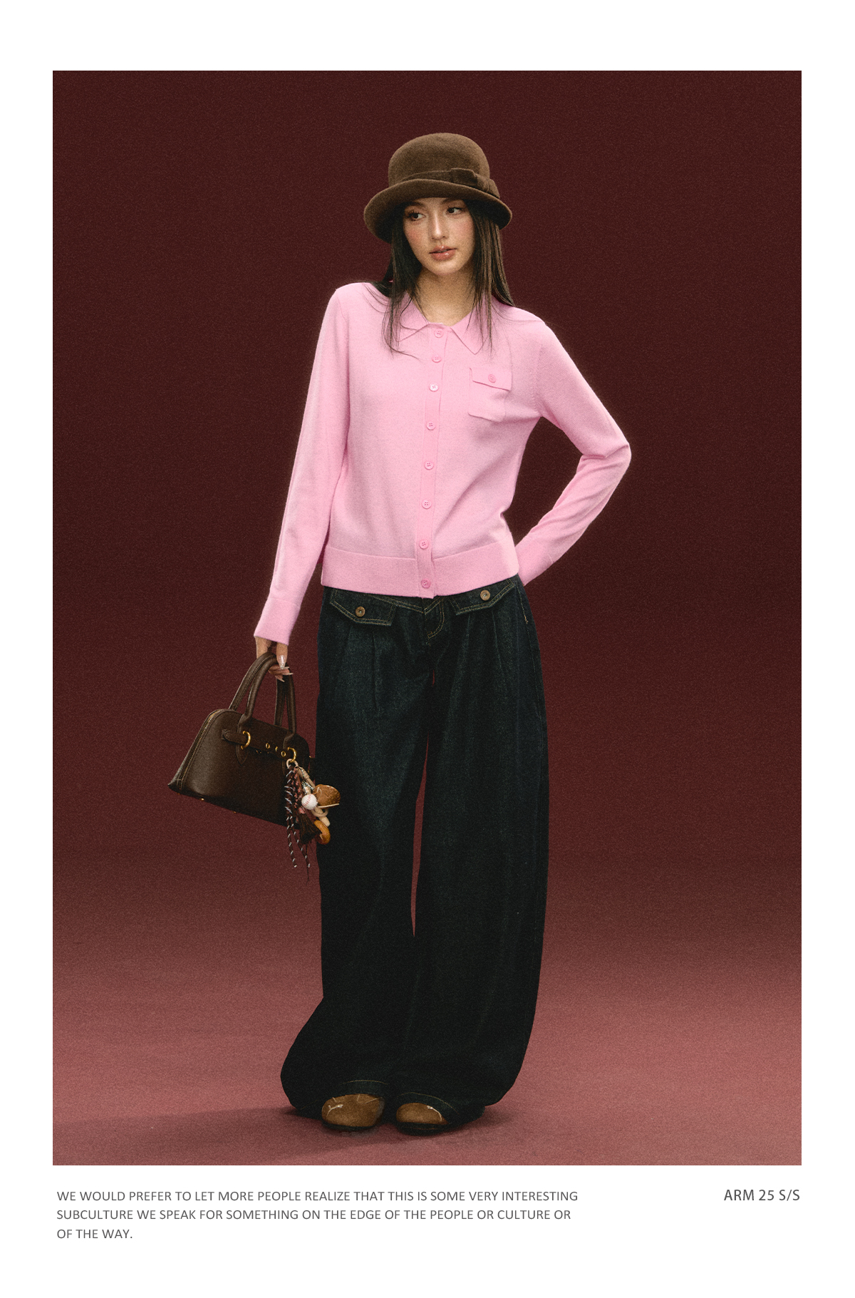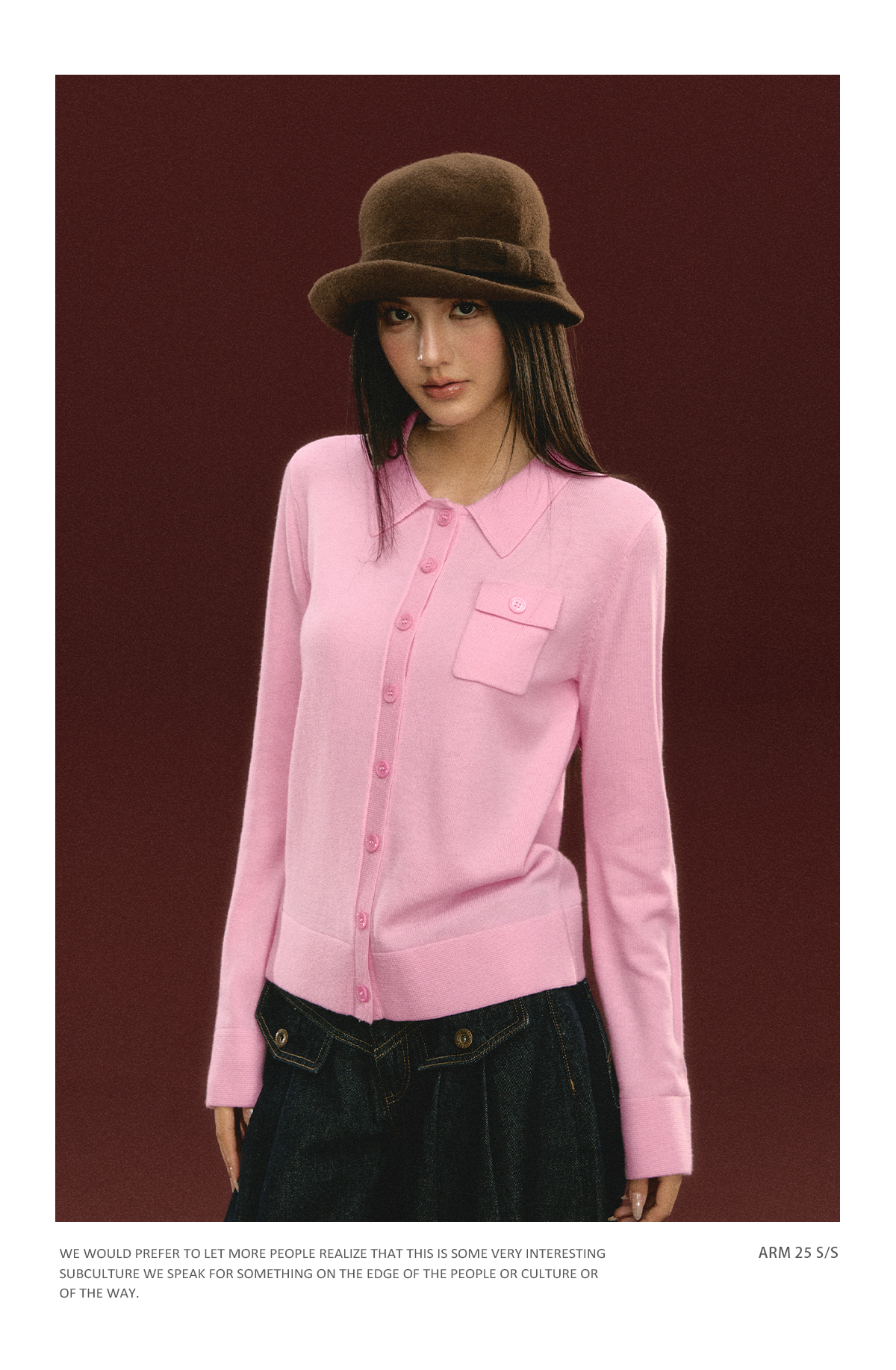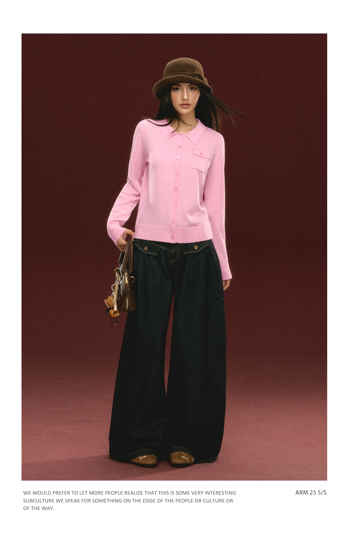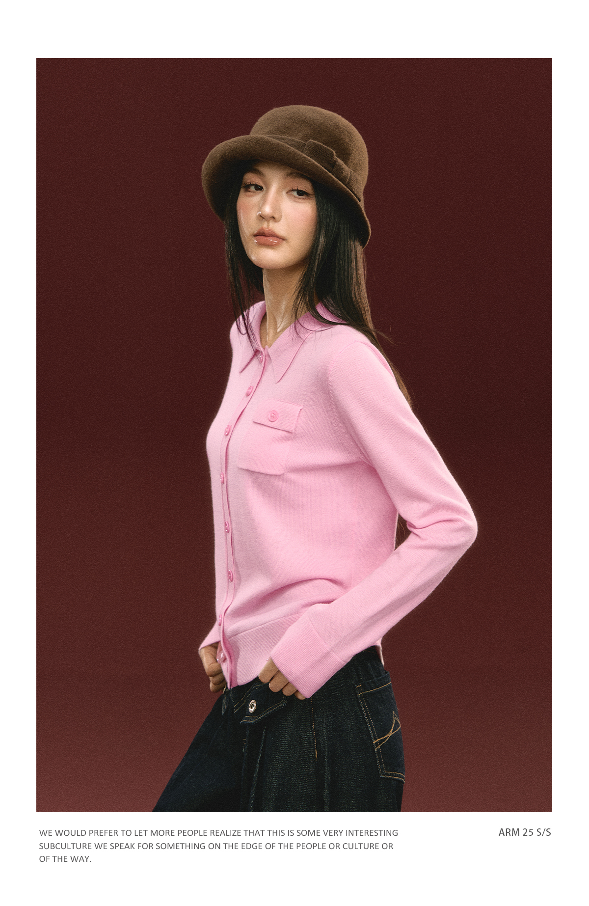 Ariseism 美式复古粉色翻领针织开衫毛衣女秋冬新款上衣