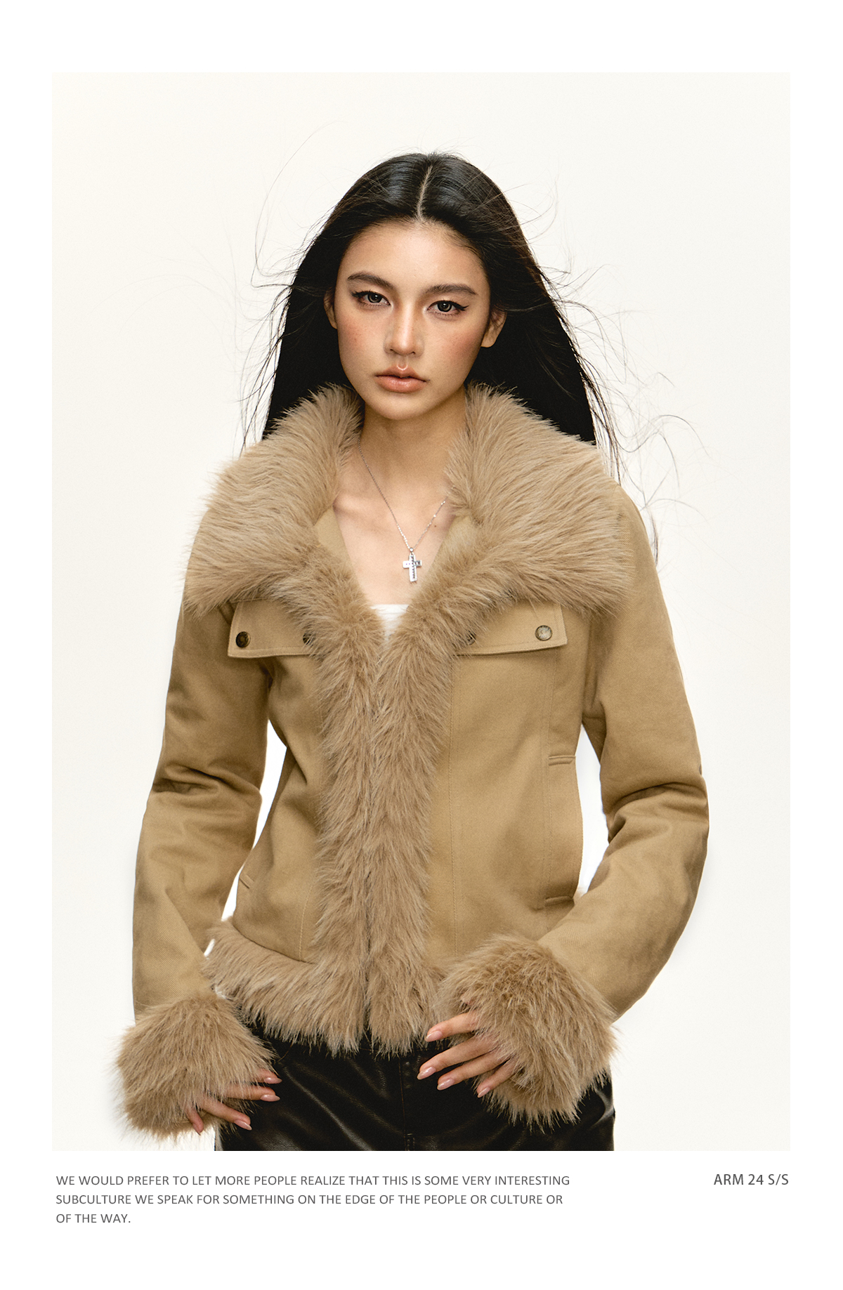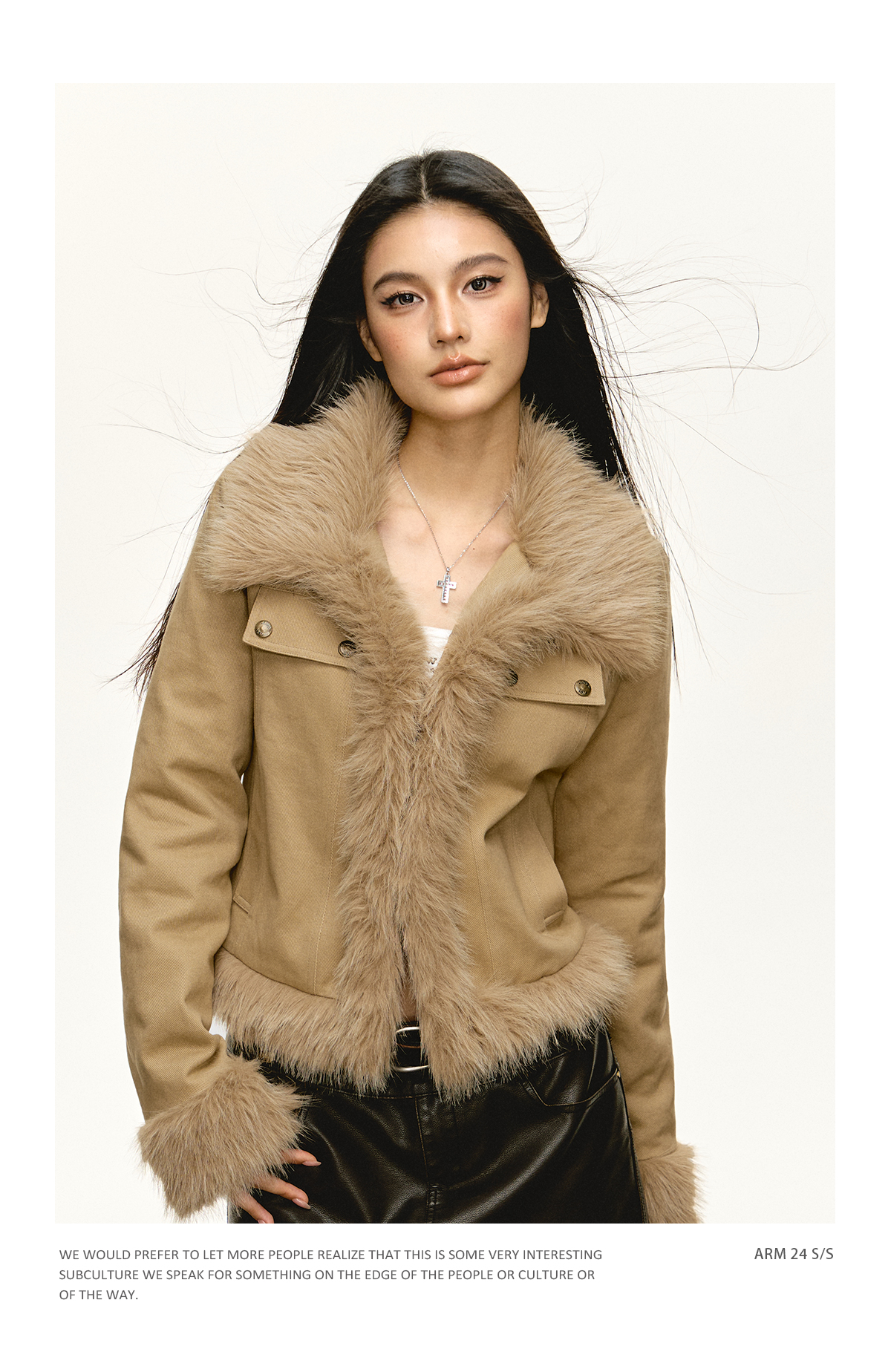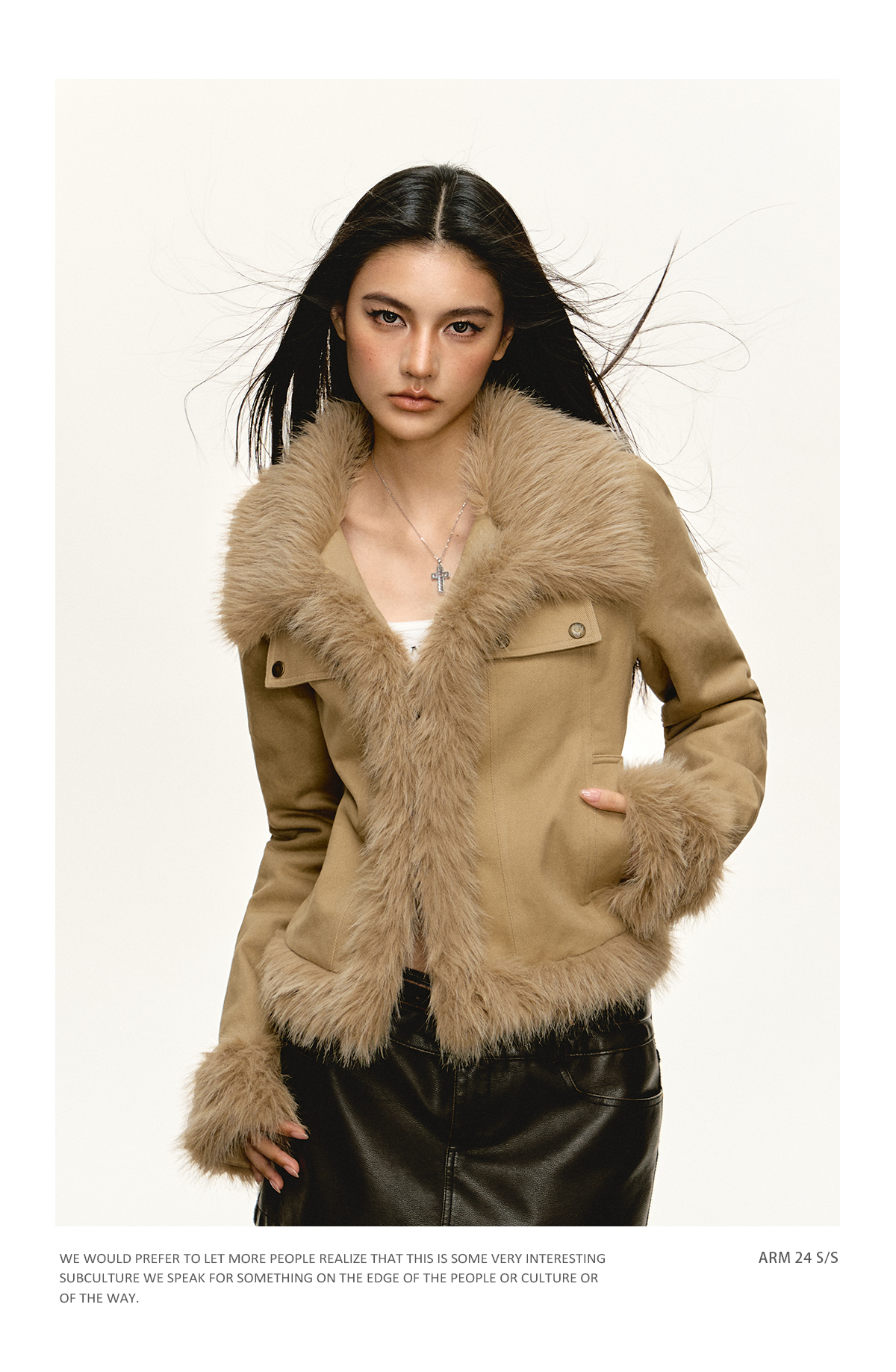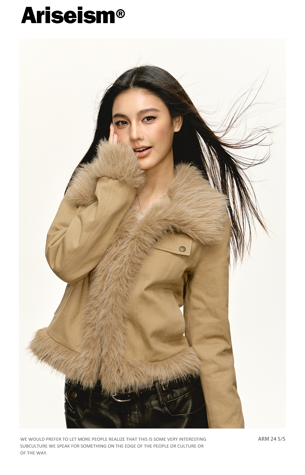 Ariseism 美式复古高级感带毛领毛毛外套女秋冬新款修身上衣