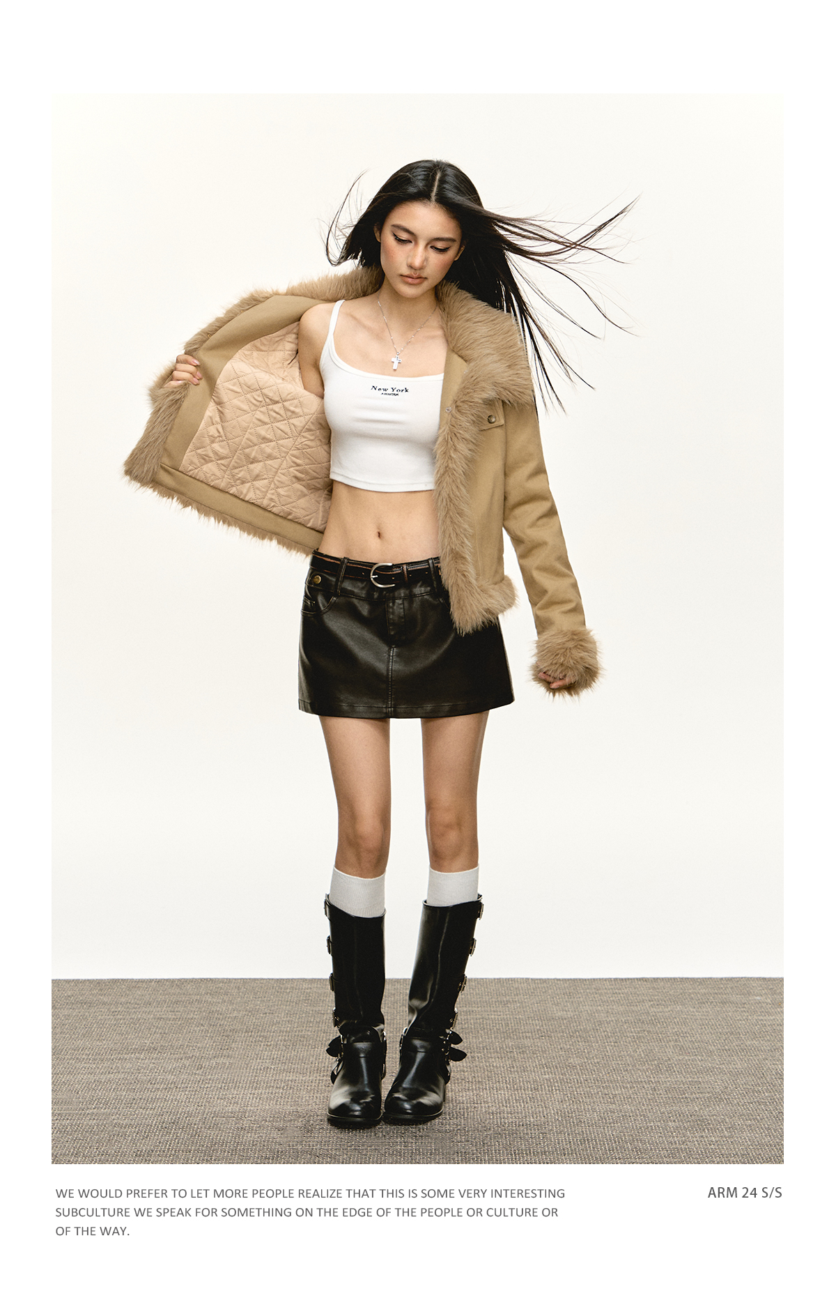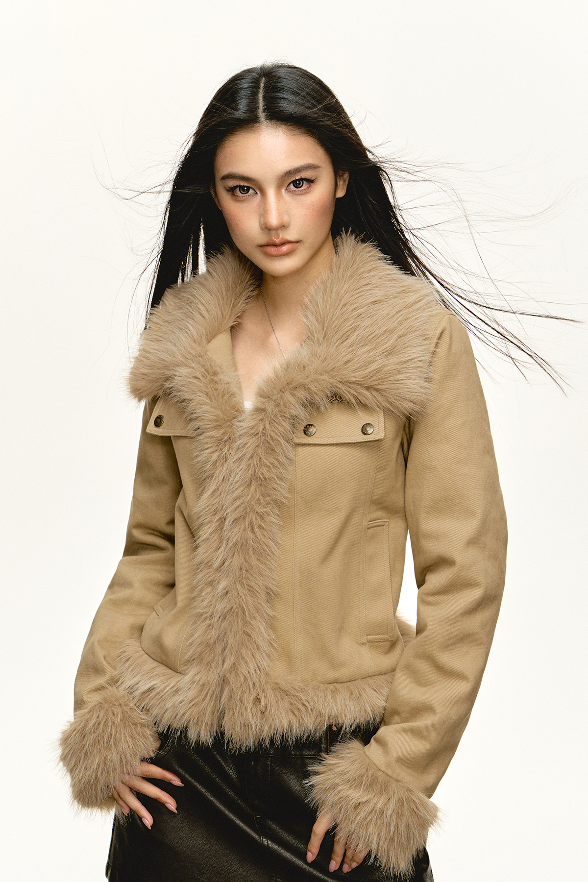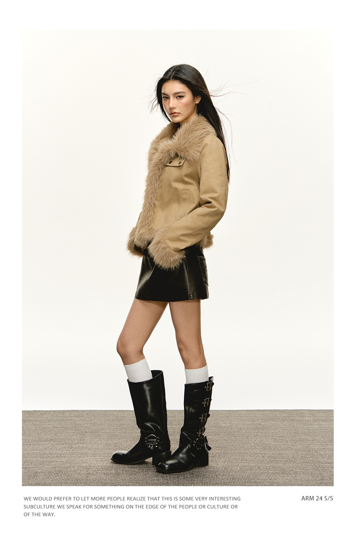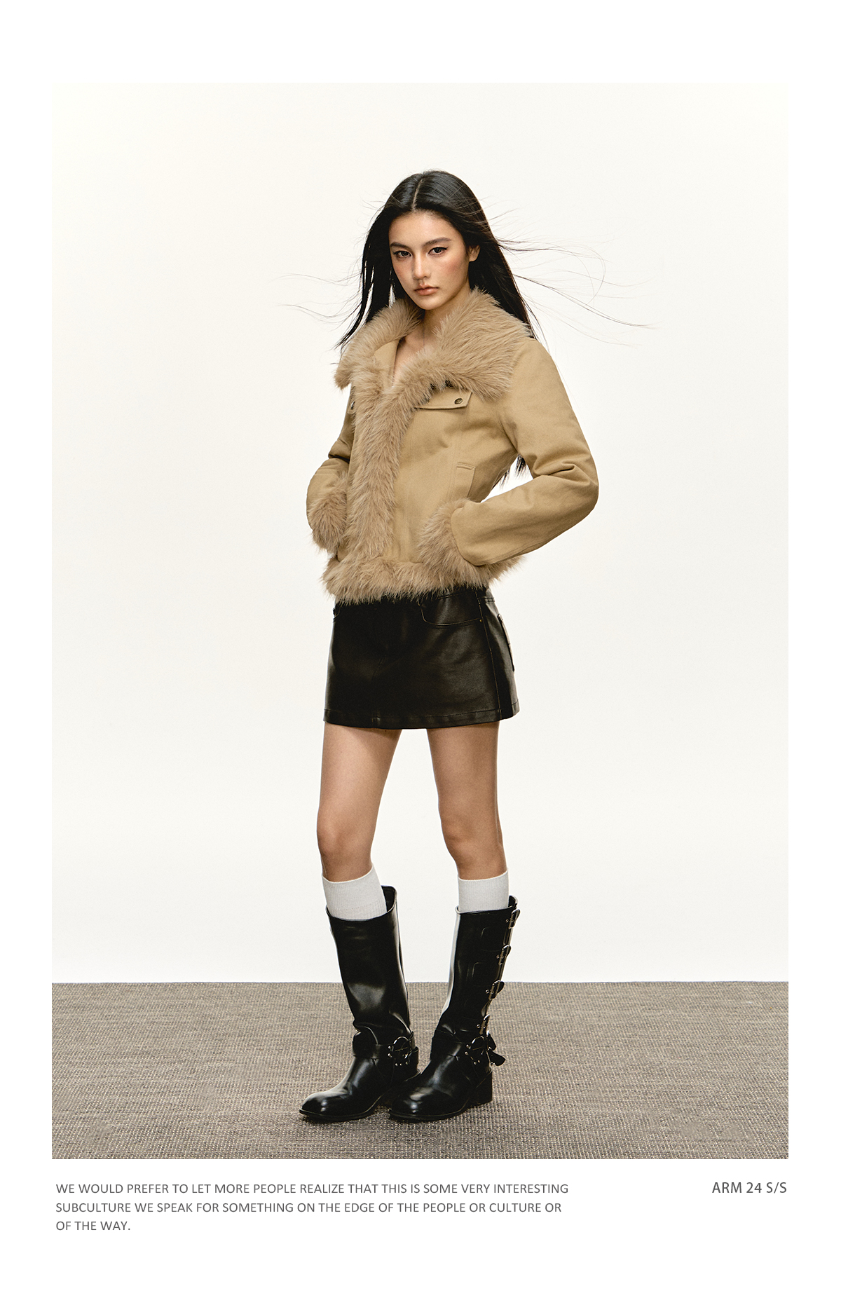 Ariseism 美式复古高级感带毛领毛毛外套女秋冬新款修身上衣